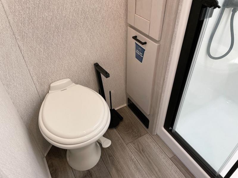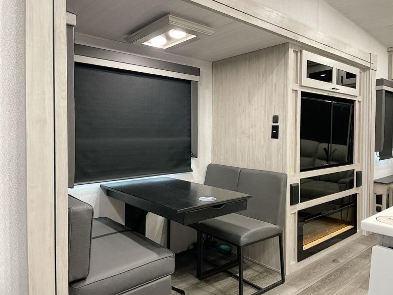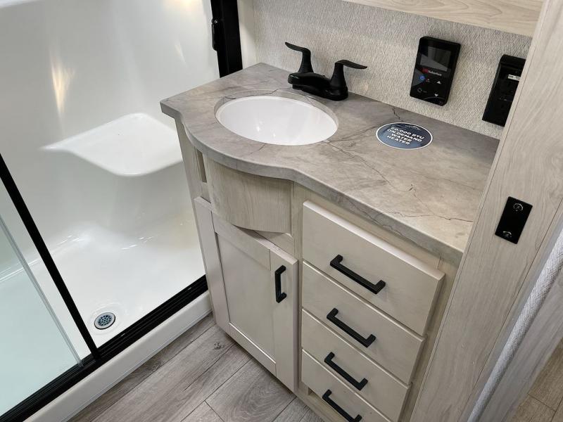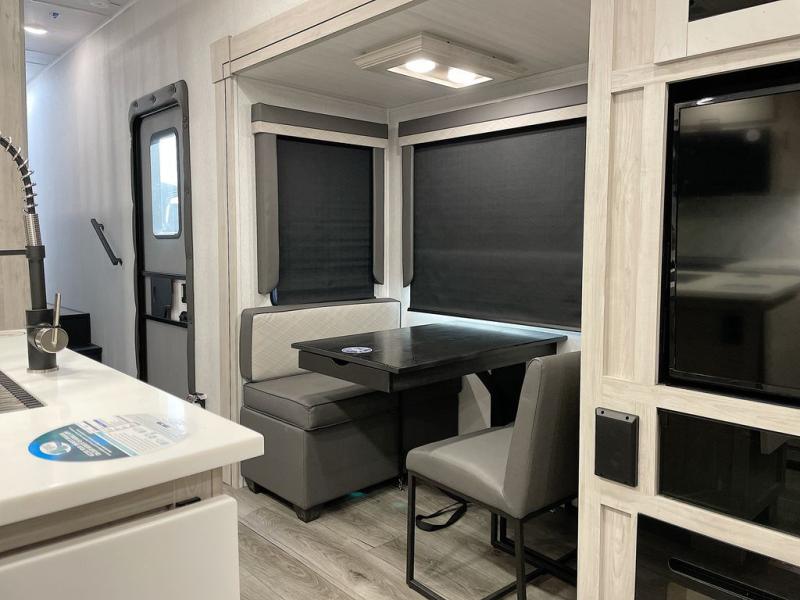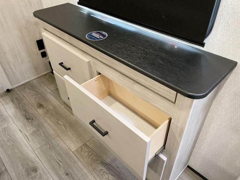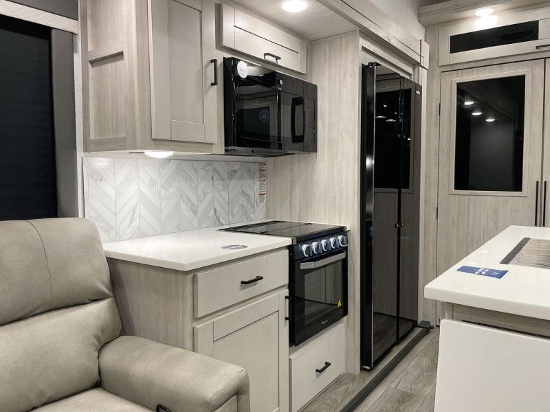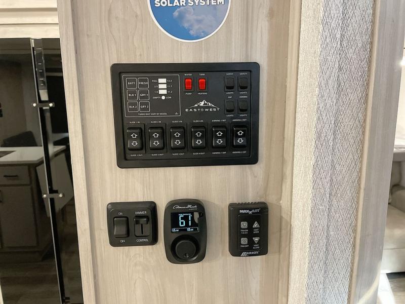 With any Blackthorn mid-profile fifth wheel by EAST TO WEST, you will find luxury amenities at every turn! There is Radiant Technology Composites insulation in the roof, front cap and underbelly, plus Azdel laminated sidewalls with block foam insulation for 4-seasons camping! You will love how easy it will be to tow your fifth wheel with Dexter axles and a MORryde CRE 3000 suspension, and the electric automatic leveling system means you can set up camp in no-time! The exterior also includes an adjustable power awning with LED lights, LED motion sensor lights in the pass-through storage, and a universal all-in-one docking station to easily manage your units tank levels and functions. Head inside to find vinyl flooring, solid wood shaker style cabinet doors with hidden hinges, a seamless fiberglass shower, and many more elegant features!