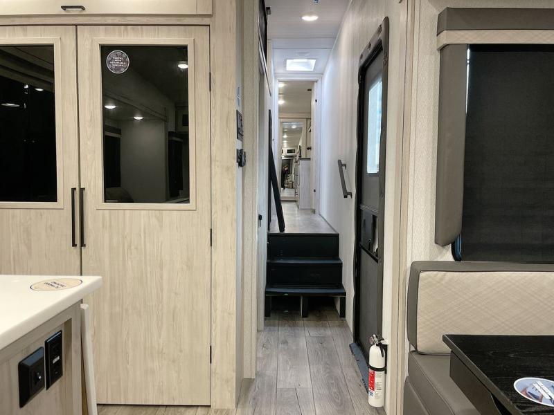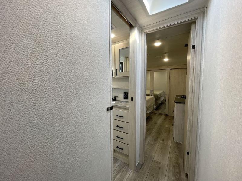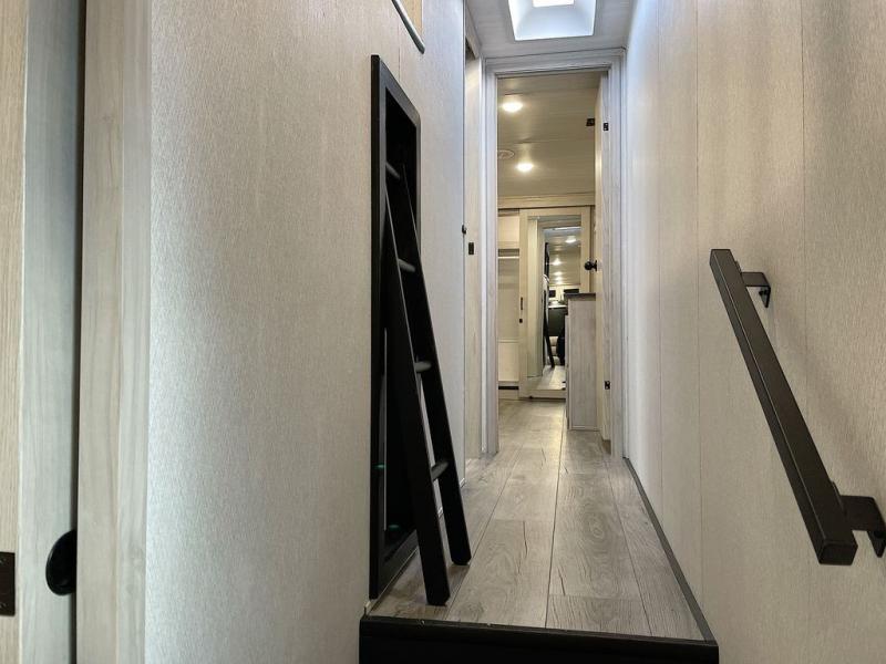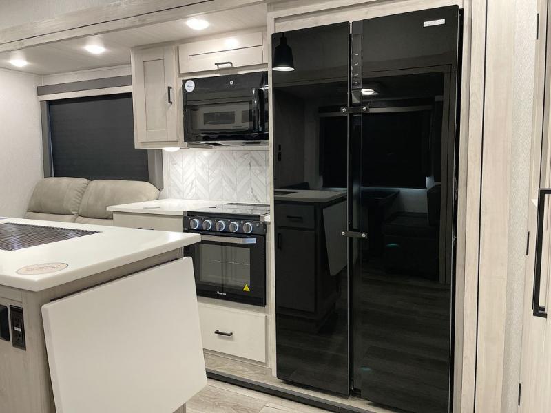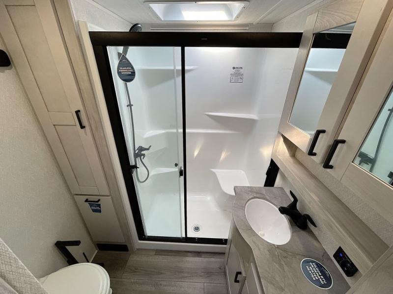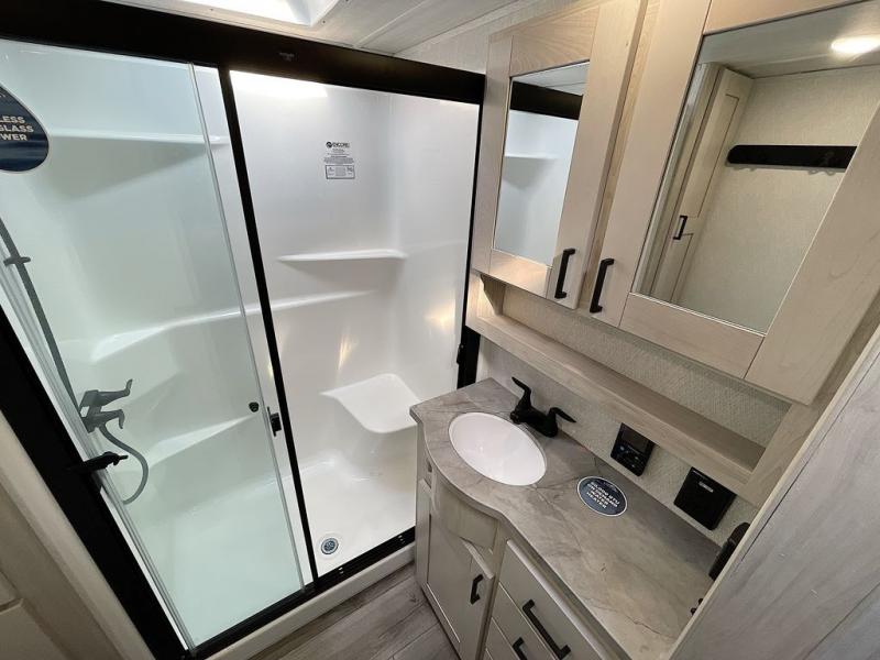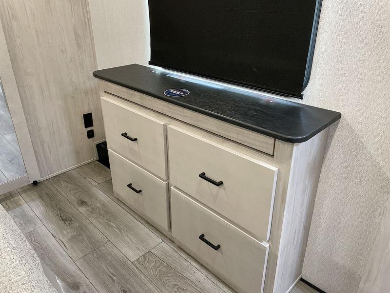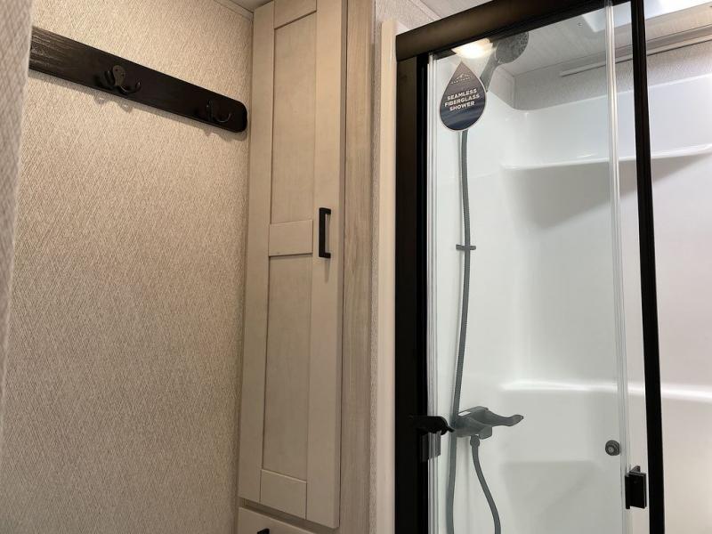 With any Blackthorn mid-profile fifth wheel by EAST TO WEST, you will find luxury amenities at every turn! There is Radiant Technology Composites insulation in the roof, front cap and underbelly, plus Azdel laminated sidewalls with block foam insulation for 4-seasons camping! You will love how easy it will be to tow your fifth wheel with Dexter axles and a MORryde CRE 3000 suspension, and the electric automatic leveling system means you can set up camp in no-time! The exterior also includes an adjustable power awning with LED lights, LED motion sensor lights in the pass-through storage, and a universal all-in-one docking station to easily manage your units tank levels and functions. Head inside to find vinyl flooring, solid wood shaker style cabinet doors with hidden hinges, a seamless fiberglass shower, and many more elegant features!