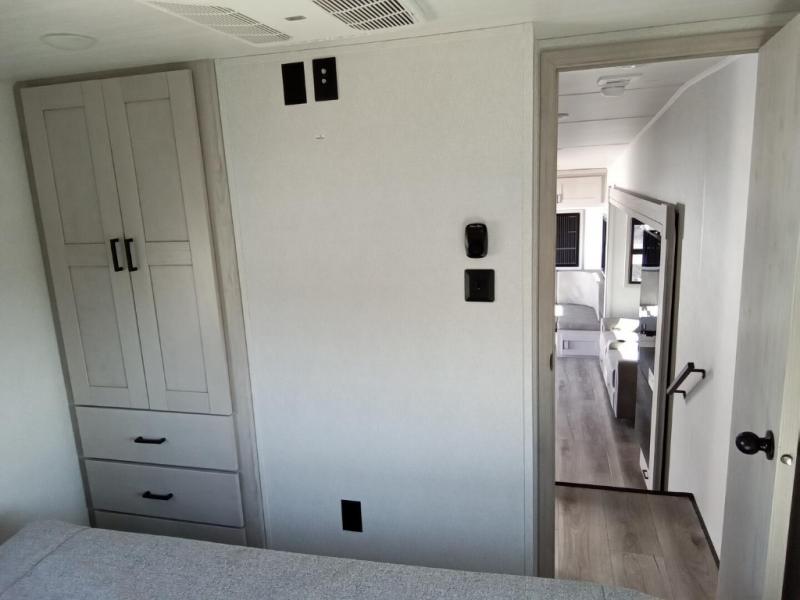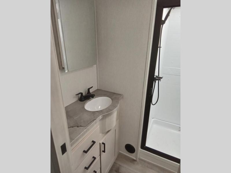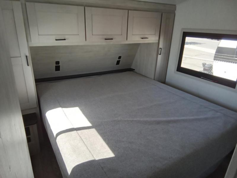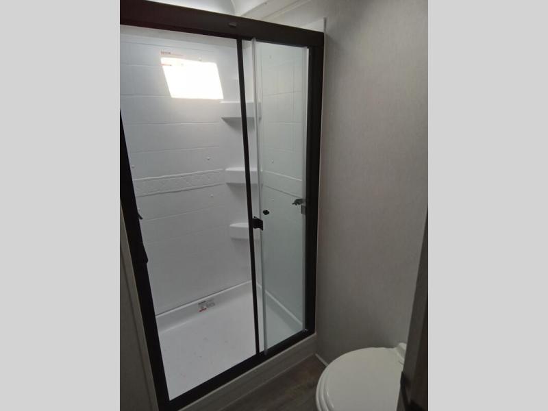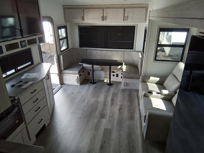 Camping trips in this spacious fifth wheel will be trips well spent! You will have a rear U-shaped dinette with overhead cabinets to store belongings, plus 78" theater seating across from the entertainment center. This will be the perfect place to enjoy movie nights together, or you can head outdoors to relax under the 20' power awning with LED lights. The sliding doors leading into the full bath and front bedroom will help save on space, and the king bed in the bedroom will have you feel right at home. There is also TV prep here if you want to watch shows in bed!