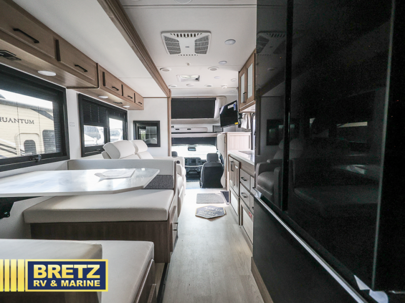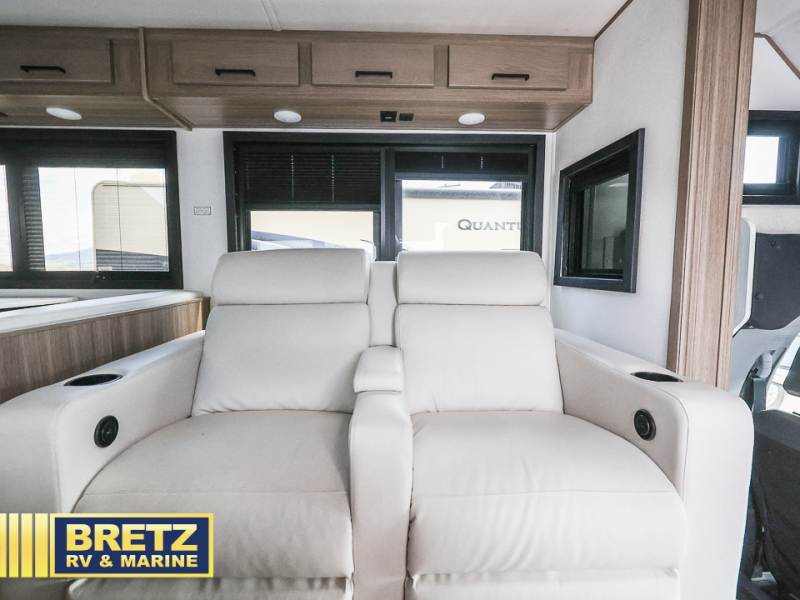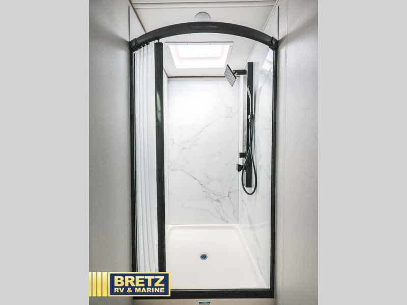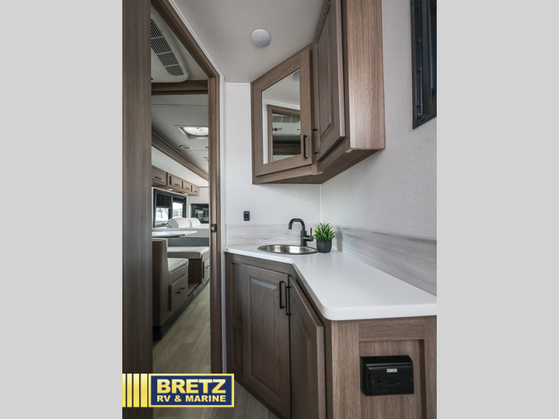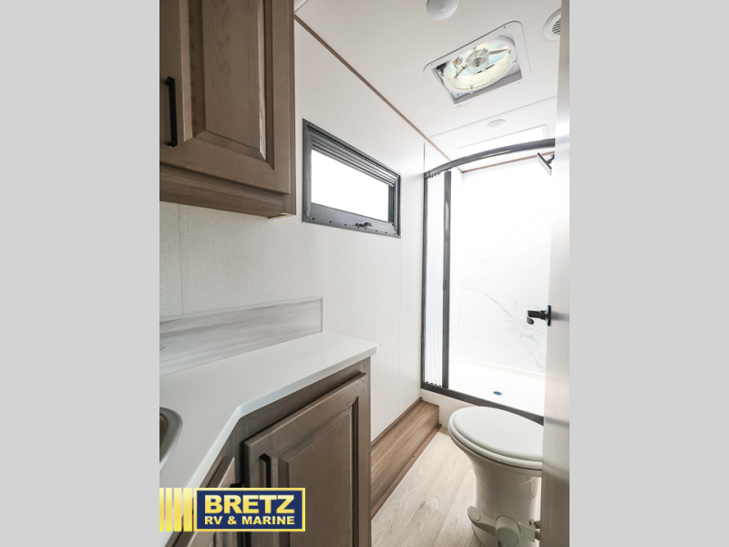 Traveling in this coach is sure to bring great memories! Once you arrive at your destination, you can make lunch in the full kitchen, and there is a large 16 cu. ft. 12V refrigerator and pantry for food storage. The booth dinette and power theater seat will provide a place to relax, and the 40" TV will keep you entertained on rainy days. The rear corner bedroom features a queen bed slide out, an overhead cabinet, wardrobe, plus washer and dryer prep if you choose to add those appliances. And the full bath is found in the opposite rear corner where you'll find a spacious shower, toilet, and nice-sized vanity to easily get ready each morning.