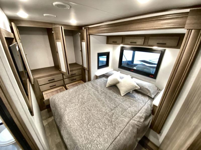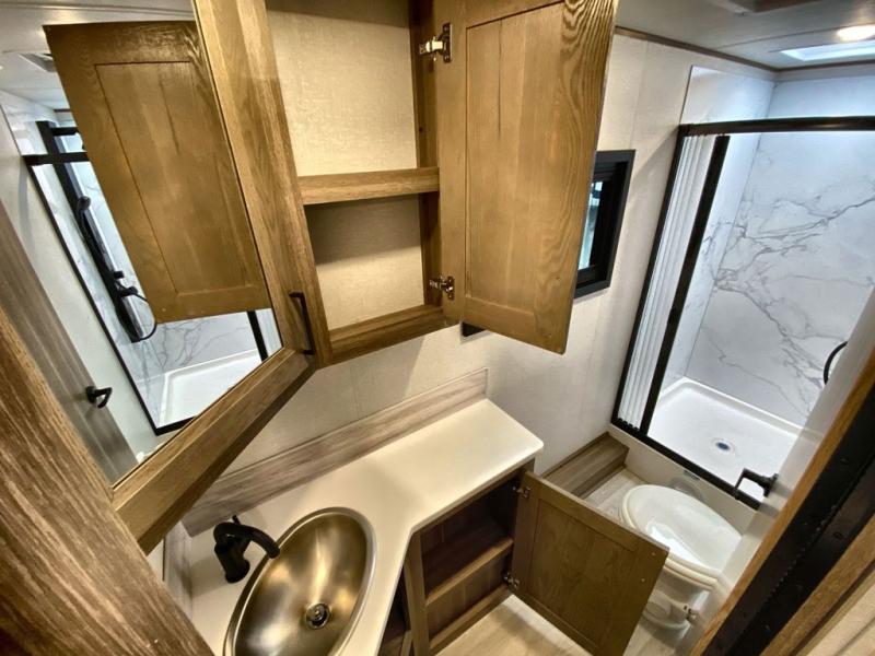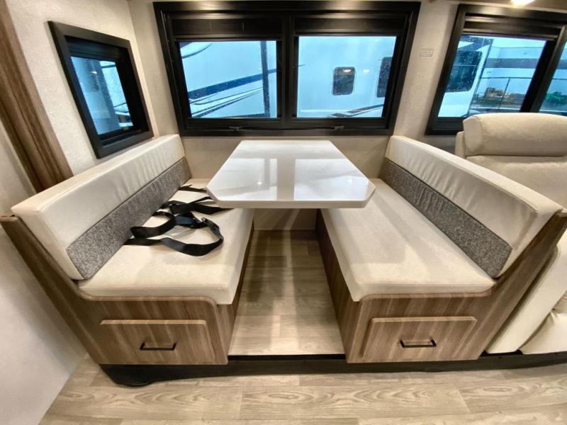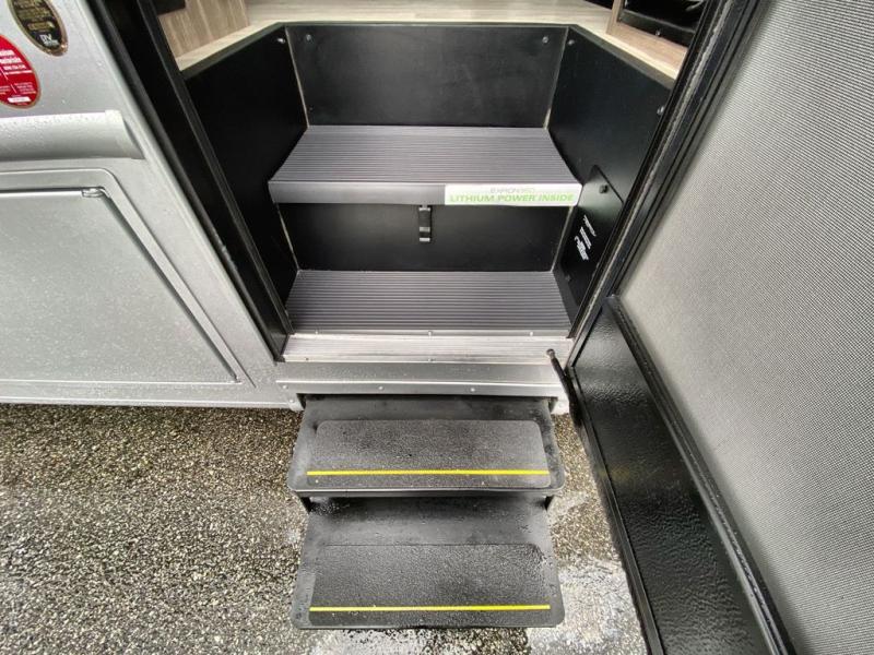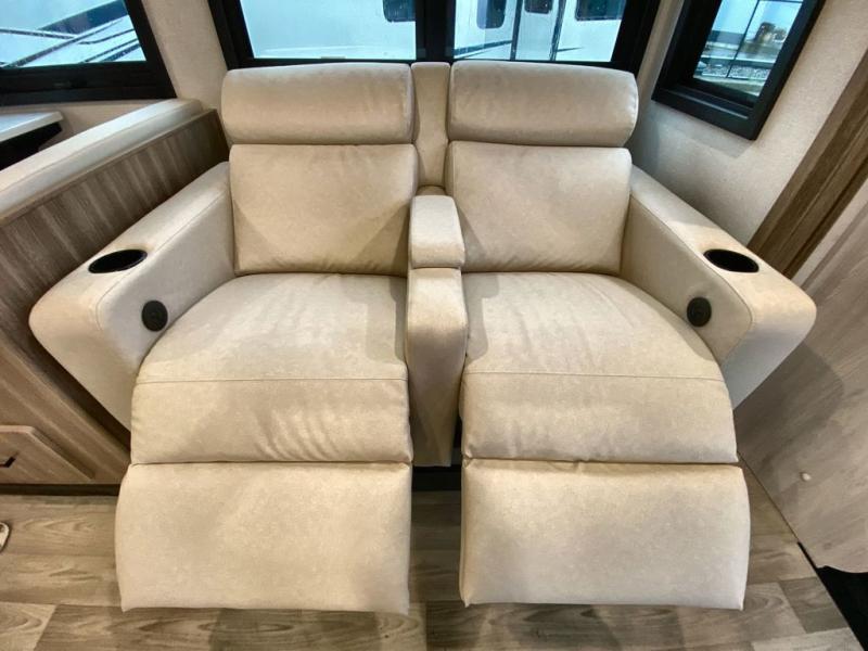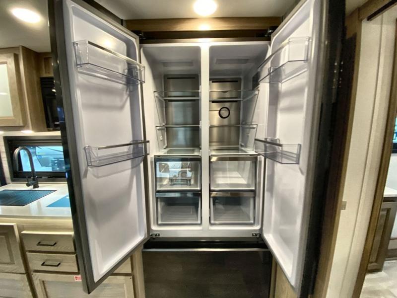 Traveling in this coach is sure to bring great memories! Once you arrive at your destination, you can make lunch in the full kitchen, and there is a large 16 cu. ft. 12V refrigerator and pantry for food storage. The booth dinette and power theater seat will provide a place to relax, and the 40" TV will keep you entertained on rainy days. The rear corner bedroom features a queen bed slide out, an overhead cabinet, wardrobe, plus washer and dryer prep if you choose to add those appliances. And the full bath is found in the opposite rear corner where you'll find a spacious shower, toilet, and nice-sized vanity to easily get ready each morning.