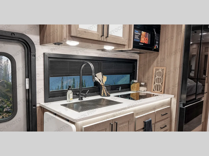 Traveling in this coach is sure to bring great memories! Once you arrive at your destination, you can make lunch in the full kitchen, and there is a large 16 cu. ft. 12V refrigerator and pantry for food storage. The booth dinette and power theater seat will provide a place to relax, and the 40" TV will keep you entertained on rainy days. The rear corner bedroom features a queen bed slide out, an overhead cabinet, wardrobe, plus washer and dryer prep if you choose to add those appliances. And the full bath is found in the opposite rear corner where you'll find a spacious shower, toilet, and nice-sized vanity to easily get ready each morning.