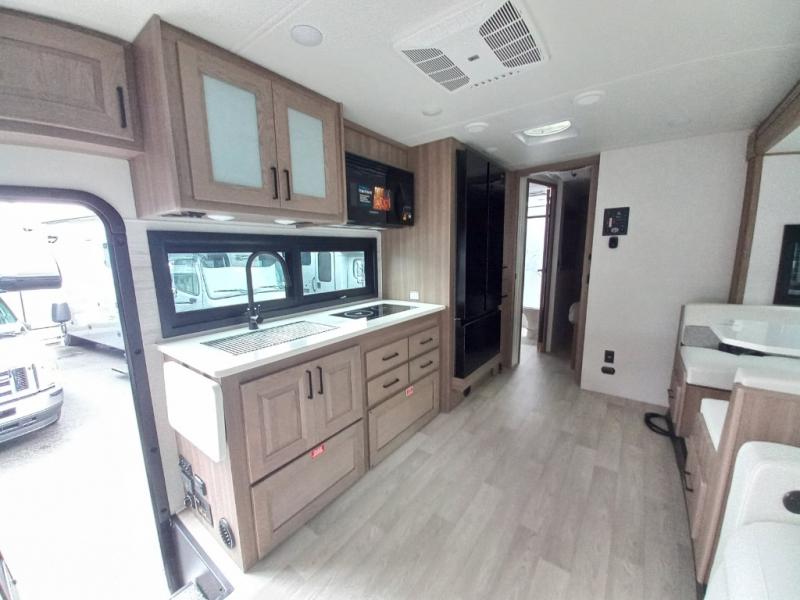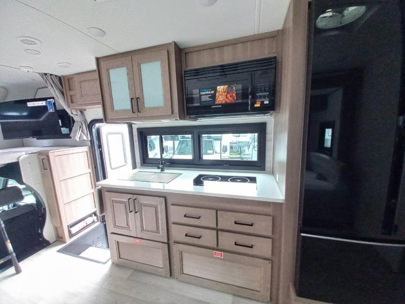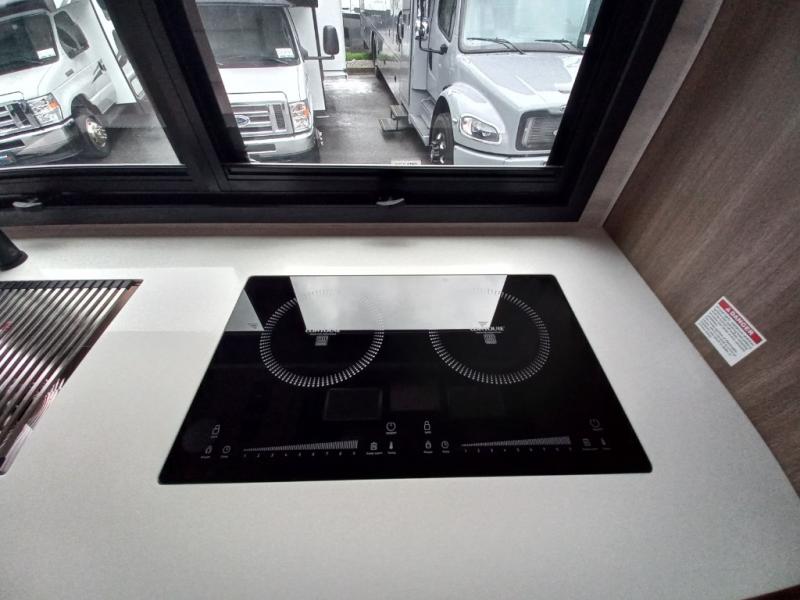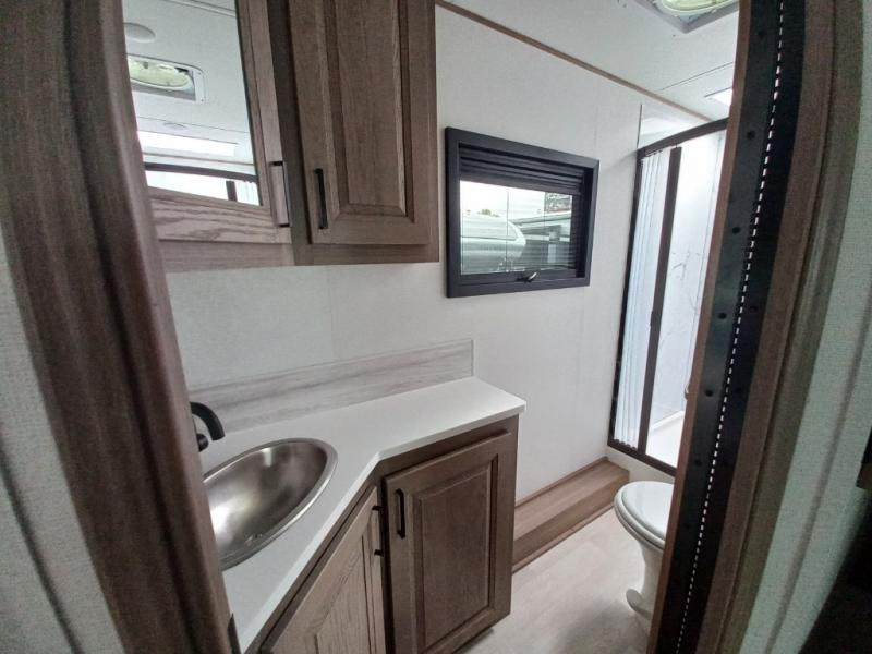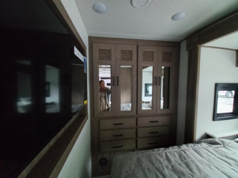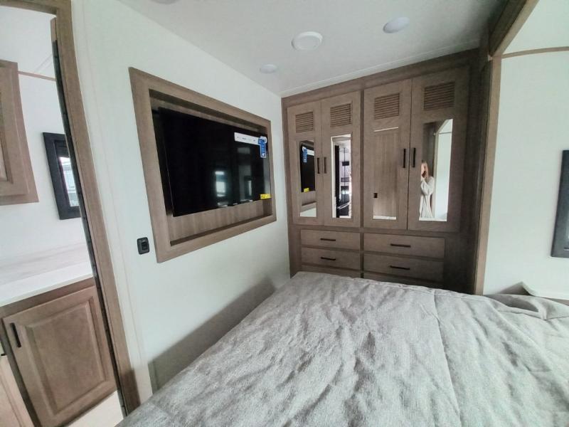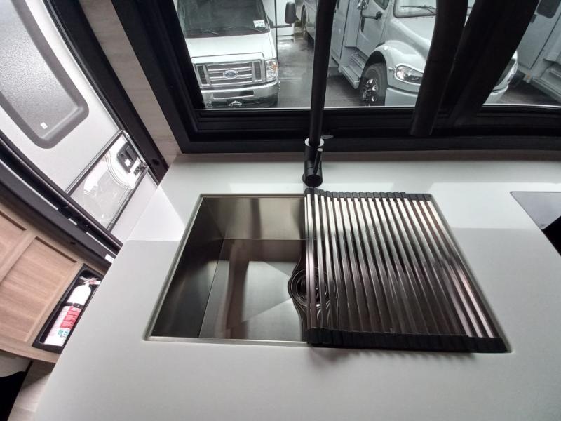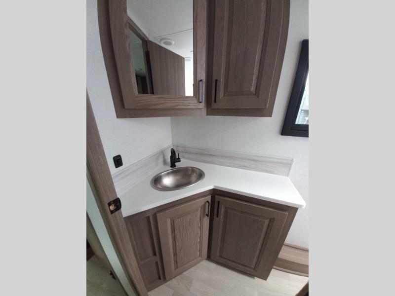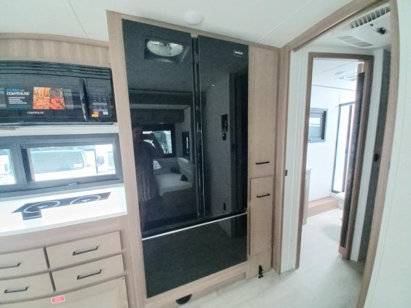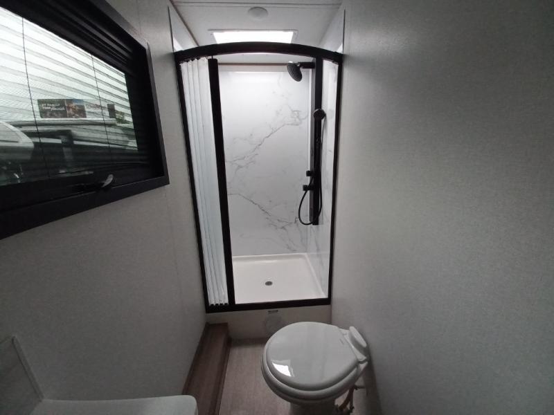 Traveling in this coach is sure to bring great memories! Once you arrive at your destination, you can make lunch in the full kitchen, and there is a large 16 cu. ft. 12V refrigerator and pantry for food storage. The booth dinette and power theater seat will provide a place to relax, and the 40" TV will keep you entertained on rainy days. The rear corner bedroom features a queen bed slide out, an overhead cabinet, wardrobe, plus washer and dryer prep if you choose to add those appliances. And the full bath is found in the opposite rear corner where you'll find a spacious shower, toilet, and nice-sized vanity to easily get ready each morning.