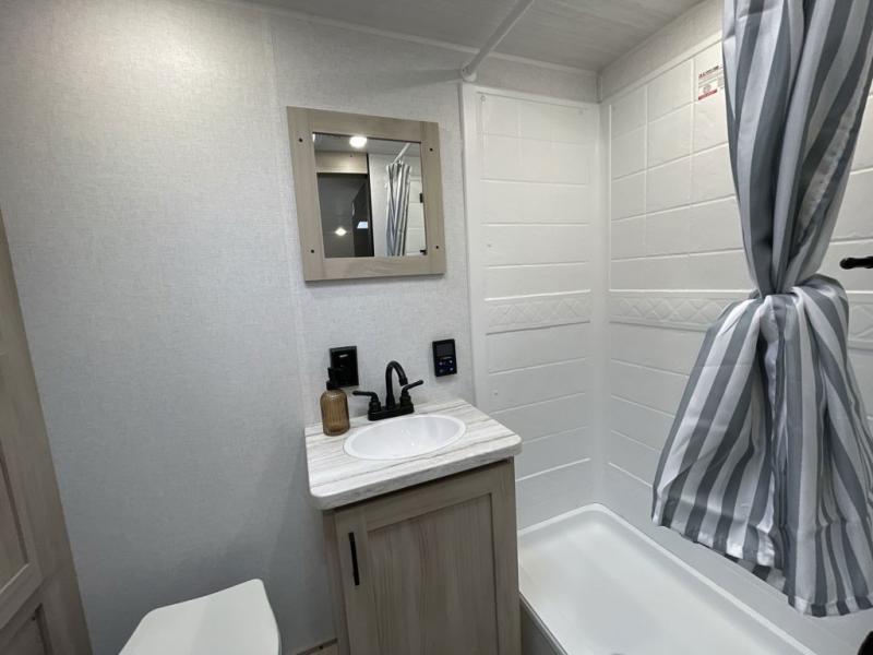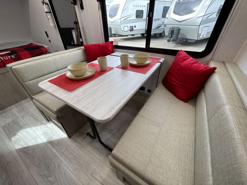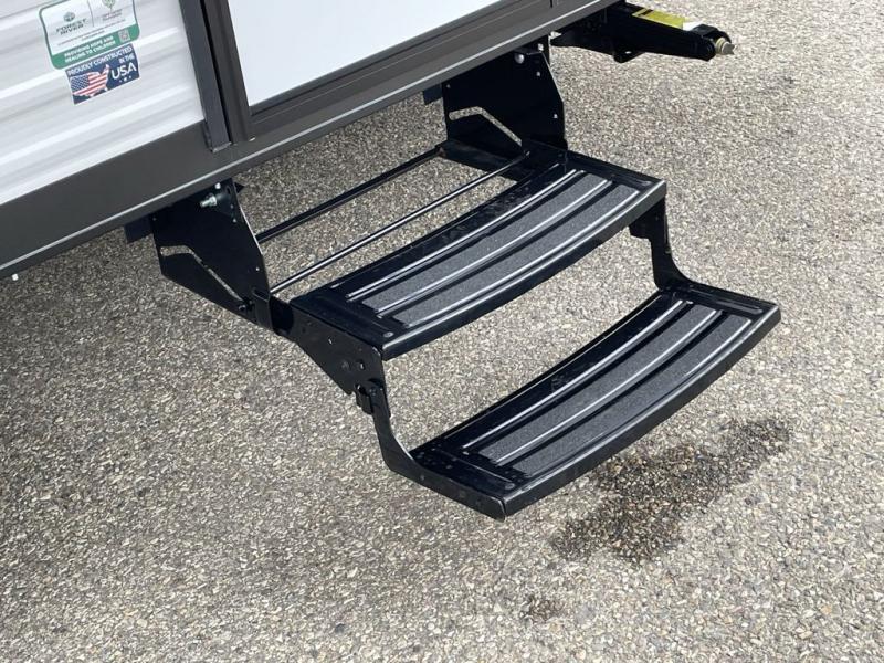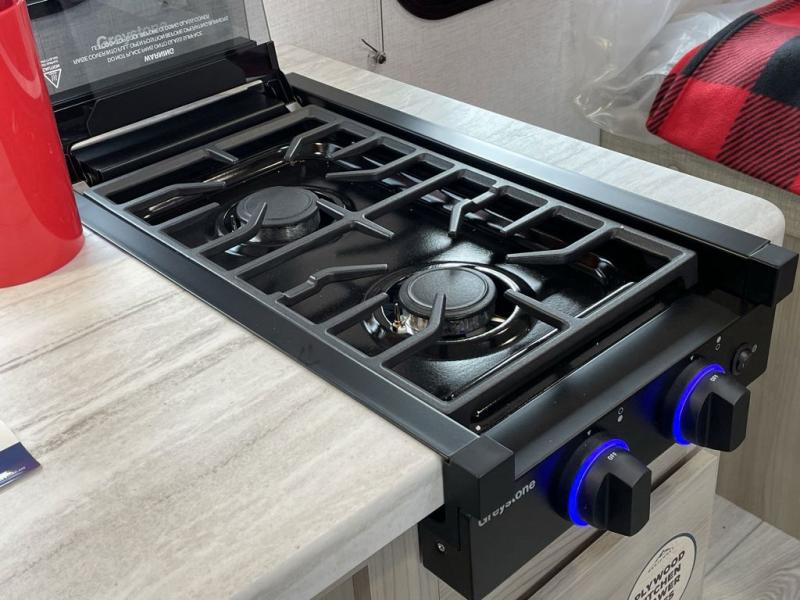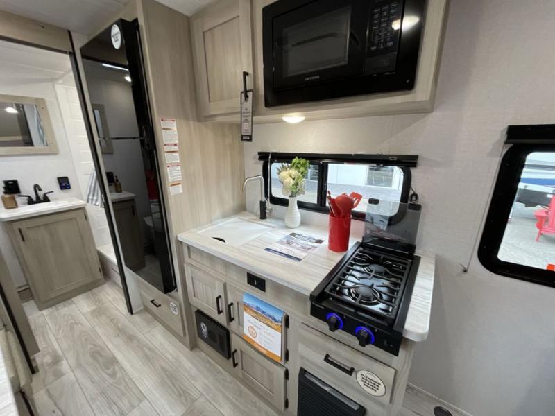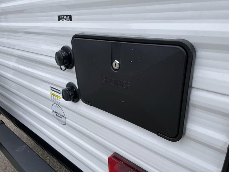 The 2025 East to West Della Terra 160RBXLE is a compact and lightweight travel trailer designed for couples or small families, boasting an overall length of 21 feet and a dry weight around 3,518 lbs, making it easily towable by a variety of vehicles. This single-axle model features a thoughtful floor plan that includes a front queen bed with flip-up storage, a booth dinette, and a spacious full rear bathroom with a 24" x 40" walk-in shower. Standard amenities in the LE Value Package include an 8,000 BTU low amp draw A/C, a 10 cubic foot 12-volt refrigerator, a 2-burner stove, seamless countertops, USB charging stations, an outside hot/cold shower, a power awning with LED lighting, and preps for solar, ladder, and backup camera, along with Wi-Fi connectivity