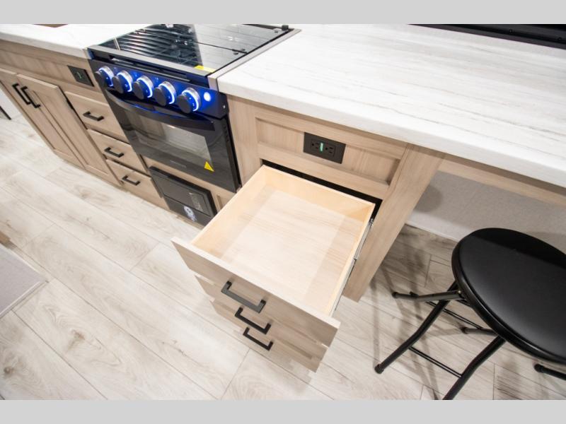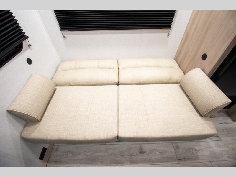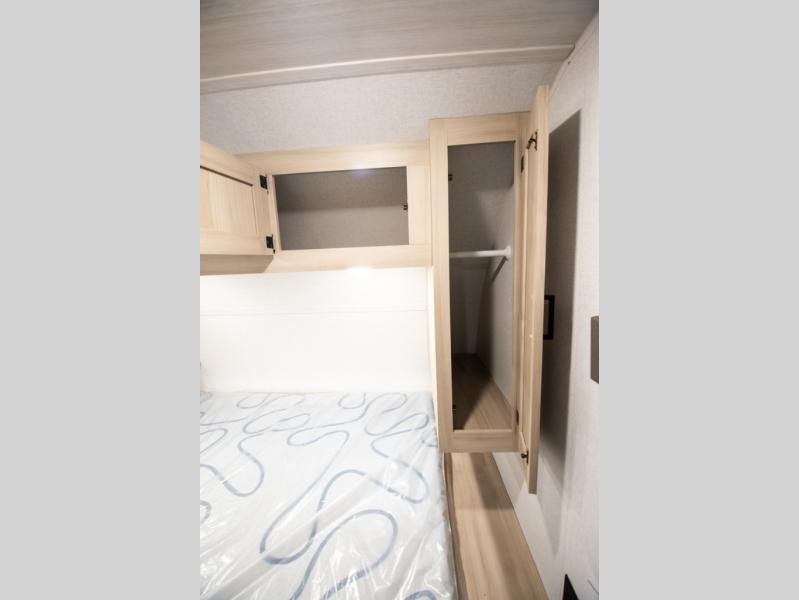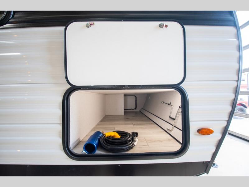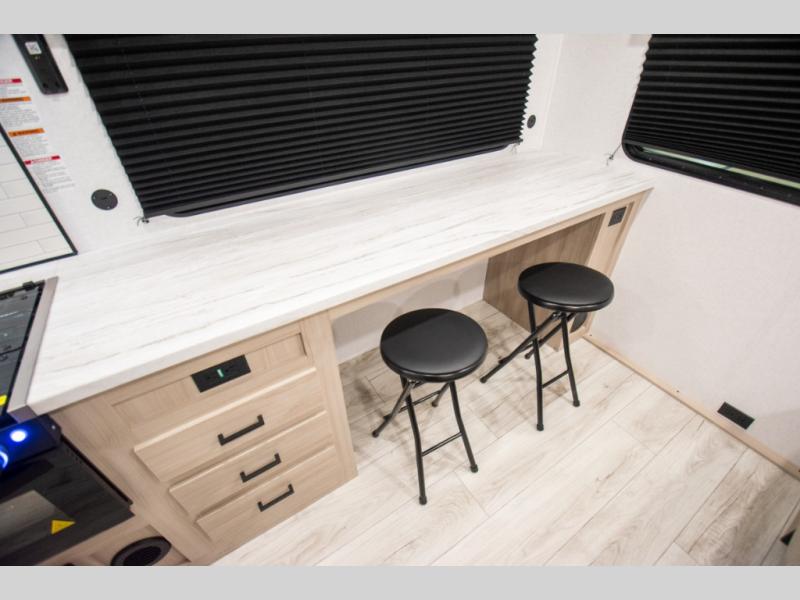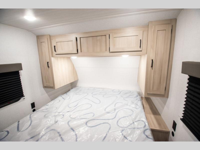 You will feel right at home in this travel trailer! For sleeping, there is a king-size bed with storage on both sides at the very front of this unit giving you privacy from the rest, and wardrobes on either side of the bed for your clothes. You will find storage beneath the bed for larger items or extra blankets, plus a space saving sliding door. The jiffy sofa and bar top with two bar stools offer comfortable seating as well as an extra sleeping space for an overnight guest, and the TV is a nice feature to enjoy on a rainy day. On the outside, an 16' awning provides a large outdoor living area protected from the elements, and the pass-through storage area will house all of your exterior gear like lawn chairs, outdoor games and rugs, plus so much more!