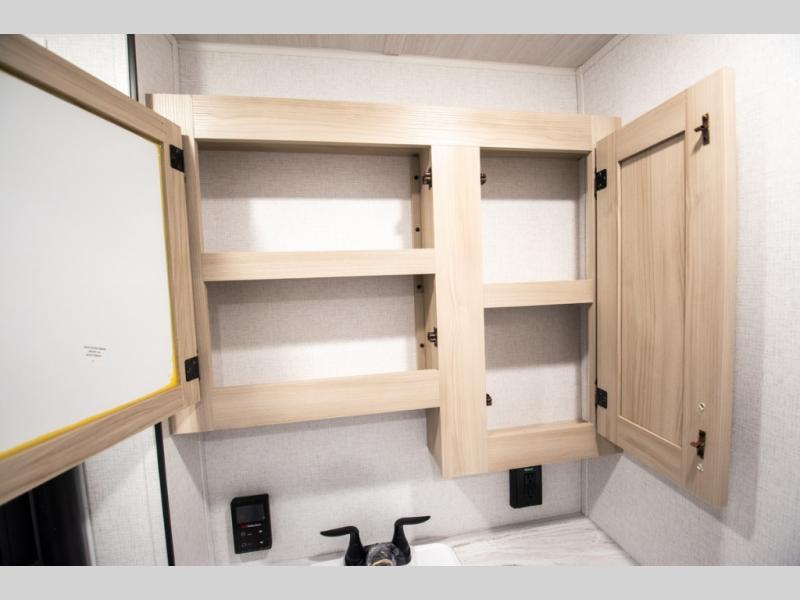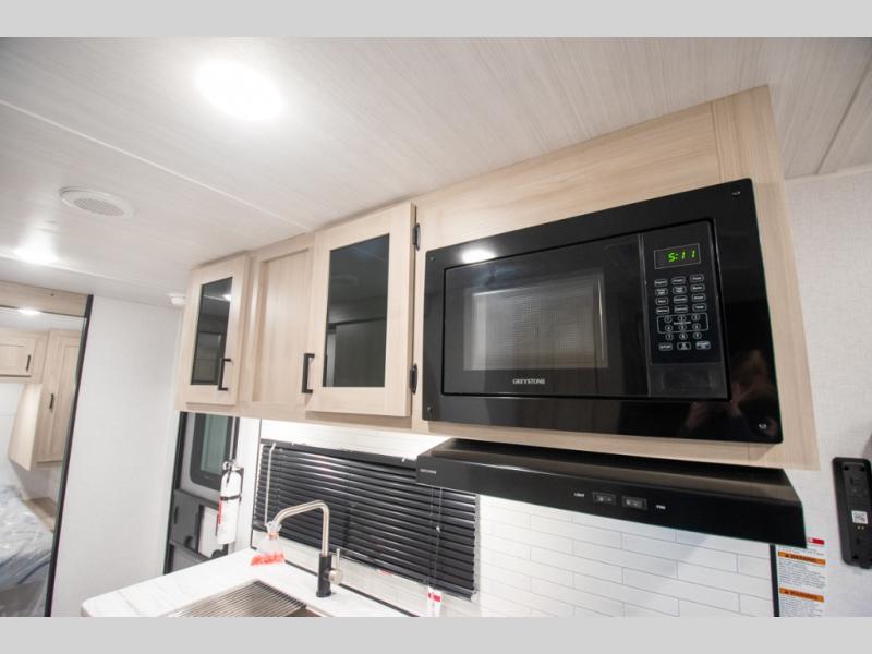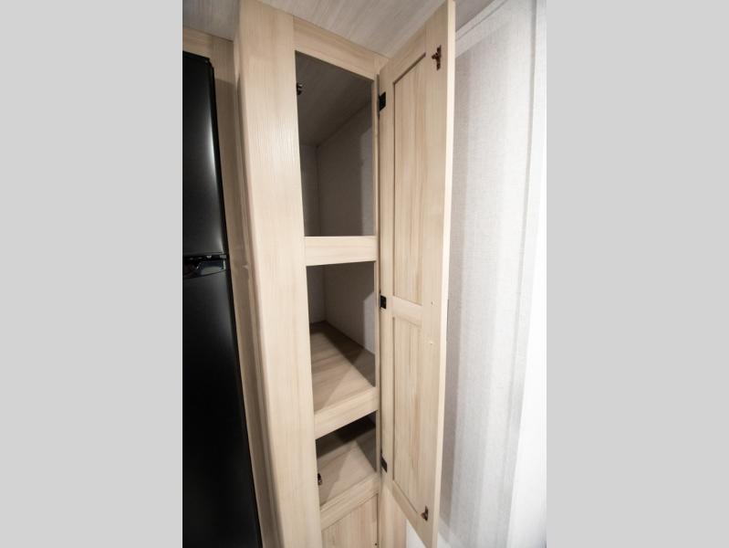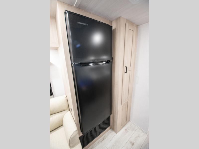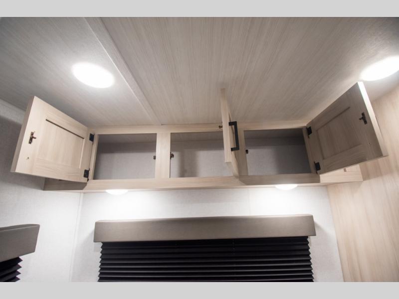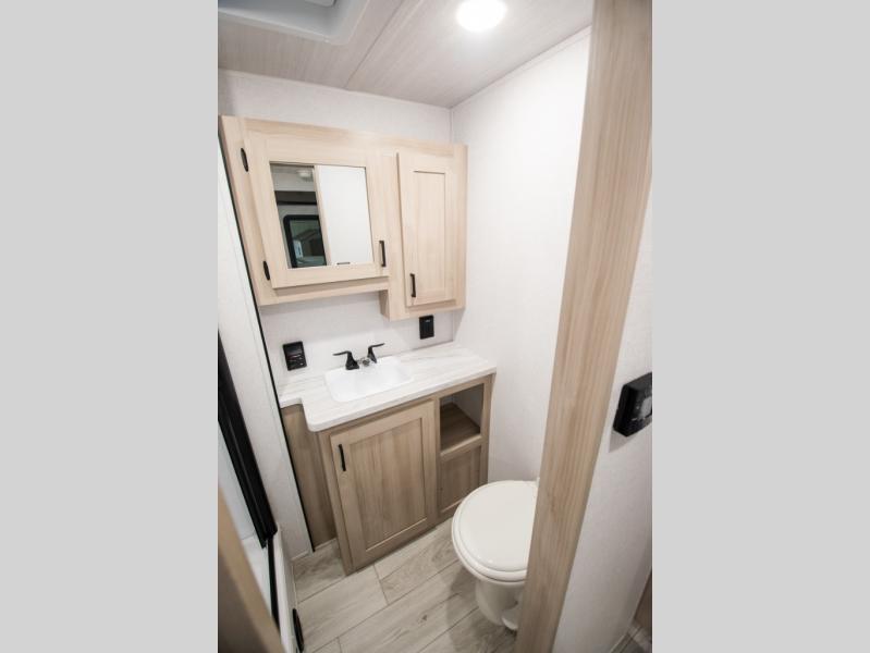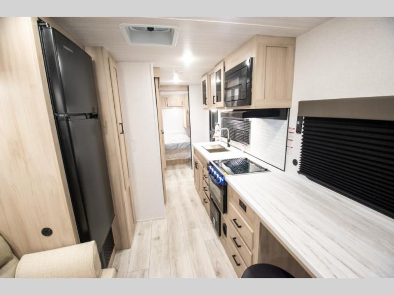 You will feel right at home in this travel trailer! For sleeping, there is a king-size bed with storage on both sides at the very front of this unit giving you privacy from the rest, and wardrobes on either side of the bed for your clothes. You will find storage beneath the bed for larger items or extra blankets, plus a space saving sliding door. The jiffy sofa and bar top with two bar stools offer comfortable seating as well as an extra sleeping space for an overnight guest, and the TV is a nice feature to enjoy on a rainy day. On the outside, an 16' awning provides a large outdoor living area protected from the elements, and the pass-through storage area will house all of your exterior gear like lawn chairs, outdoor games and rugs, plus so much more!