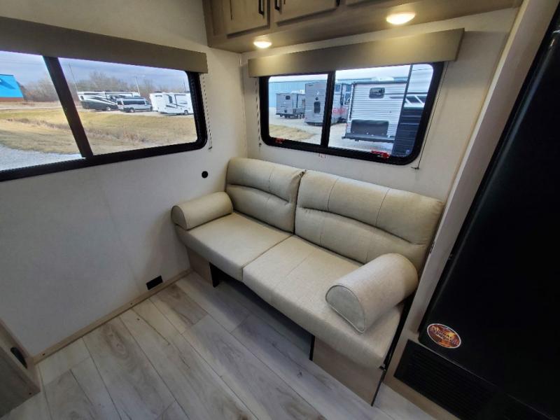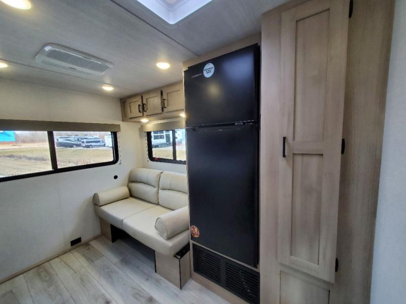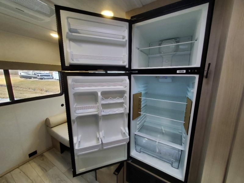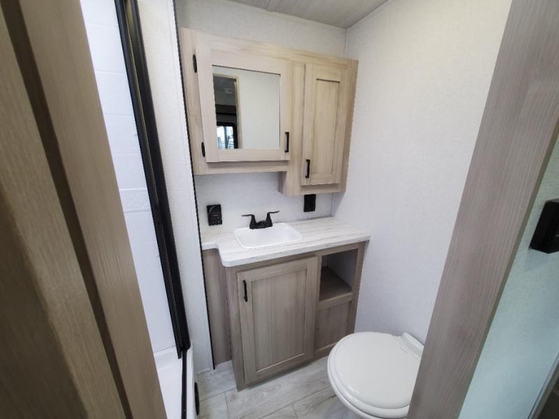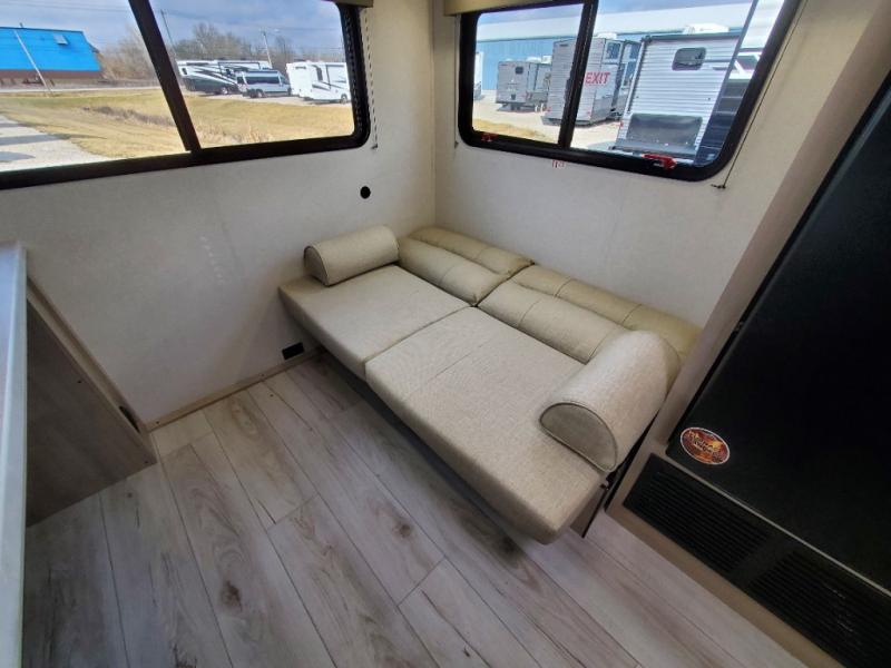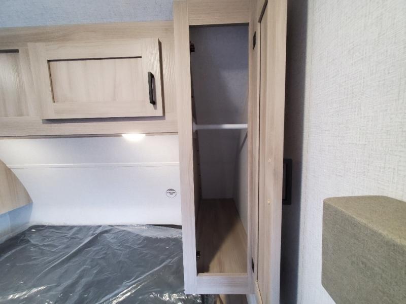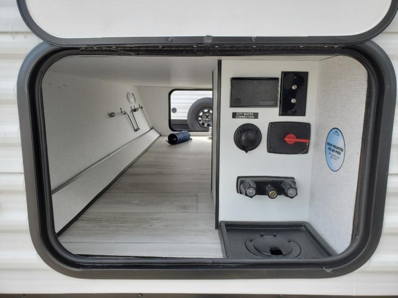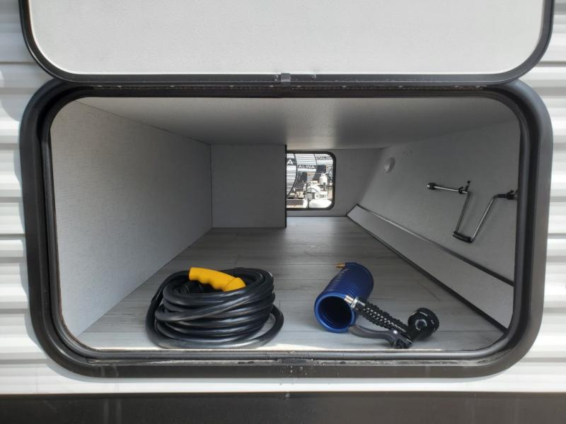 You will feel right at home in this travel trailer! For sleeping, there is a king-size bed with storage on both sides at the very front of this unit giving you privacy from the rest, and wardrobes on either side of the bed for your clothes. You will find storage beneath the bed for larger items or extra blankets, plus a space saving sliding door. The jiffy sofa and bar top with two bar stools offer comfortable seating as well as an extra sleeping space for an overnight guest, and the TV is a nice feature to enjoy on a rainy day. On the outside, an 16' awning provides a large outdoor living area protected from the elements, and the pass-through storage area will house all of your exterior gear like lawn chairs, outdoor games and rugs, plus so much more!
