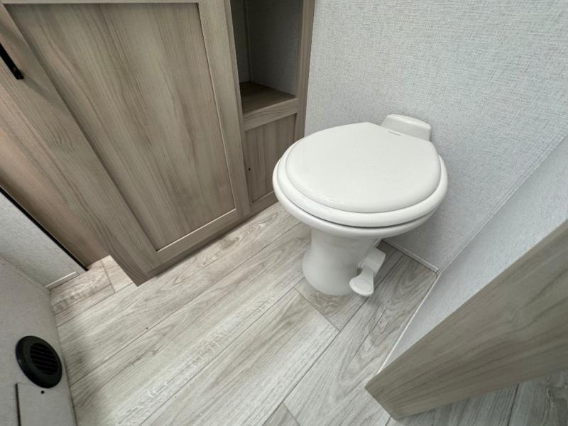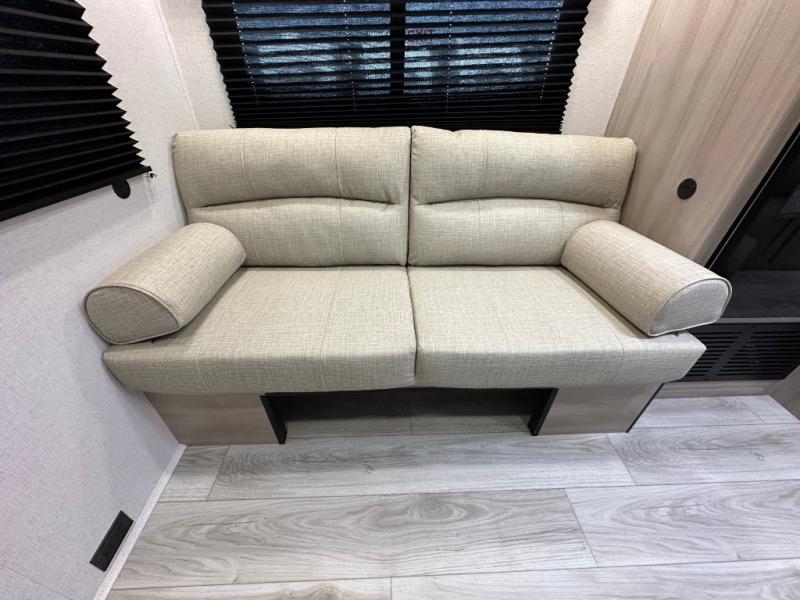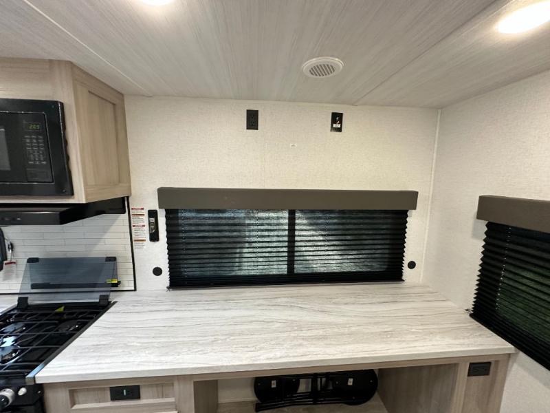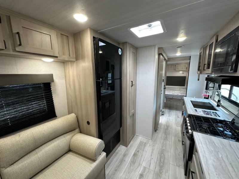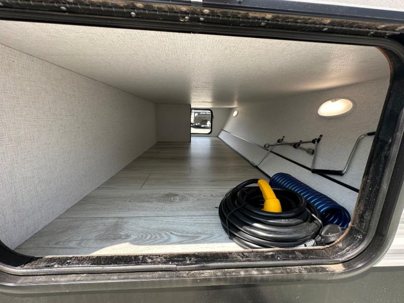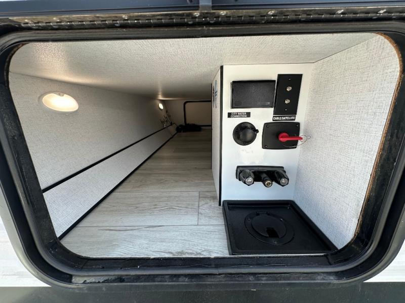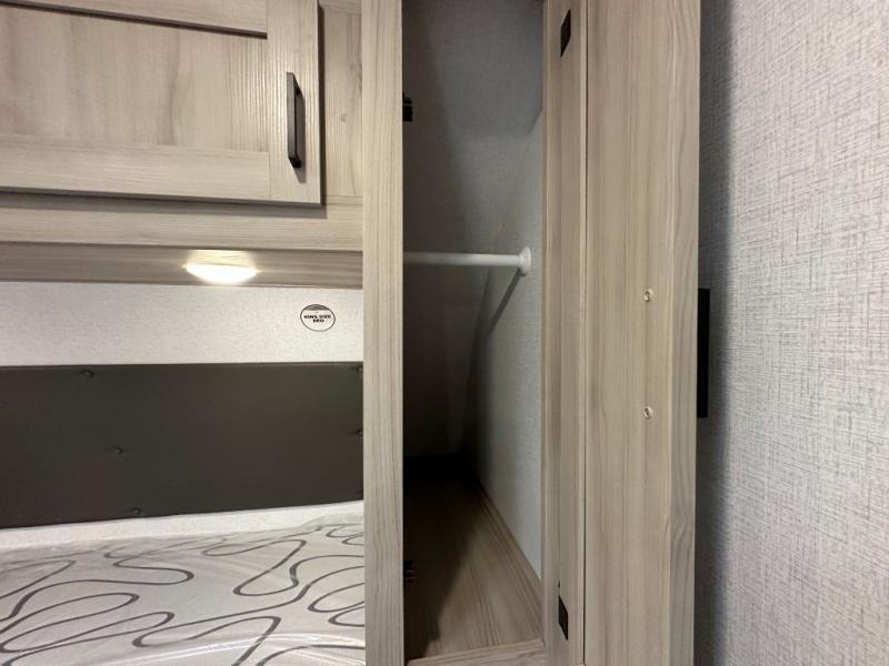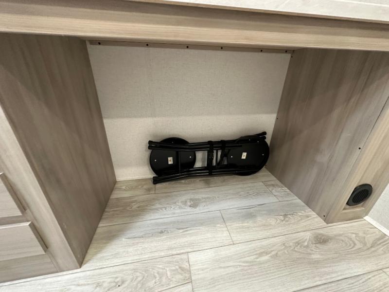 You will feel right at home in this travel trailer! For sleeping, there is a king-size bed with storage on both sides at the very front of this unit giving you privacy from the rest, and wardrobes on either side of the bed for your clothes. You will find storage beneath the bed for larger items or extra blankets, plus a space saving sliding door. The jiffy sofa and bar top with two bar stools offer comfortable seating as well as an extra sleeping space for an overnight guest, and the TV is a nice feature to enjoy on a rainy day. On the outside, an 16' awning provides a large outdoor living area protected from the elements, and the pass-through storage area will house all of your exterior gear like lawn chairs, outdoor games and rugs, plus so much more!