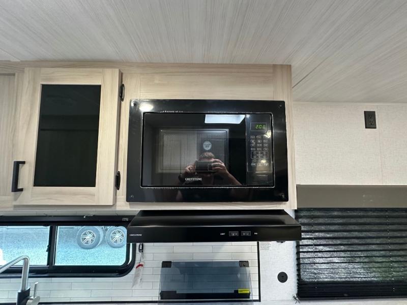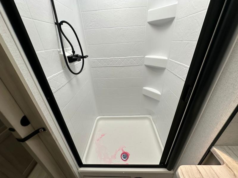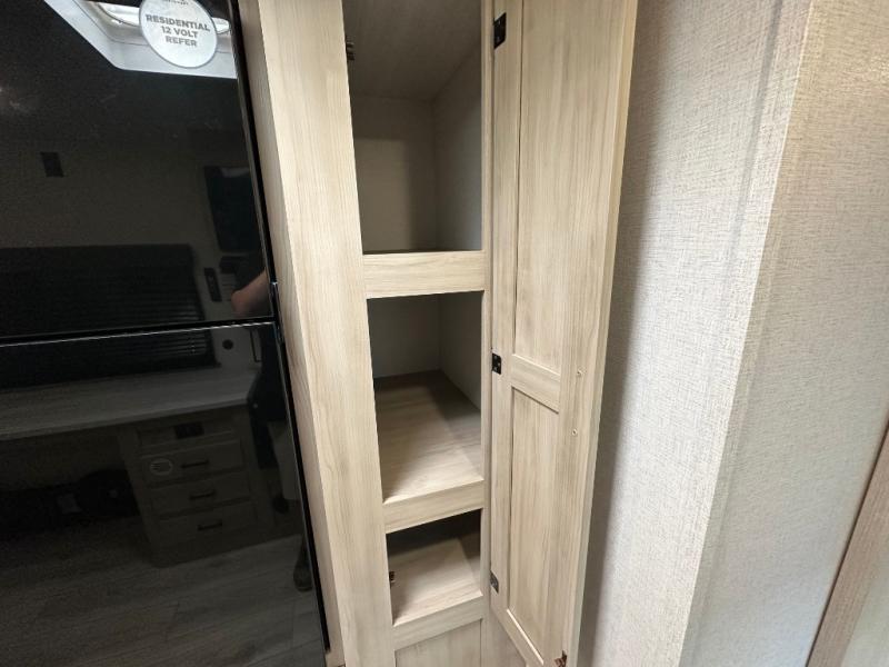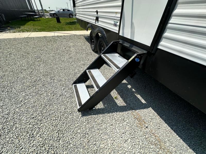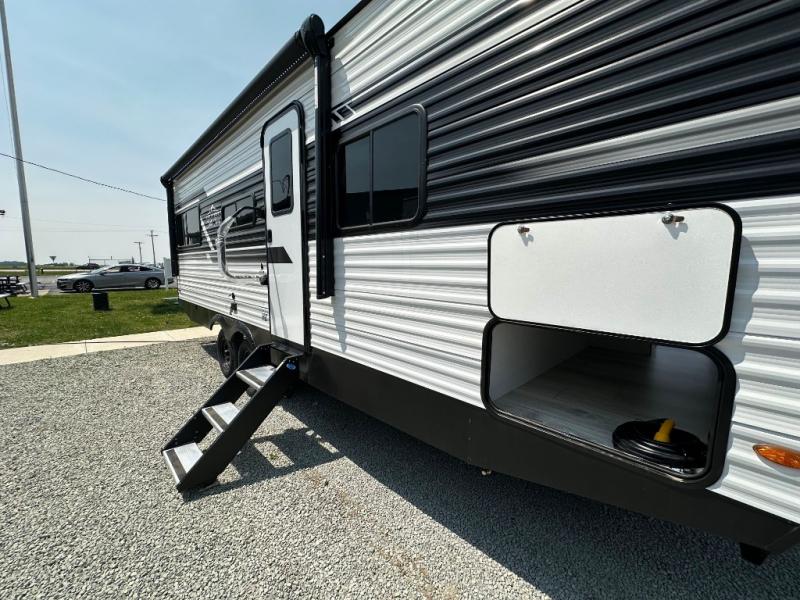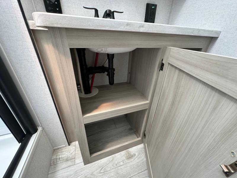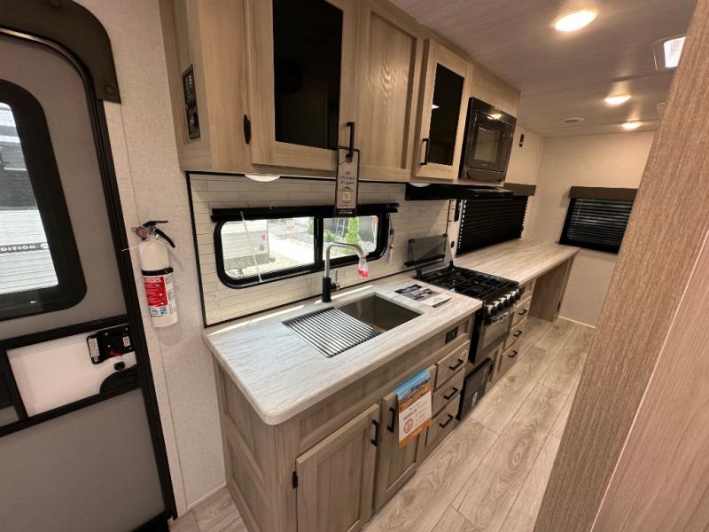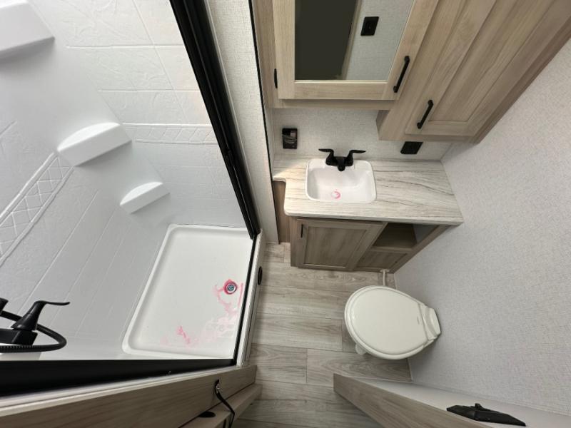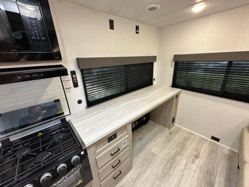 You will feel right at home in this travel trailer! For sleeping, there is a king-size bed with storage on both sides at the very front of this unit giving you privacy from the rest, and wardrobes on either side of the bed for your clothes. You will find storage beneath the bed for larger items or extra blankets, plus a space saving sliding door. The jiffy sofa and bar top with two bar stools offer comfortable seating as well as an extra sleeping space for an overnight guest, and the TV is a nice feature to enjoy on a rainy day. On the outside, an 16' awning provides a large outdoor living area protected from the elements, and the pass-through storage area will house all of your exterior gear like lawn chairs, outdoor games and rugs, plus so much more!