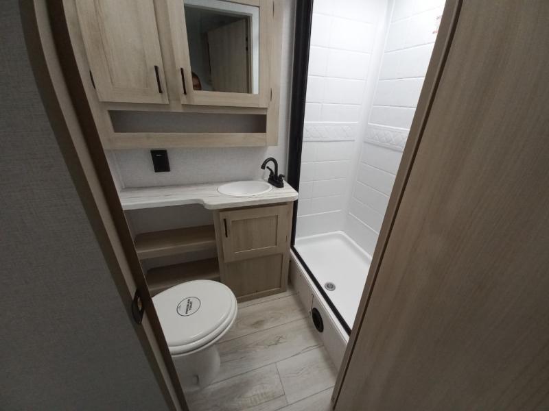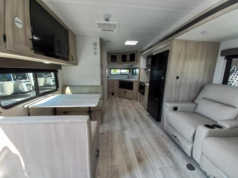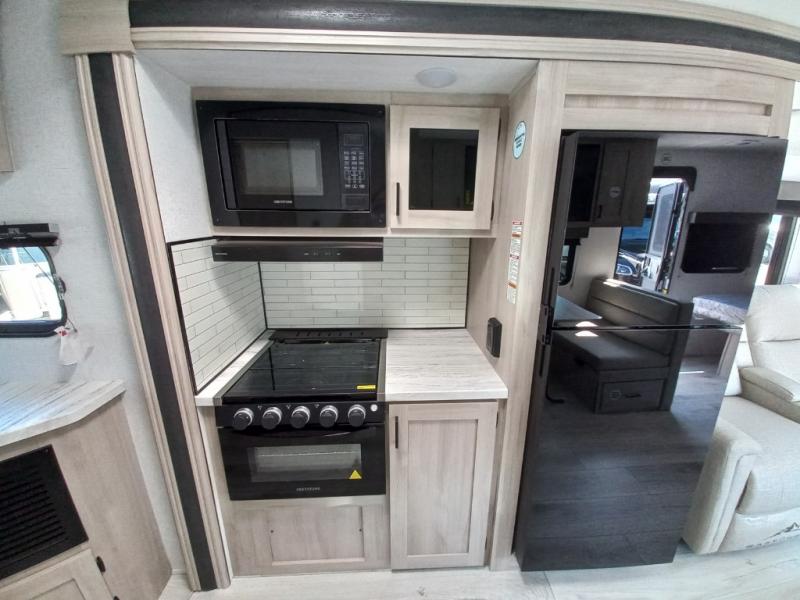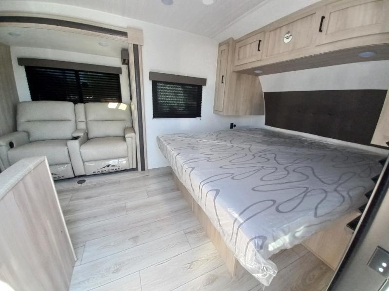 Head to the lake in this travel trailer with a large slide out for more space and comfort! Once you arrive, you can put out the 18' power awning, unload the pass-through storage, and make lunch on the outdoor kitchen with a pull-out griddle and refrigerator. The booth dinette inside can be used as dining space, and there is storage underneath here for added convenience. A jiffy sofa within the slide can be switched out for an optional theater seat if you don't need the extra sleeping space. You will also find a full interior kitchen in the rear corner, and the full bath in the other rear corner is sure to come in handy. When you're ready for some shut-eye, the king bed in the front bedroom will feel just like home. There are also dual wardrobes and nightstands to keep your things tidy!
