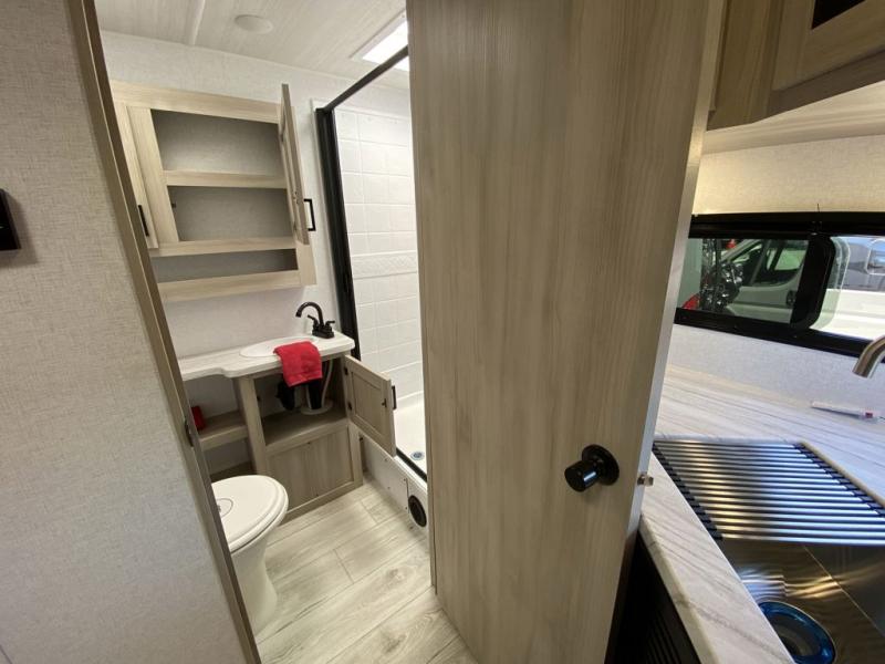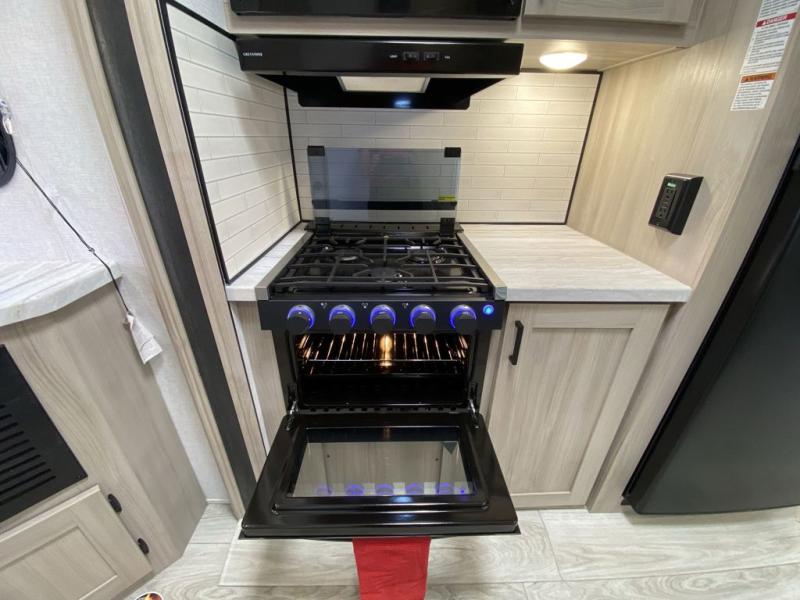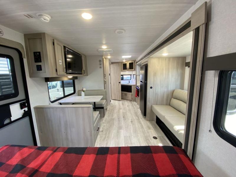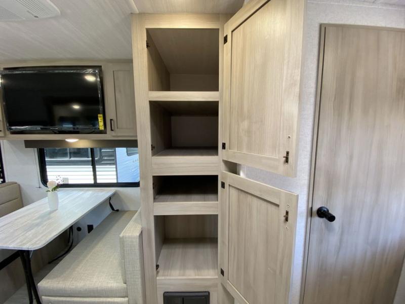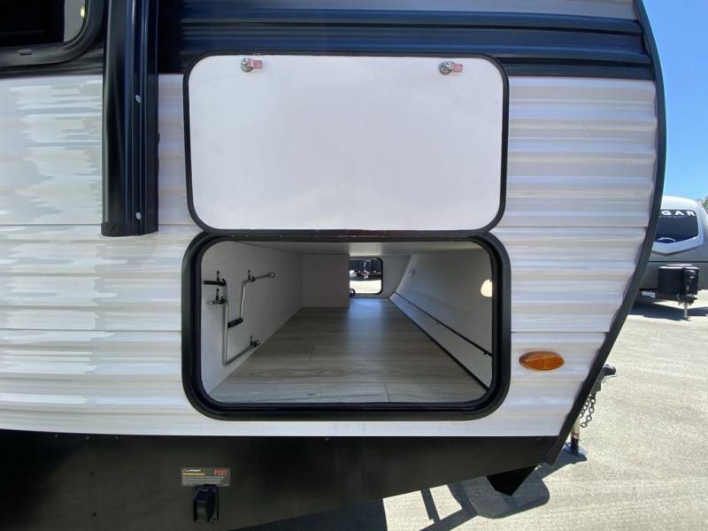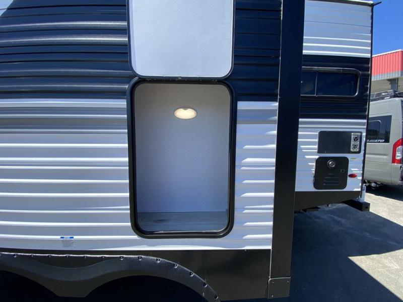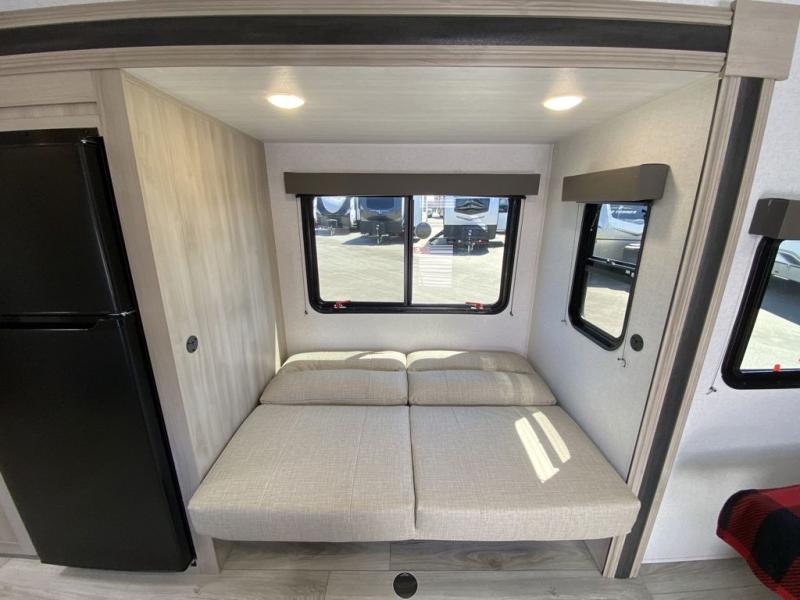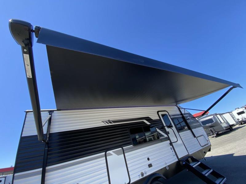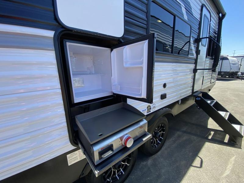 Head to the lake in this travel trailer with a large slide out for more space and comfort! Once you arrive, you can put out the 18' power awning, unload the pass-through storage, and make lunch on the outdoor kitchen with a pull-out griddle and refrigerator. The booth dinette inside can be used as dining space, and there is storage underneath here for added convenience. A jiffy sofa within the slide can be switched out for an optional theater seat if you don't need the extra sleeping space. You will also find a full interior kitchen in the rear corner, and the full bath in the other rear corner is sure to come in handy. When you're ready for some shut-eye, the king bed in the front bedroom will feel just like home. There are also dual wardrobes and nightstands to keep your things tidy!