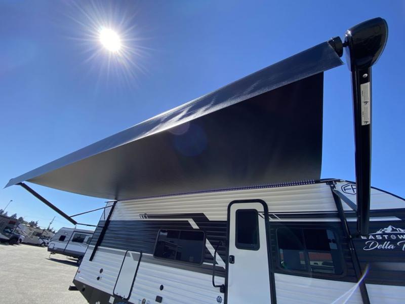 Each Della Terra travel trailer by EAST TO WEST is constructed with an enclosed and heated underbelly and enclosed holding tanks so you can camp all year long. There is also a power tongue jack with an LED light for easy set up and a power awning with LED lights you can rest under after you've unpacked. The Explore Comfort Package comes seamless pressed countertops, kitchen backsplash, window valance package with black night shades, and many more comforts. You will also appreciate the Adventure Outdoor Package with backup camera prep and solar prep, a tankless water heater, an RV grill quick disconnect, and a universal docking station with battery disconnect.