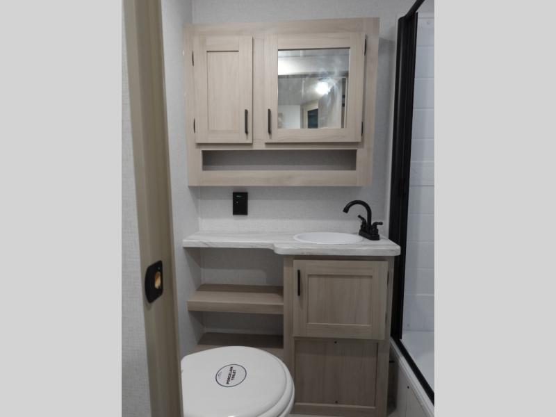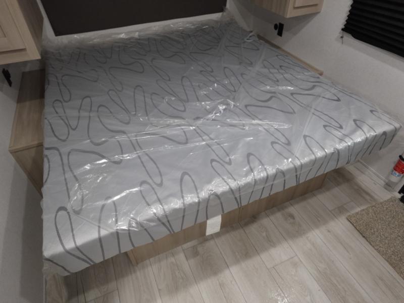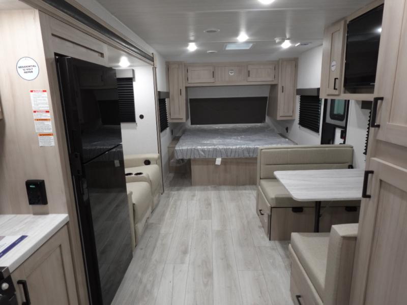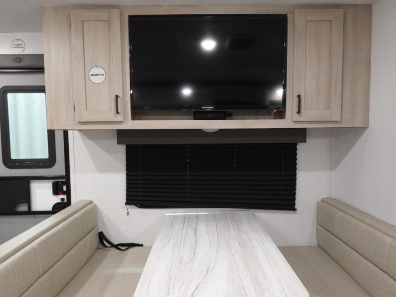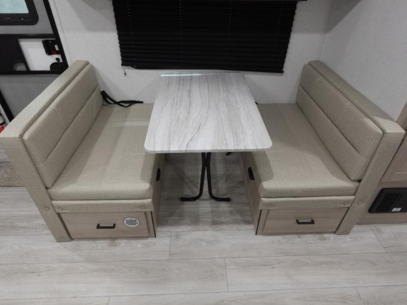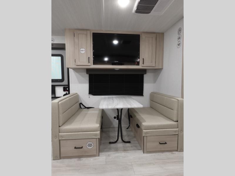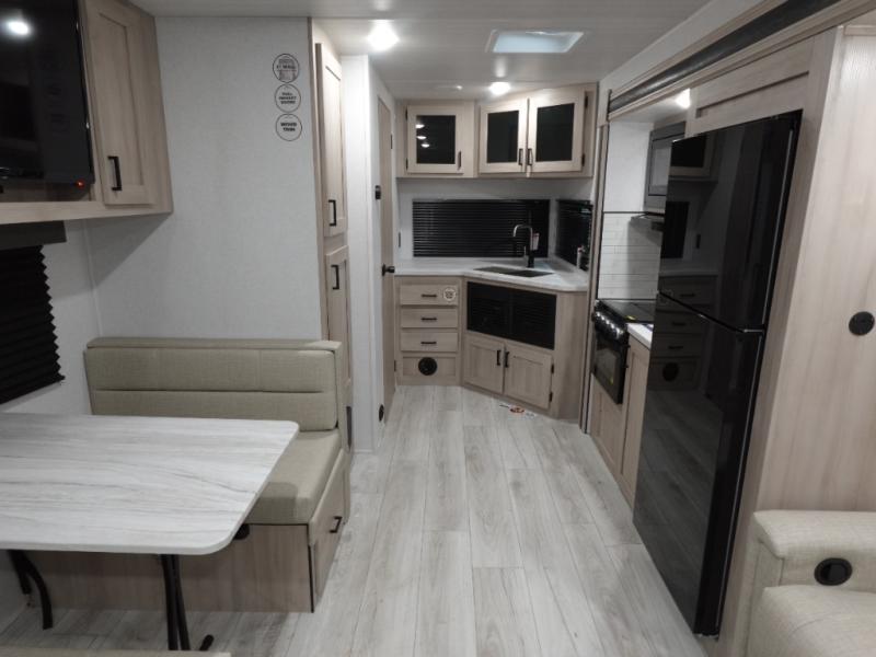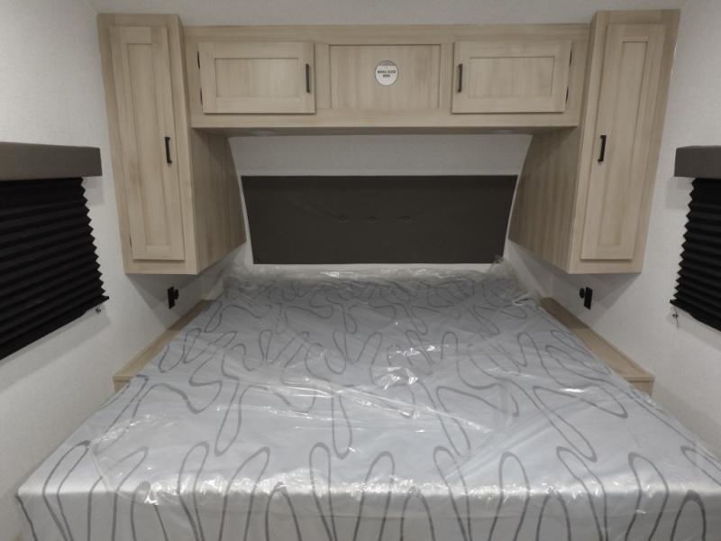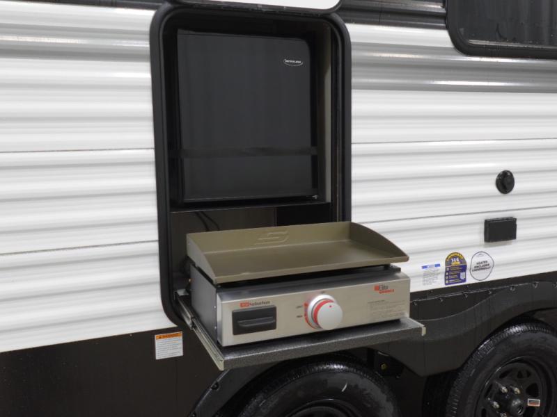 Head to the lake in this travel trailer with a large slide out for more space and comfort! Once you arrive, you can put out the 18' power awning, unload the pass-through storage, and make lunch on the outdoor kitchen with a pull-out griddle and refrigerator. The booth dinette inside can be used as dining space, and there is storage underneath here for added convenience. You will also find a full interior kitchen in the rear corner, and the full bath in the other rear corner is sure to come in handy. When you're ready for some shut-eye, the king bed in the front bedroom will feel just like home. There are also dual wardrobes and nightstands to keep your things tidy!