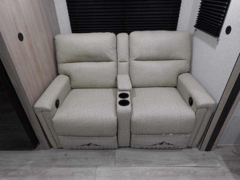 Each Della Terra travel trailer by EAST TO WEST is constructed with an enclosed and heated underbelly and enclosed holding tanks so you can camp all year long. There is also a power tongue jack with an LED light for easy set up and a power awning with LED lights you can rest under after you've unpacked. The Explore Comfort Package comes seamless pressed countertops, kitchen backsplash, window valance package with black night shades, and many more comforts. You will also appreciate the Adventure Outdoor Package with backup camera prep and solar prep, a tankless water heater, an RV grill quick disconnect, and a universal docking station with battery disconnect.