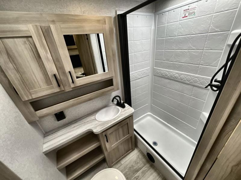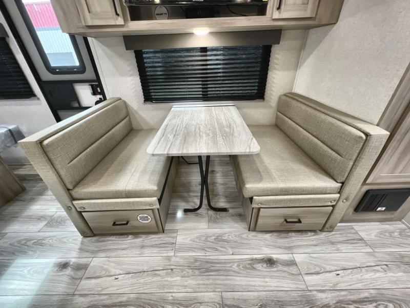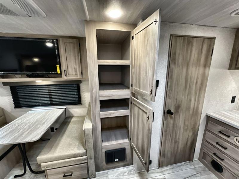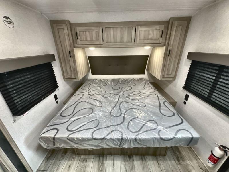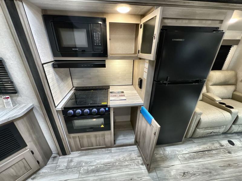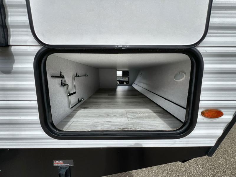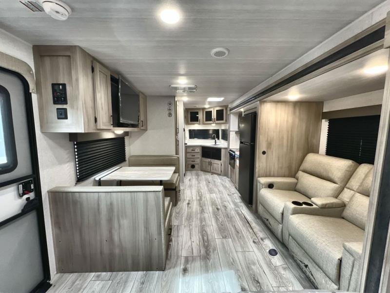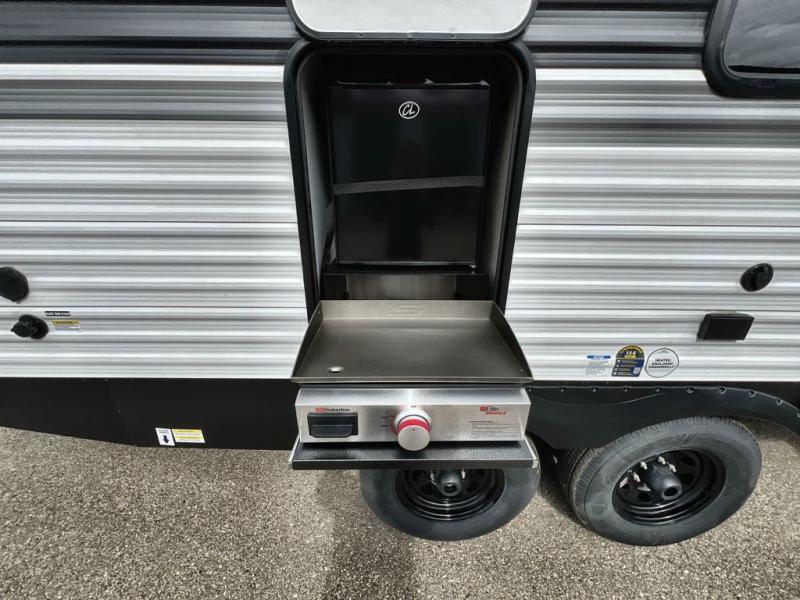 Head to the lake in this travel trailer with a large slide out for more space and comfort! Once you arrive, you can put out the 18' power awning, unload the pass-through storage, and make lunch on the outdoor kitchen with a pull-out griddle and refrigerator. The booth dinette inside can be used as dining space, and there is storage underneath here for added convenience. A jiffy sofa within the slide can be switched out for an optional theater seat if you don't need the extra sleeping space. You will also find a full interior kitchen in the rear corner, and the full bath in the other rear corner is sure to come in handy. When you're ready for some shut-eye, the king bed in the front bedroom will feel just like home. There are also dual wardrobes and nightstands to keep your things tidy!