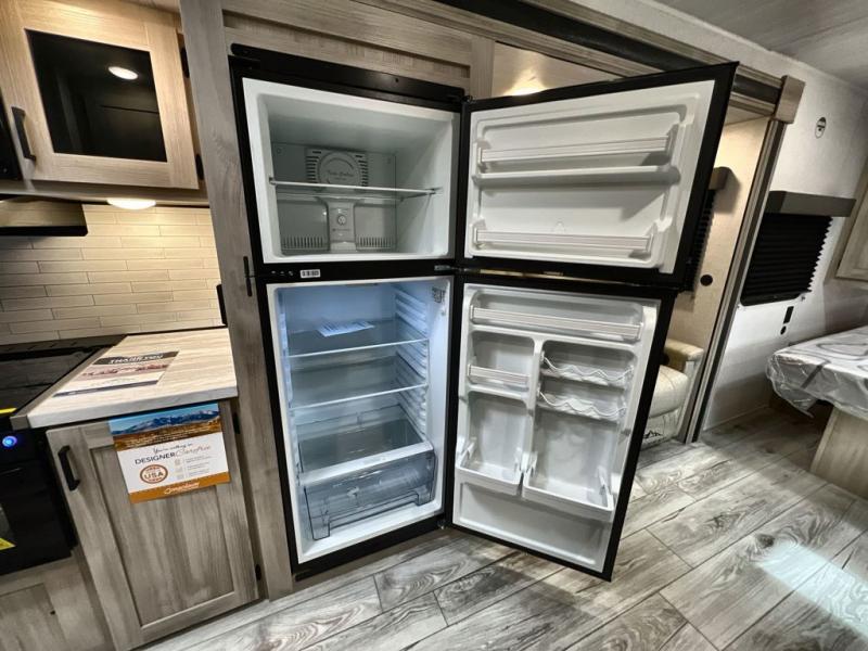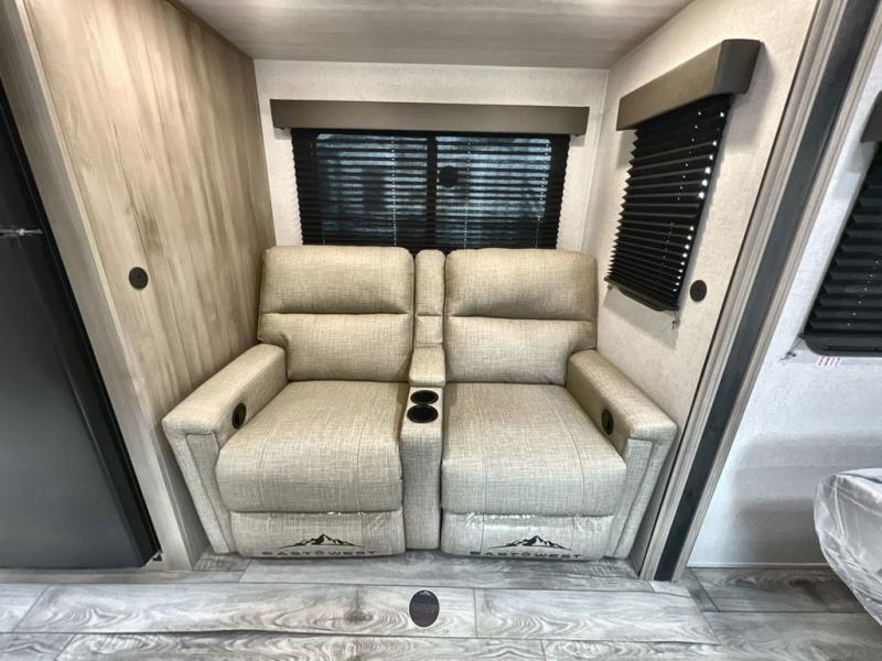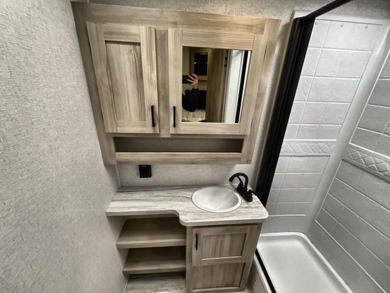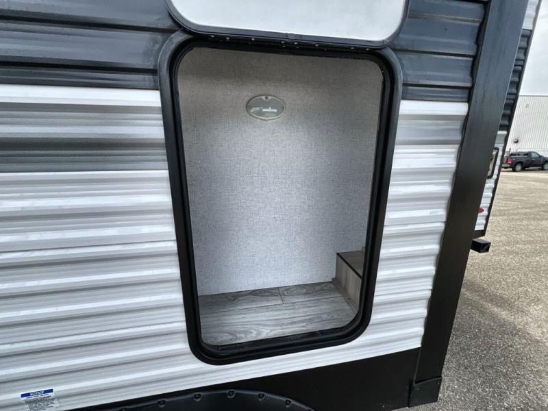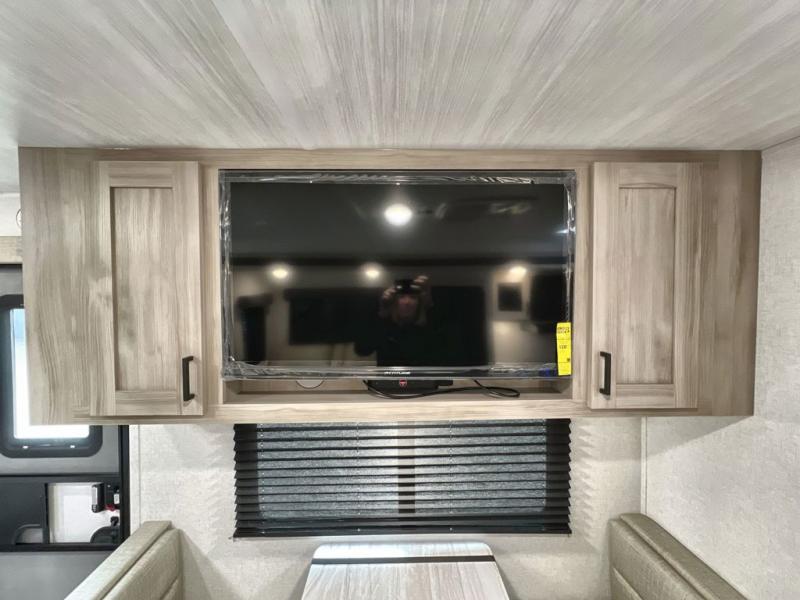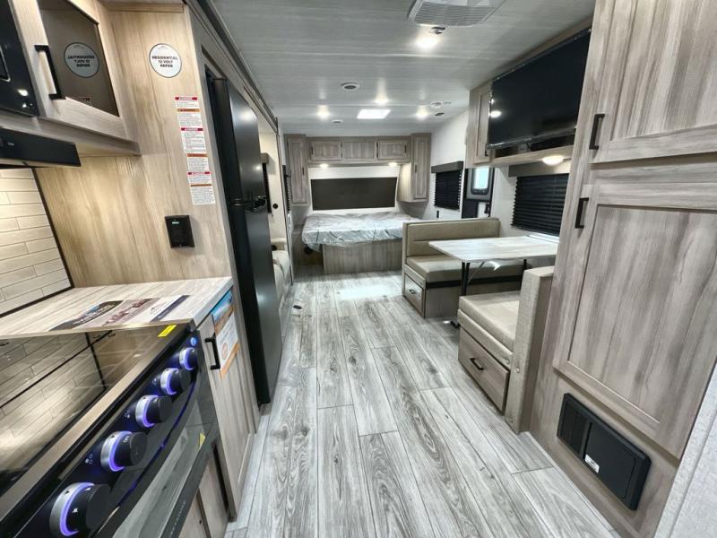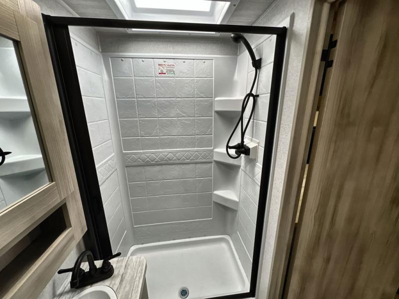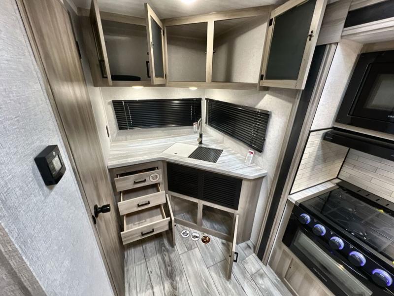 Head to the lake in this travel trailer with a large slide out for more space and comfort! Once you arrive, you can put out the 18' power awning, unload the pass-through storage, and make lunch on the outdoor kitchen with a pull-out griddle and refrigerator. The booth dinette inside can be used as dining space, and there is storage underneath here for added convenience. A jiffy sofa within the slide can be switched out for an optional theater seat if you don't need the extra sleeping space. You will also find a full interior kitchen in the rear corner, and the full bath in the other rear corner is sure to come in handy. When you're ready for some shut-eye, the king bed in the front bedroom will feel just like home. There are also dual wardrobes and nightstands to keep your things tidy!