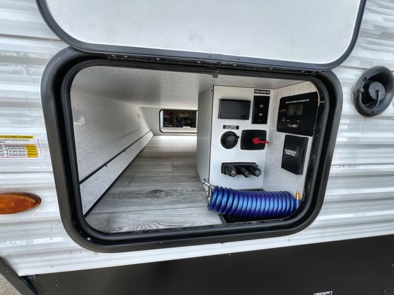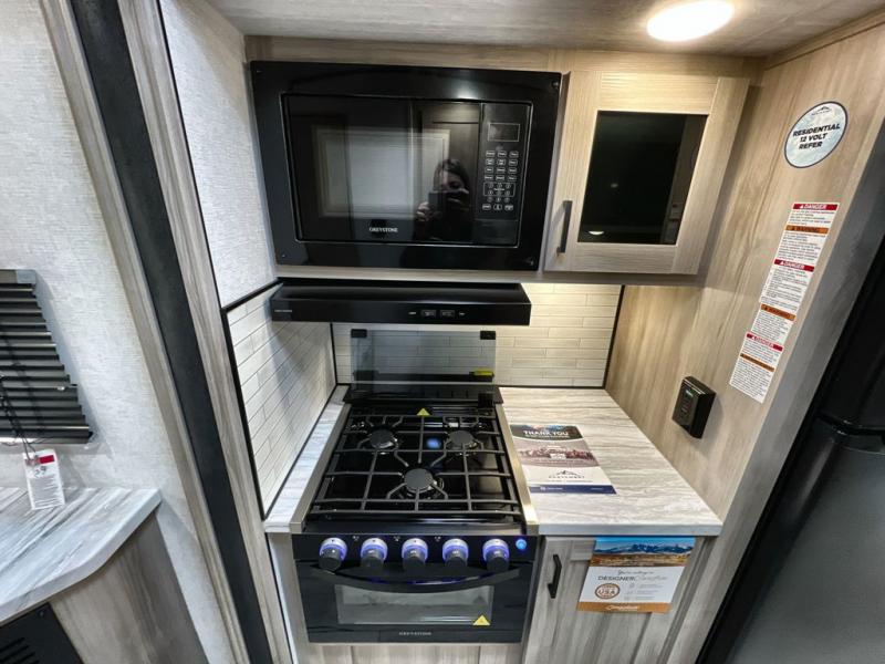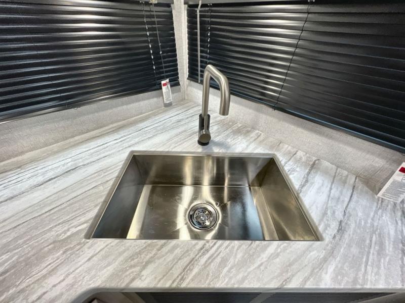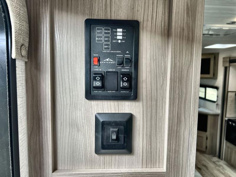 Each Della Terra travel trailer by EAST TO WEST is constructed with an enclosed and heated underbelly and enclosed holding tanks so you can camp all year long. There is also a power tongue jack with an LED light for easy set up and a power awning with LED lights you can rest under after you've unpacked. The Explore Comfort Package comes seamless pressed countertops, kitchen backsplash, window valance package with black night shades, and many more comforts. You will also appreciate the Adventure Outdoor Package with backup camera prep and solar prep, a tankless water heater, an RV grill quick disconnect, and a universal docking station with battery disconnect.
