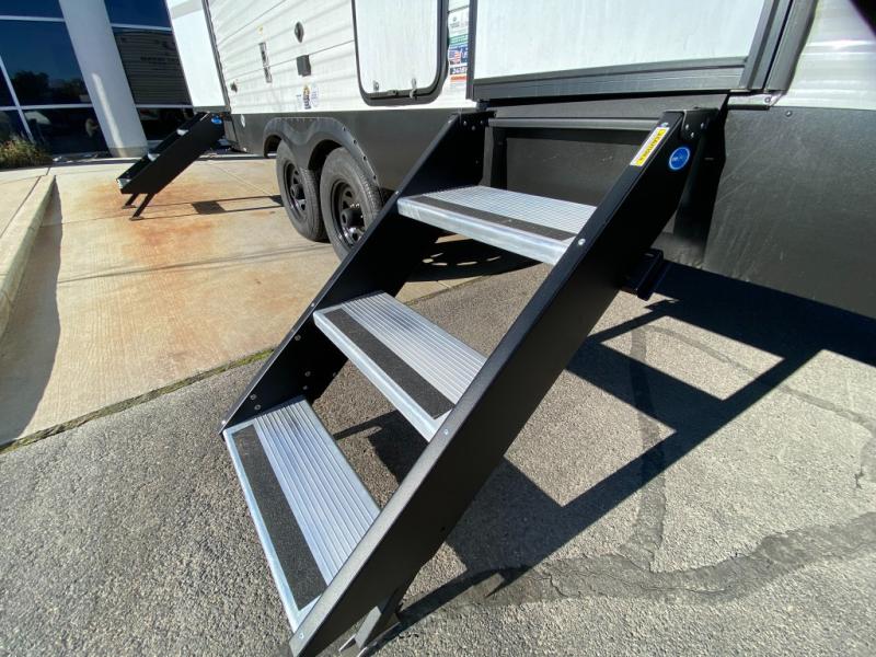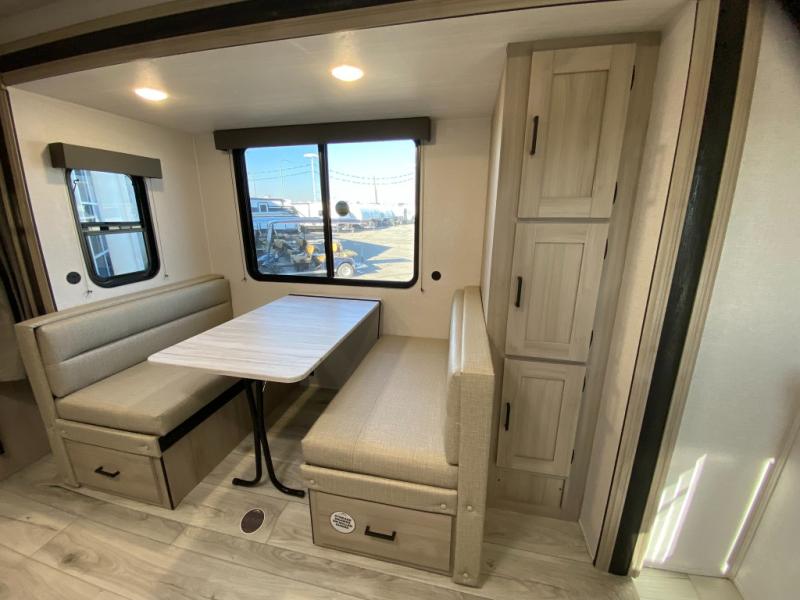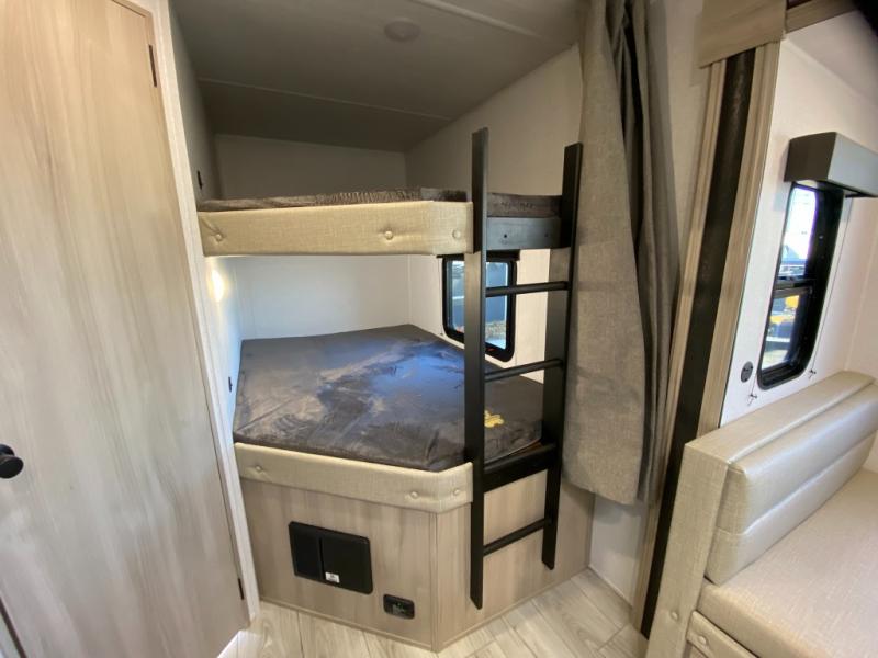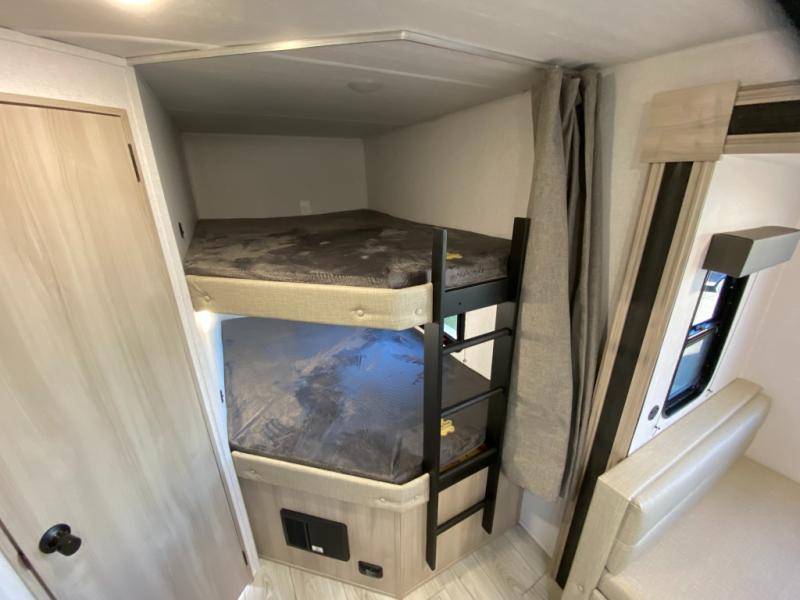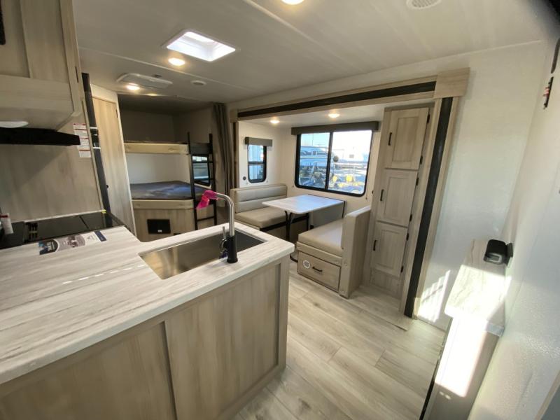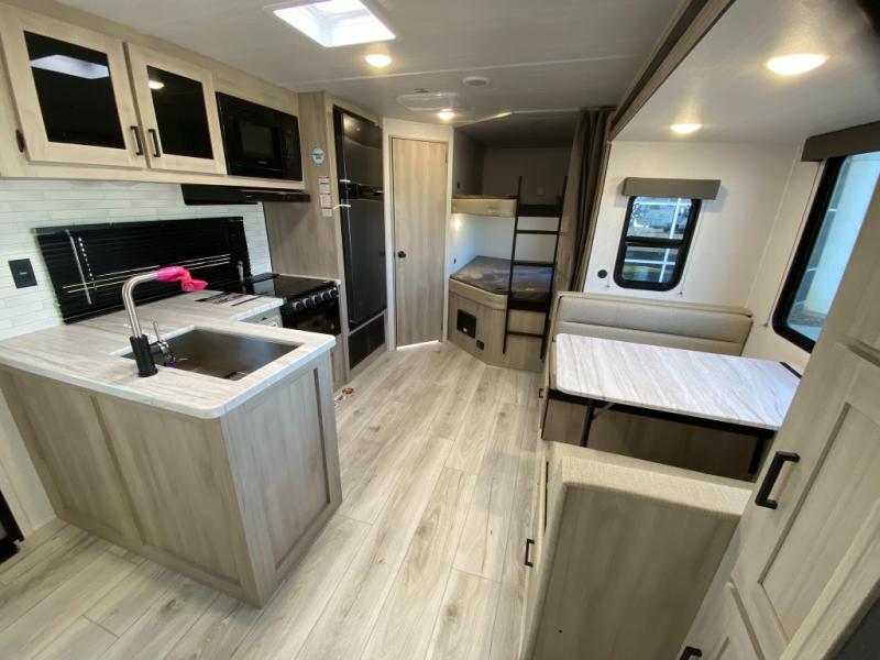 Head to the lake in this travel trailer with a large slide out for more space and comfort and additional sleeping space provided by the double-size bunks! Once you arrive, you can put out the 16' power awning, unload the pass-through storage, and make lunch on the outdoor kitchen with a pull-out griddle and refrigerator. The booth dinette inside can be used as dining space, and there is storage underneath here for added convenience. You will also find a full interior kitchen, and the full bath includes one of the dual entry doors for added convenience. When you're ready for some shut-eye, the king bed in the front private bedroom will feel just like home. There are also dual wardrobes and nightstands to keep your things tidy!