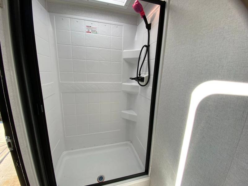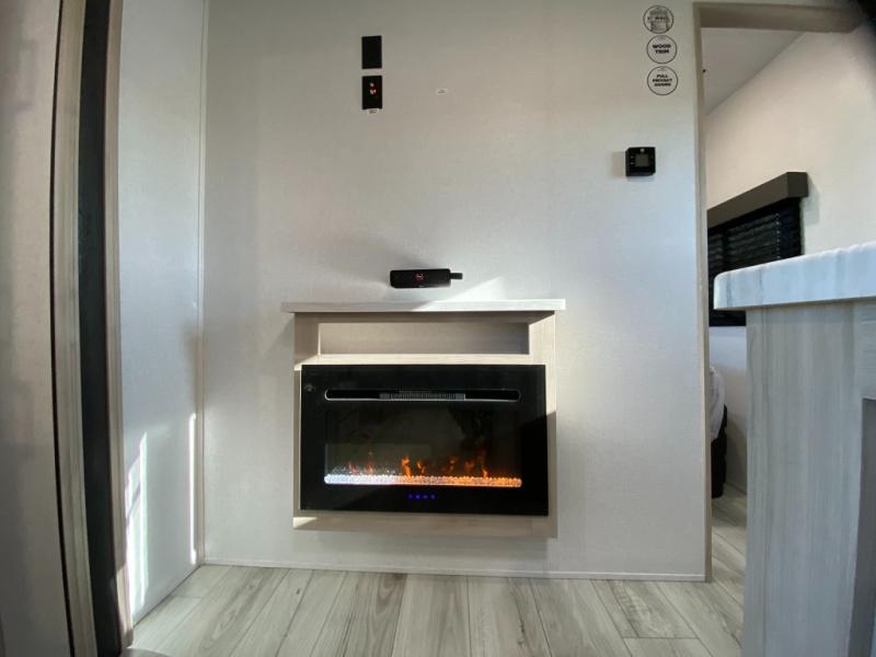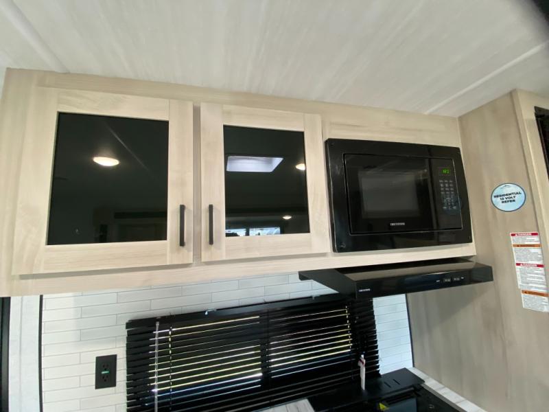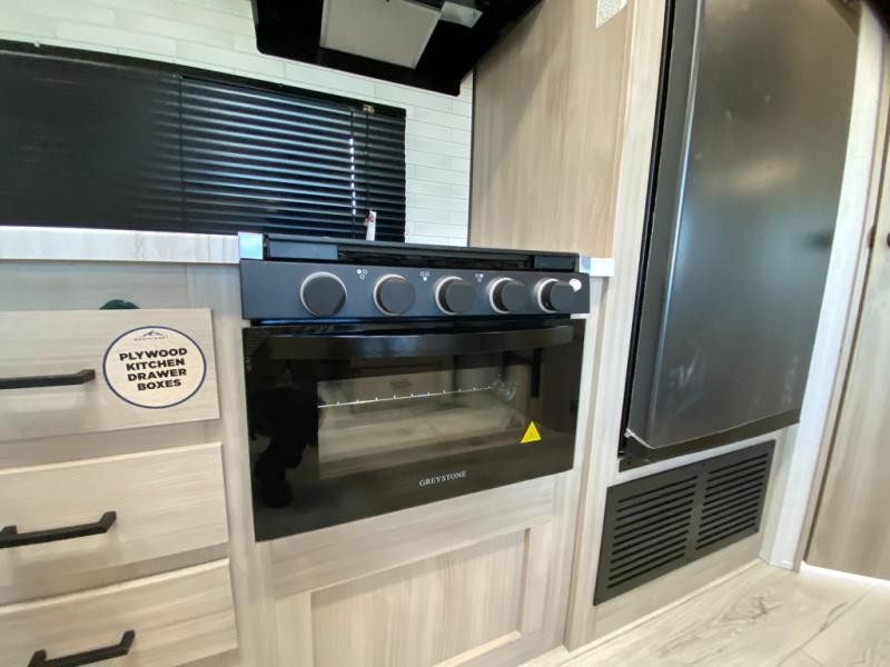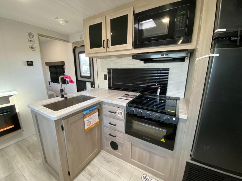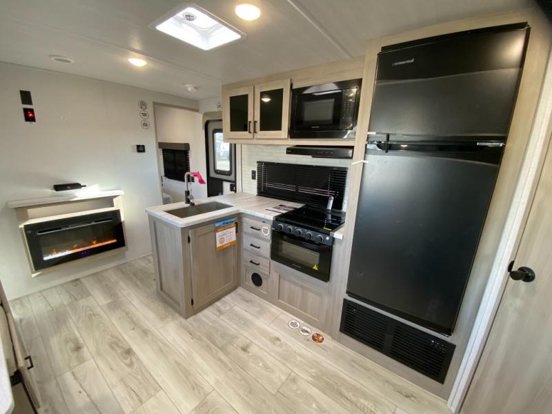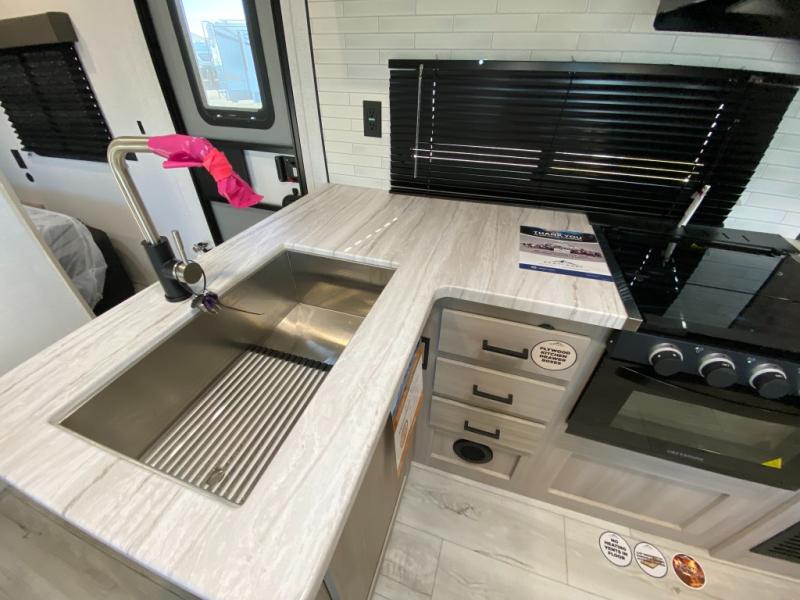 Head to the lake in this travel trailer with a large slide out for more space and comfort and additional sleeping space provided by the double-size bunks! Once you arrive, you can put out the 16' power awning, unload the pass-through storage, and make lunch on the outdoor kitchen with a pull-out griddle and refrigerator. The booth dinette inside can be used as dining space, and there is storage underneath here for added convenience. You will also find a full interior kitchen, and the full bath includes one of the dual entry doors for added convenience. When you're ready for some shut-eye, the king bed in the front private bedroom will feel just like home. There are also dual wardrobes and nightstands to keep your things tidy!