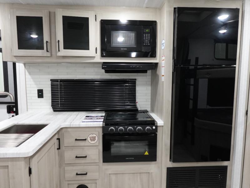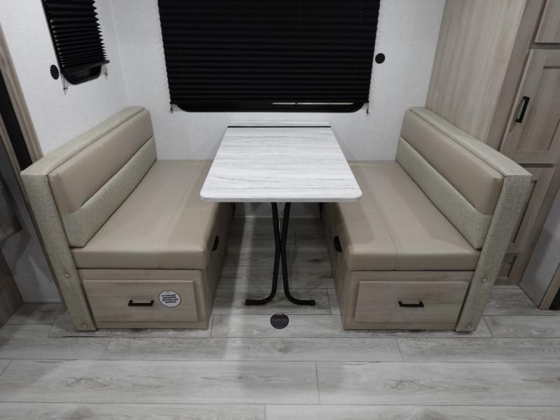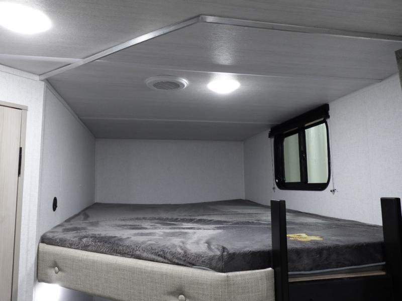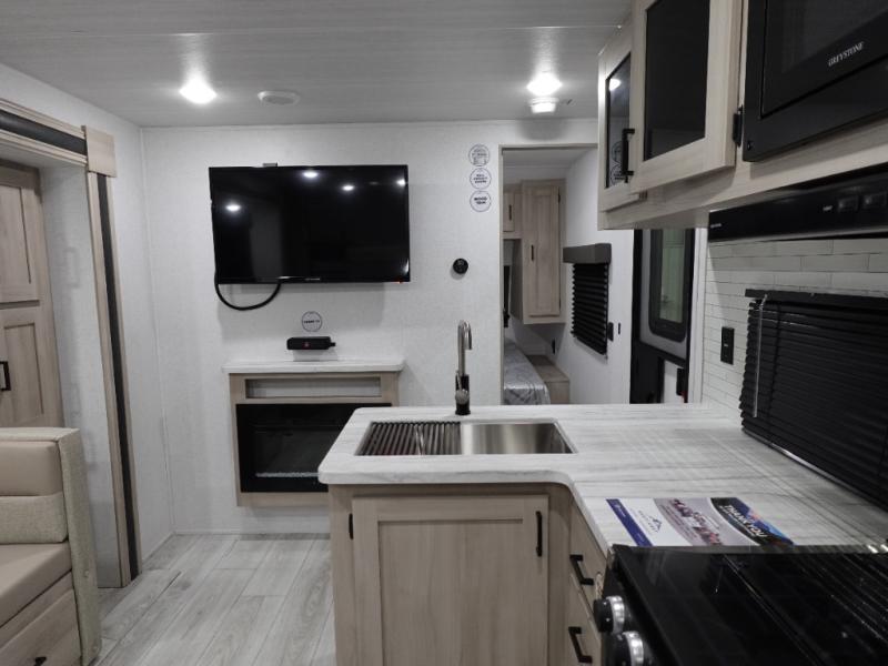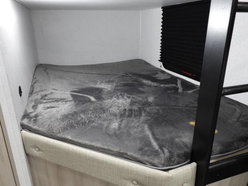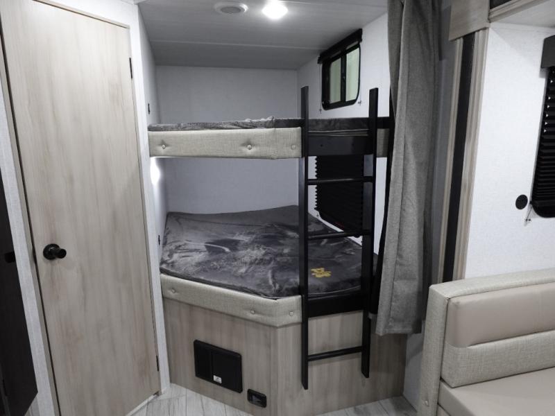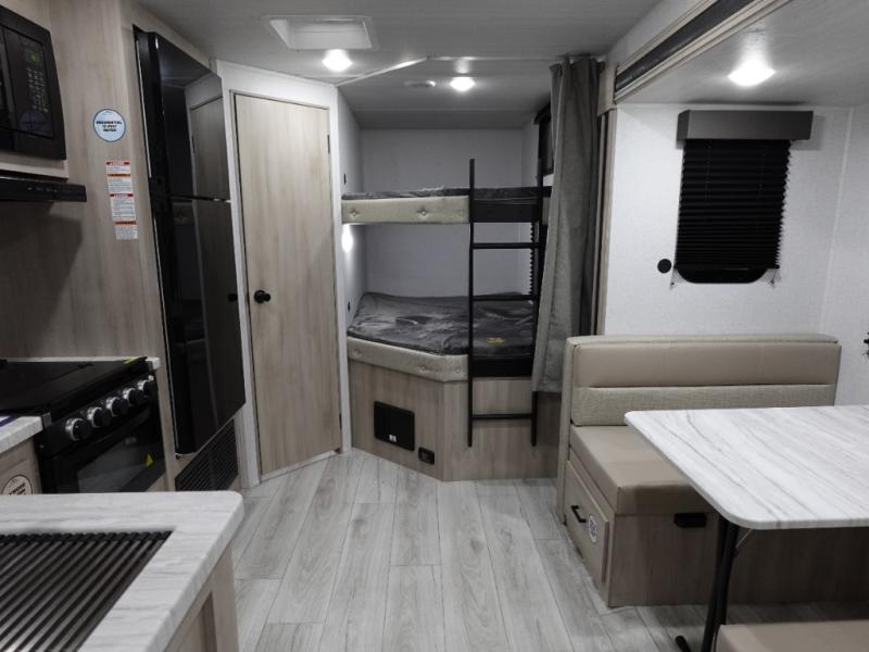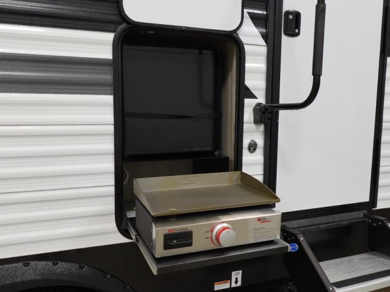 Head to the lake in this travel trailer with a large slide out for more space and comfort and additional sleeping space provided by the double-size bunks! Once you arrive, you can put out the 16' power awning, unload the pass-through storage, and make lunch on the outdoor kitchen with a pull-out griddle and refrigerator. The booth dinette inside can be used as dining space, and there is storage underneath here for added convenience. You will also find a full interior kitchen, and the full bath includes one of the dual entry doors for added convenience. When you're ready for some shut-eye, the king bed in the front private bedroom will feel just like home. There are also dual wardrobes and nightstands to keep your things tidy!