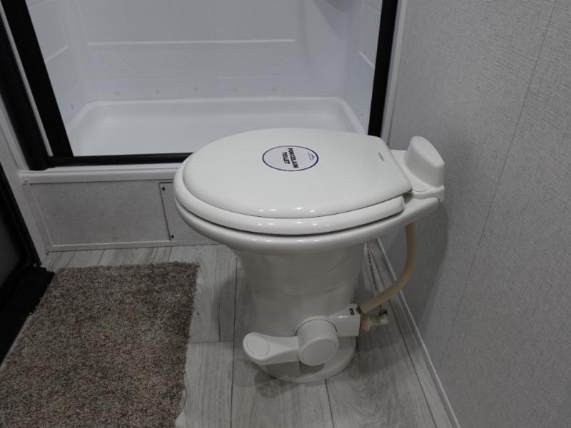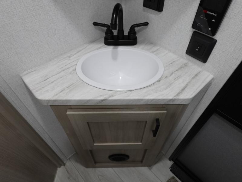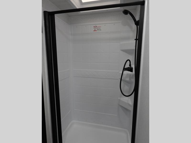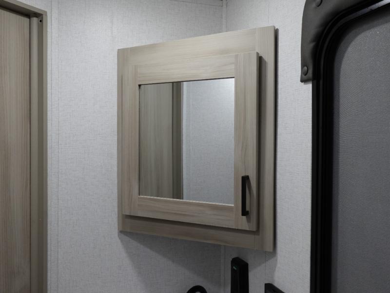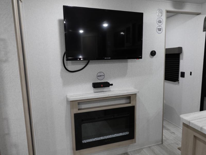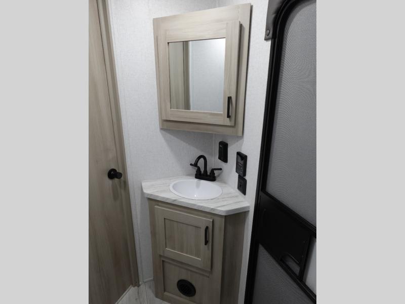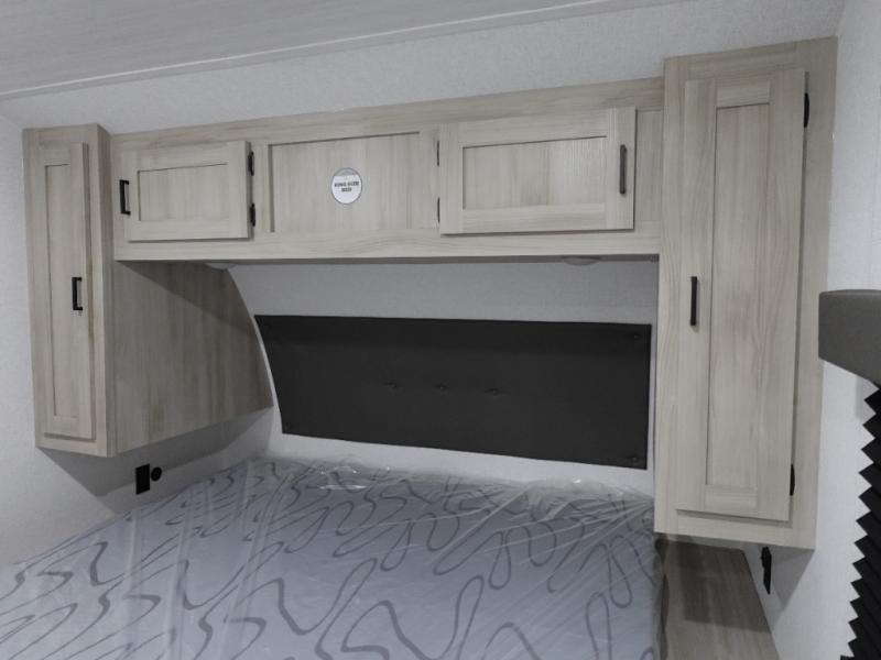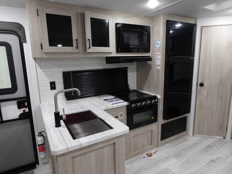 Head to the lake in this travel trailer with a large slide out for more space and comfort and additional sleeping space provided by the double-size bunks! Once you arrive, you can put out the 16' power awning, unload the pass-through storage, and make lunch on the outdoor kitchen with a pull-out griddle and refrigerator. The booth dinette inside can be used as dining space, and there is storage underneath here for added convenience. You will also find a full interior kitchen, and the full bath includes one of the dual entry doors for added convenience. When you're ready for some shut-eye, the king bed in the front private bedroom will feel just like home. There are also dual wardrobes and nightstands to keep your things tidy!
