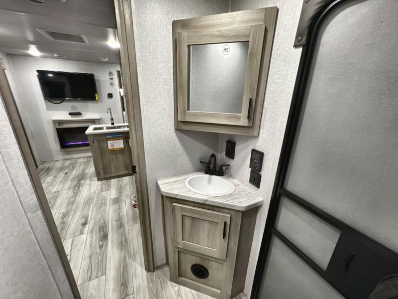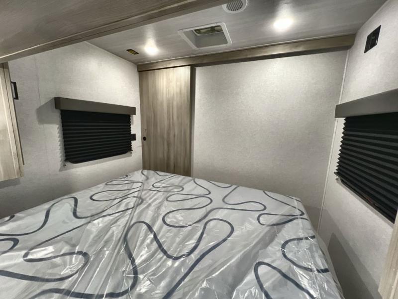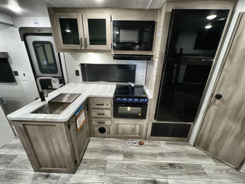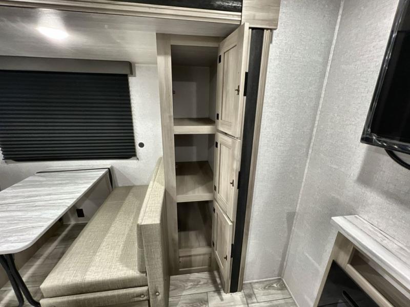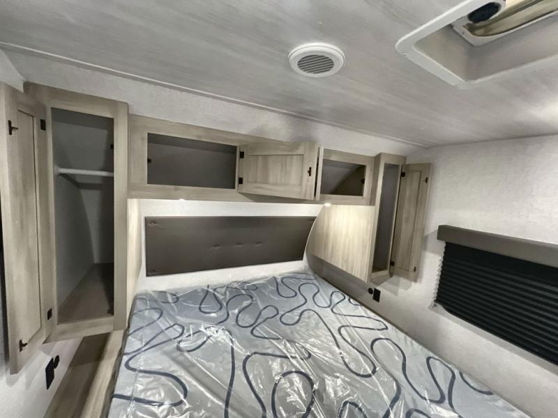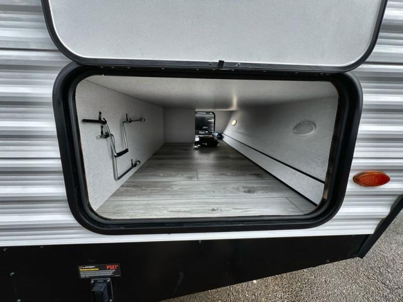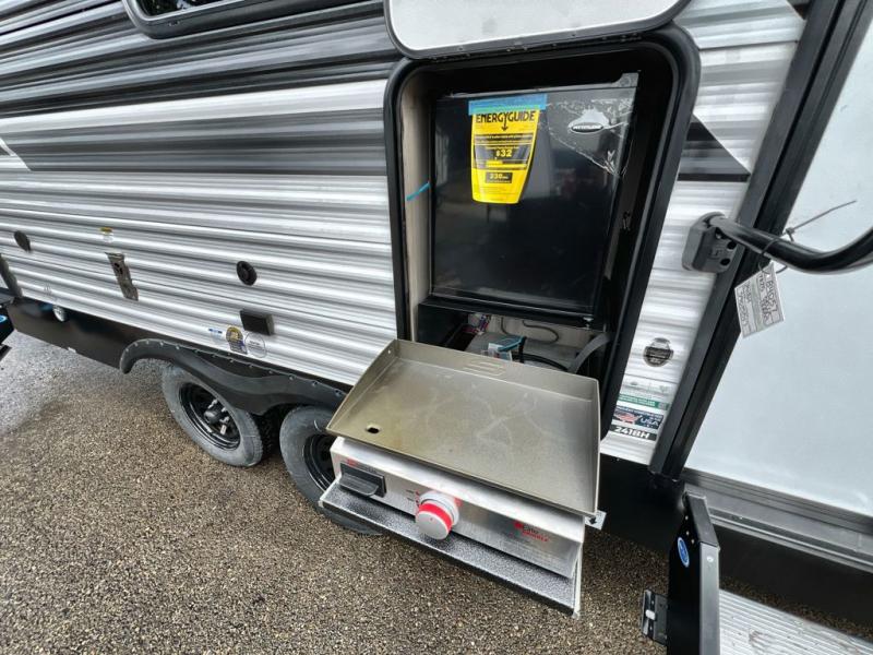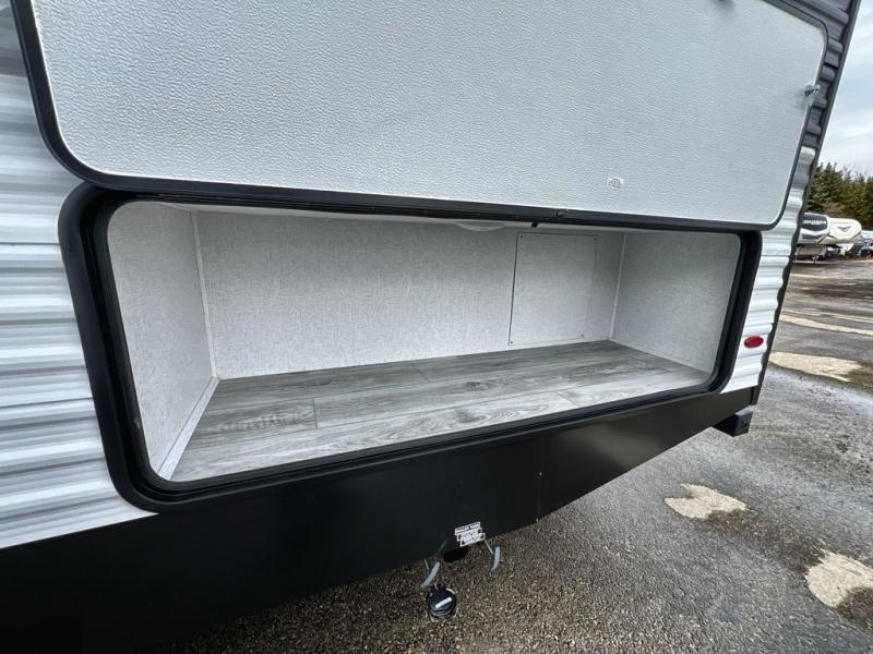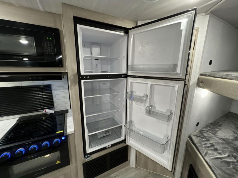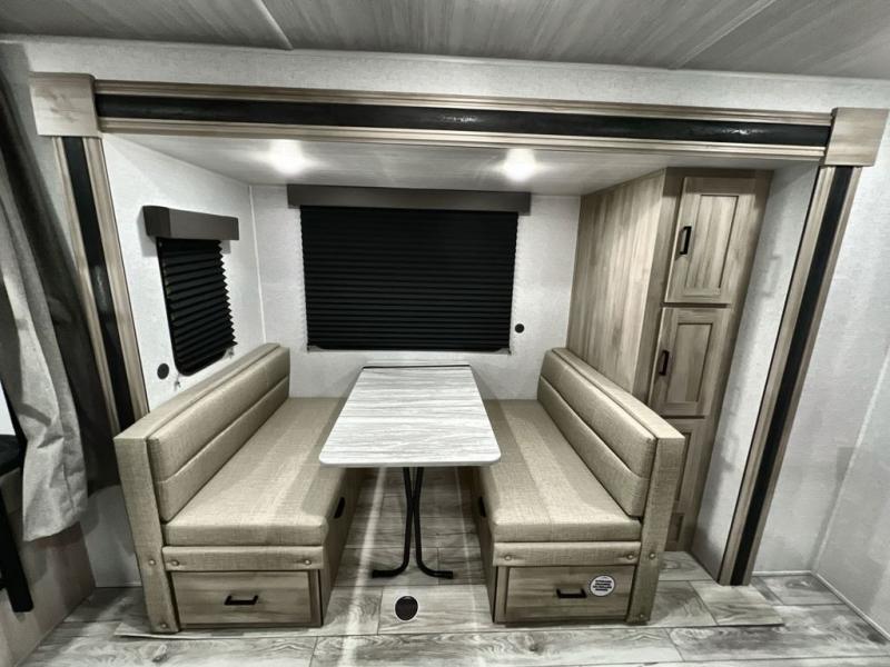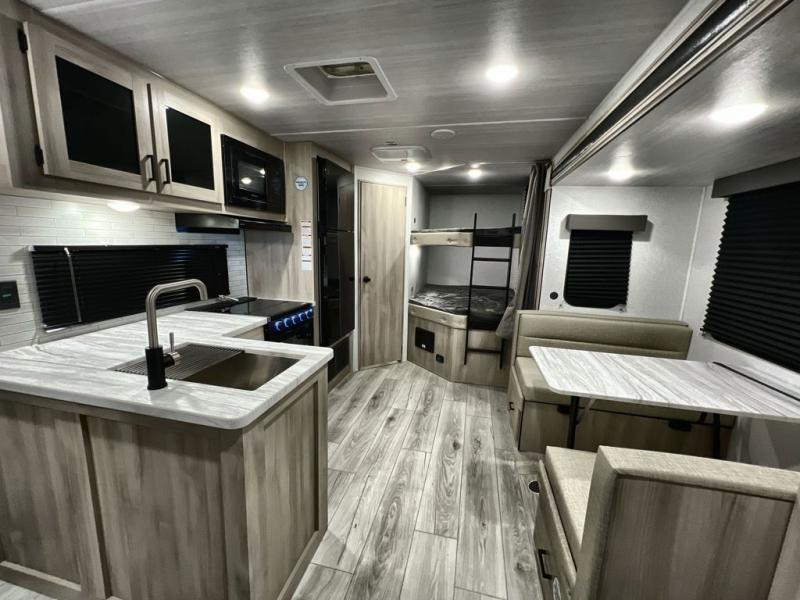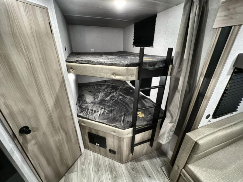 Head to the lake in this travel trailer with a large slide out for more space and comfort and additional sleeping space provided by the double-size bunks! Once you arrive, you can put out the 16' power awning, unload the pass-through storage, and make lunch on the outdoor kitchen with a pull-out griddle and refrigerator. The booth dinette inside can be used as dining space, and there is storage underneath here for added convenience. You will also find a full interior kitchen, and the full bath includes one of the dual entry doors for added convenience. When you're ready for some shut-eye, the king bed in the front private bedroom will feel just like home. There are also dual wardrobes and nightstands to keep your things tidy!