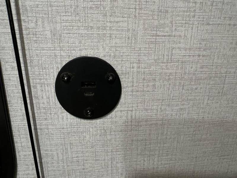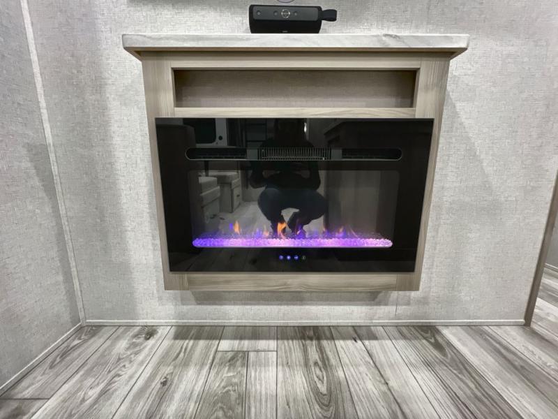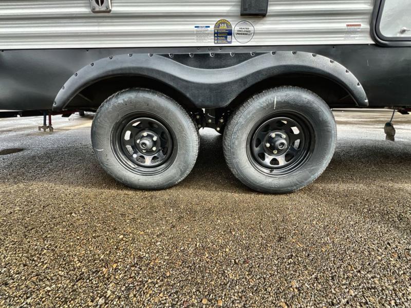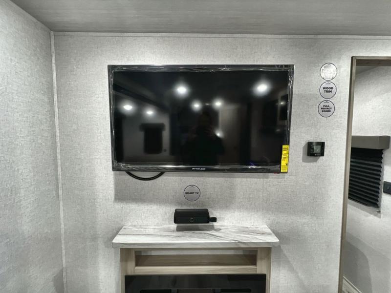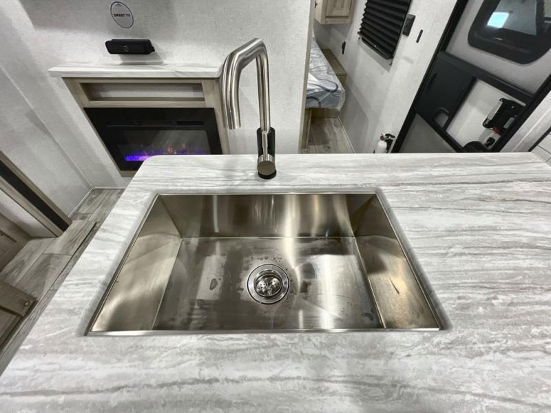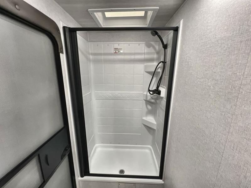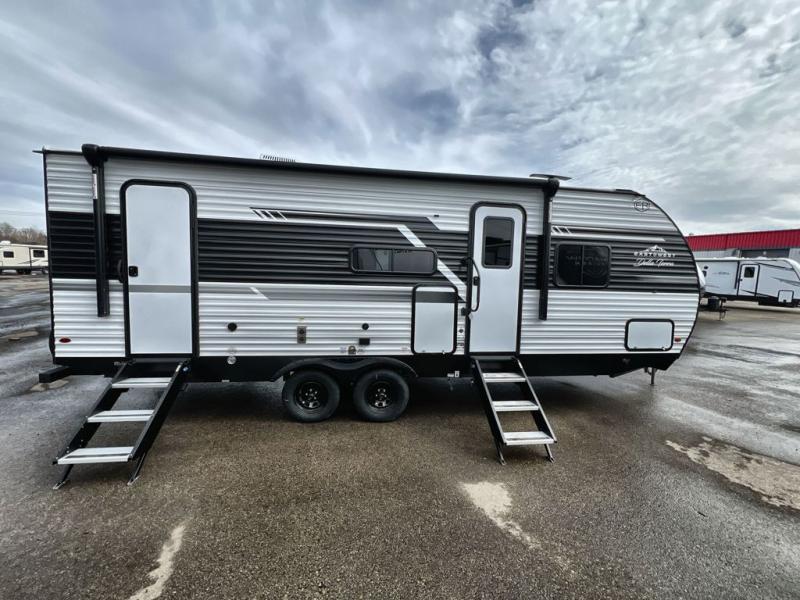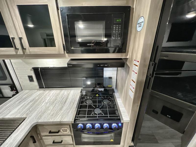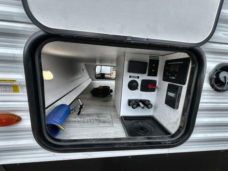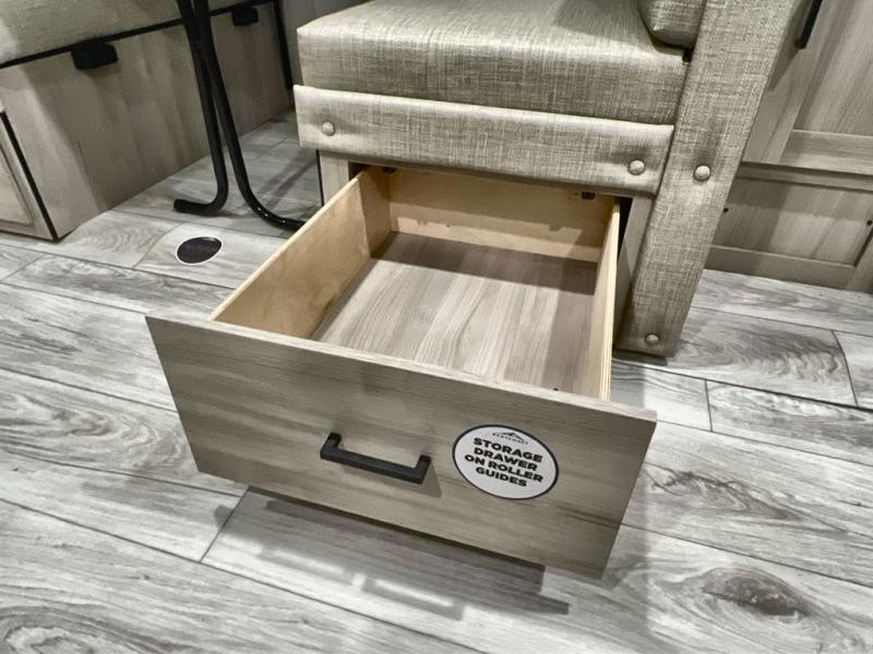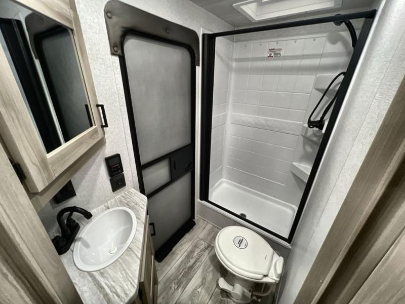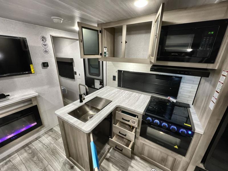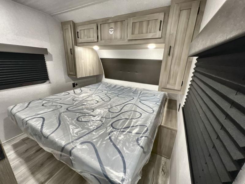 Head to the lake in this travel trailer with a large slide out for more space and comfort and additional sleeping space provided by the double-size bunks! Once you arrive, you can put out the 16' power awning, unload the pass-through storage, and make lunch on the outdoor kitchen with a pull-out griddle and refrigerator. The booth dinette inside can be used as dining space, and there is storage underneath here for added convenience. You will also find a full interior kitchen, and the full bath includes one of the dual entry doors for added convenience. When you're ready for some shut-eye, the king bed in the front private bedroom will feel just like home. There are also dual wardrobes and nightstands to keep your things tidy!