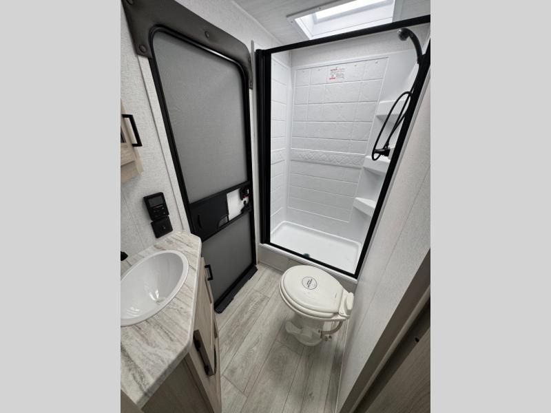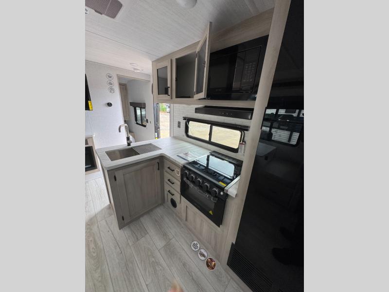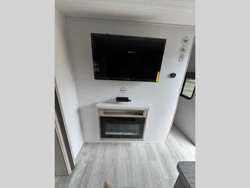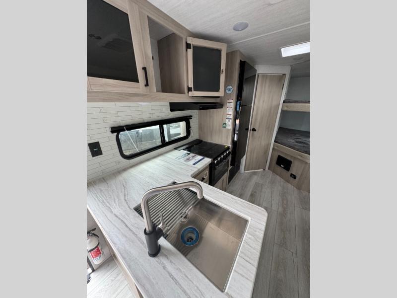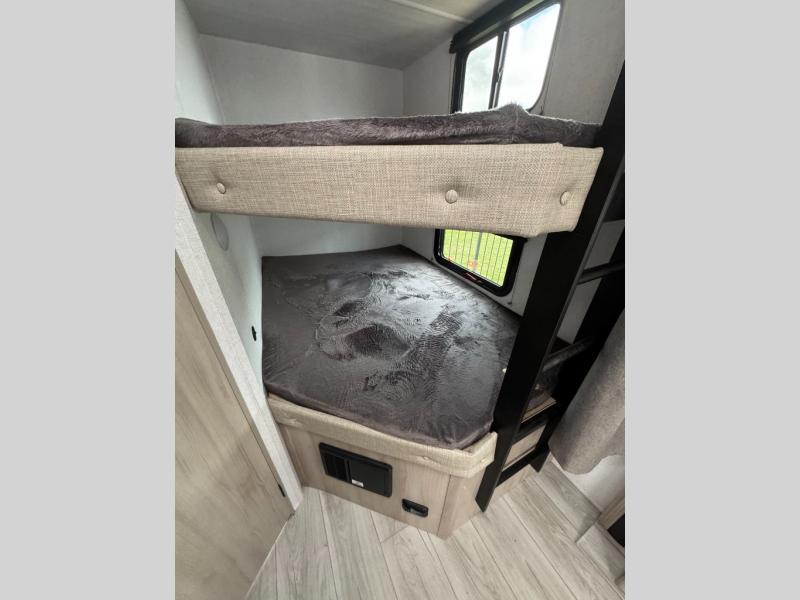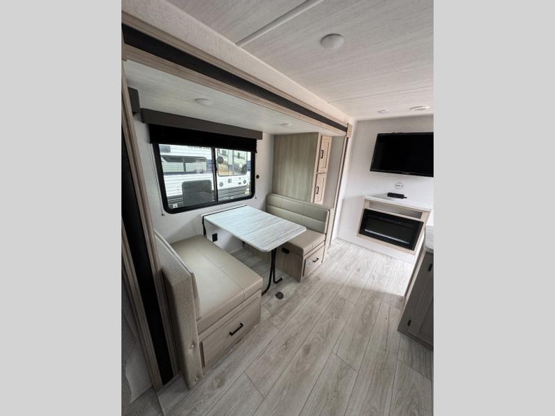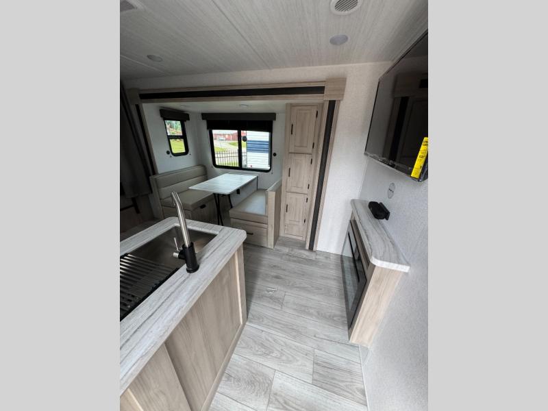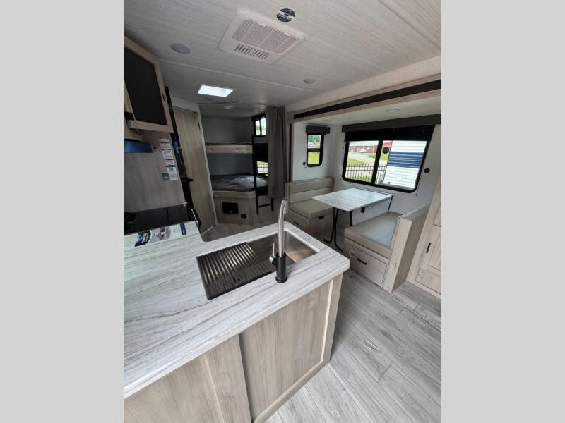 Head to the lake in this travel trailer with a large slide out for more space and comfort and additional sleeping space provided by the double-size bunks! Once you arrive, you can put out the 16' power awning, unload the pass-through storage, and make lunch on the outdoor kitchen with a pull-out griddle and refrigerator. The booth dinette inside can be used as dining space, and there is storage underneath here for added convenience. You will also find a full interior kitchen, and the full bath includes one of the dual entry doors for added convenience. When you're ready for some shut-eye, the king bed in the front private bedroom will feel just like home. There are also dual wardrobes and nightstands to keep your things tidy!
