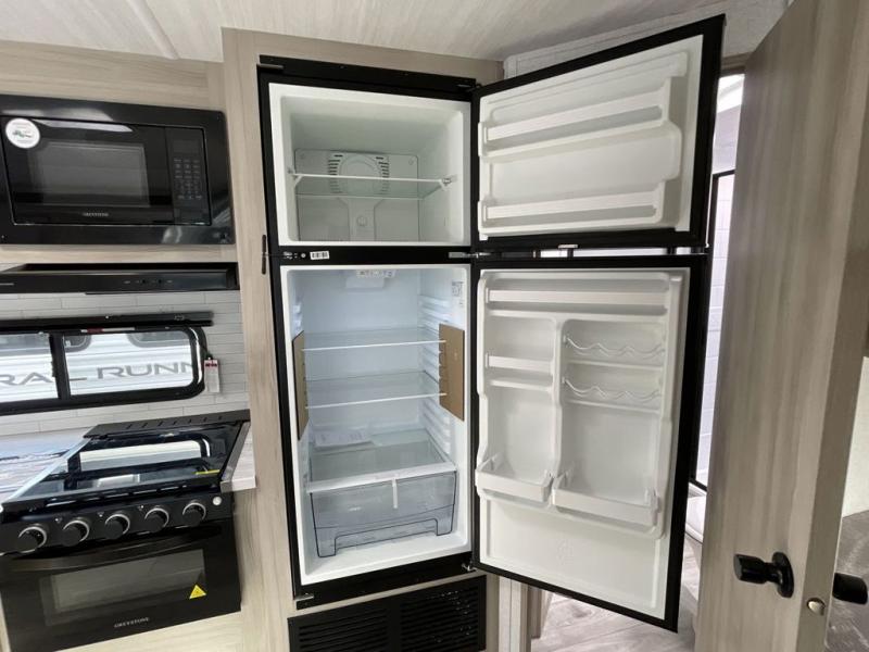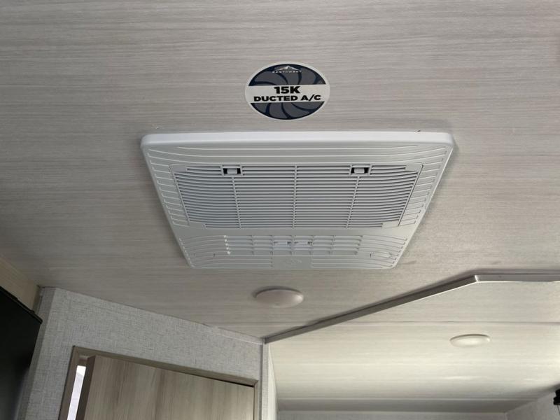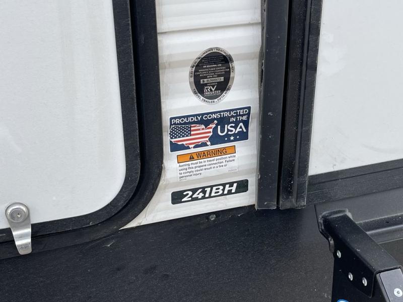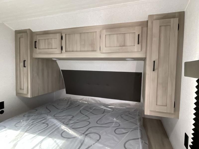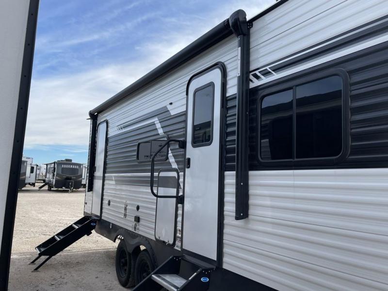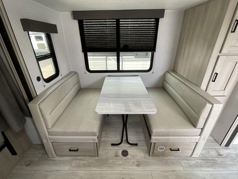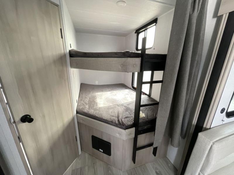 Head to the lake in this travel trailer with a large slide out for more space and comfort and additional sleeping space provided by the double-size bunks! Once you arrive, you can put out the 16' power awning, unload the pass-through storage, and make lunch on the outdoor kitchen with a pull-out griddle and refrigerator. The booth dinette inside can be used as dining space, and there is storage underneath here for added convenience. You will also find a full interior kitchen, and the full bath includes one of the dual entry doors for added convenience. When you're ready for some shut-eye, the king bed in the front private bedroom will feel just like home. There are also dual wardrobes and nightstands to keep your things tidy!