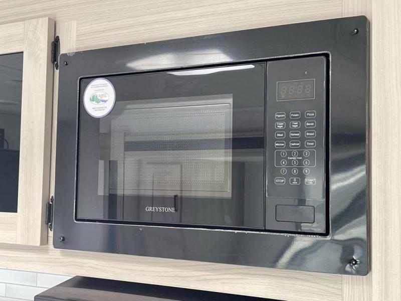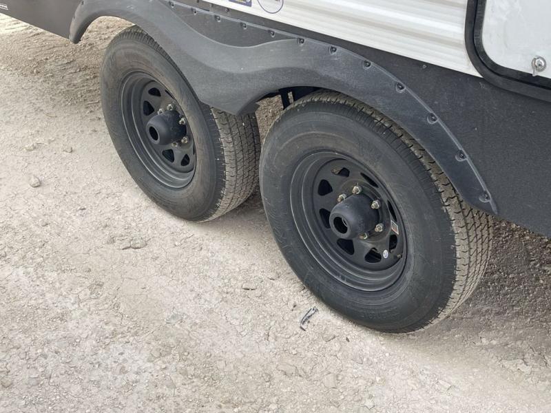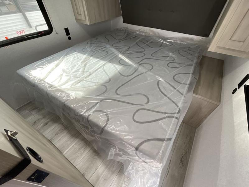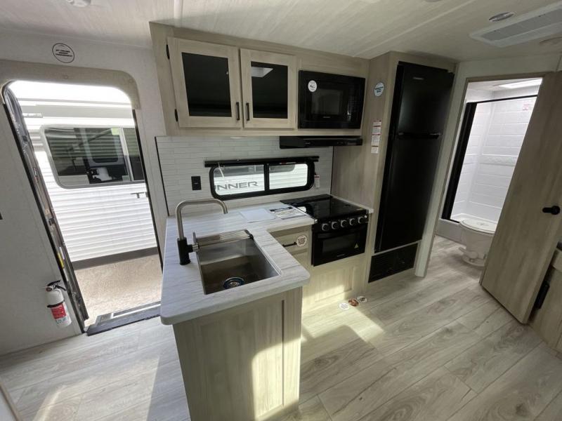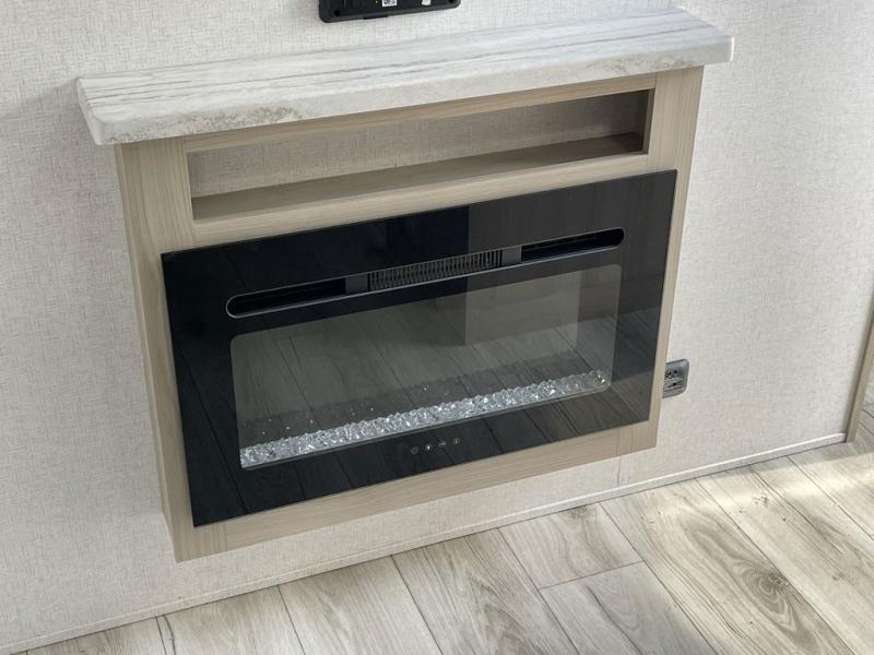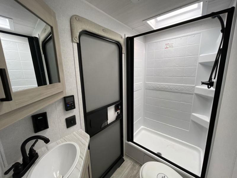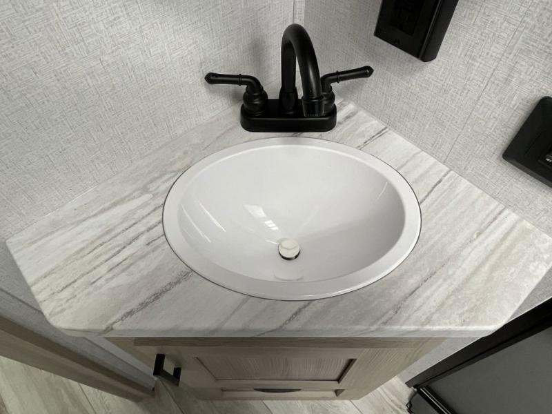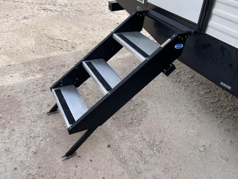 Head to the lake in this travel trailer with a large slide out for more space and comfort and additional sleeping space provided by the double-size bunks! Once you arrive, you can put out the 16' power awning, unload the pass-through storage, and make lunch on the outdoor kitchen with a pull-out griddle and refrigerator. The booth dinette inside can be used as dining space, and there is storage underneath here for added convenience. You will also find a full interior kitchen, and the full bath includes one of the dual entry doors for added convenience. When you're ready for some shut-eye, the king bed in the front private bedroom will feel just like home. There are also dual wardrobes and nightstands to keep your things tidy!