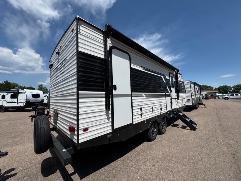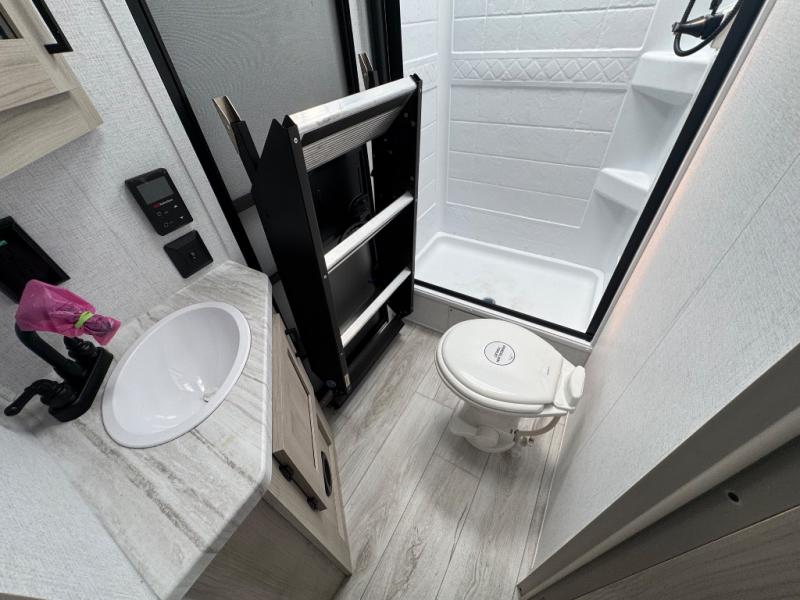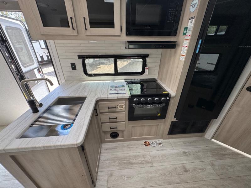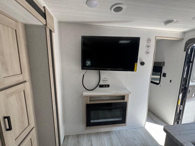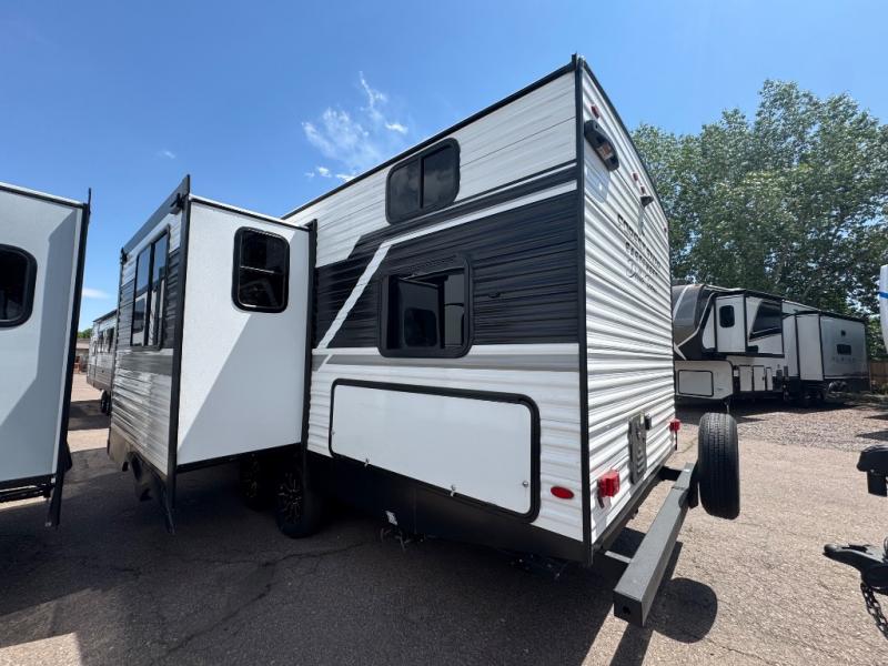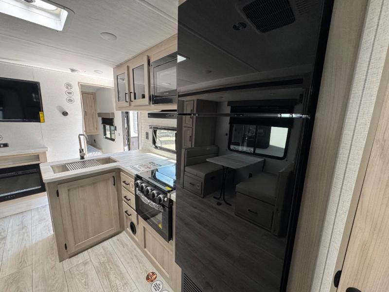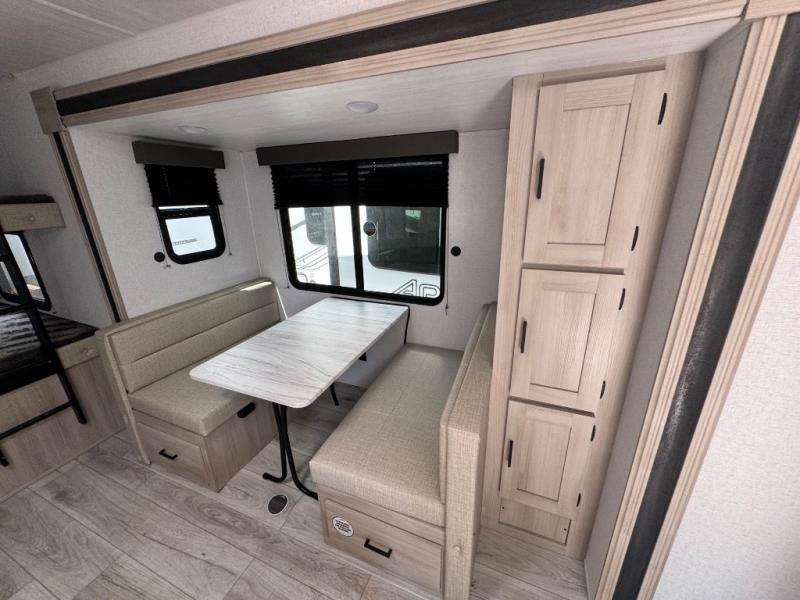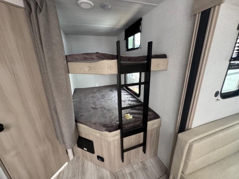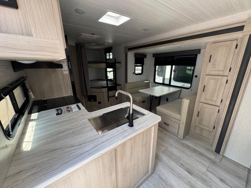 Head to the lake in this travel trailer with a large slide out for more space and comfort and additional sleeping space provided by the double-size bunks! Once you arrive, you can put out the 16' power awning, unload the pass-through storage, and make lunch on the outdoor kitchen with a pull-out griddle and refrigerator. The booth dinette inside can be used as dining space, and there is storage underneath here for added convenience. You will also find a full interior kitchen, and the full bath includes one of the dual entry doors for added convenience. When you're ready for some shut-eye, the king bed in the front private bedroom will feel just like home. There are also dual wardrobes and nightstands to keep your things tidy!