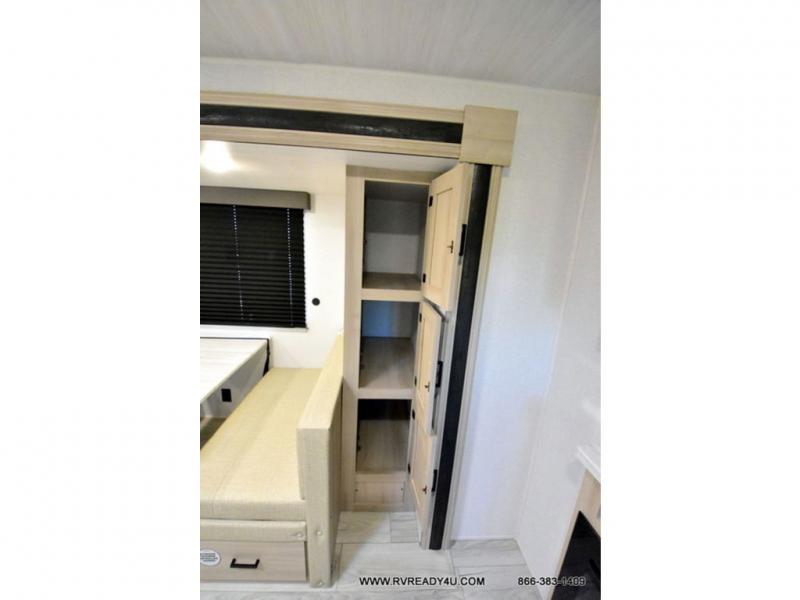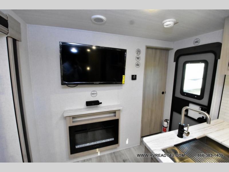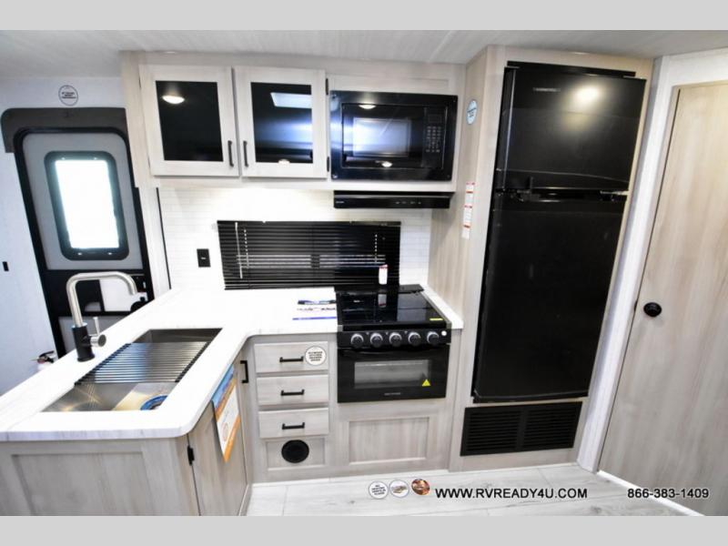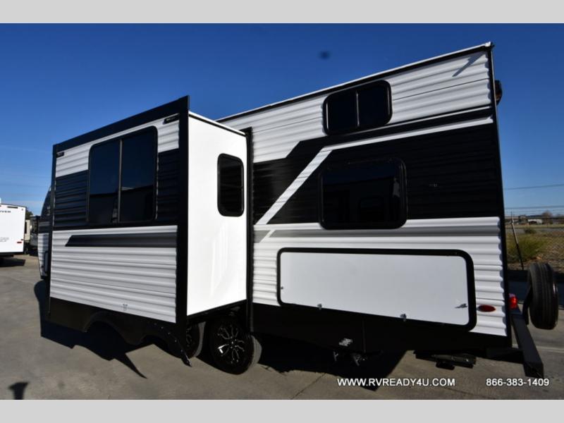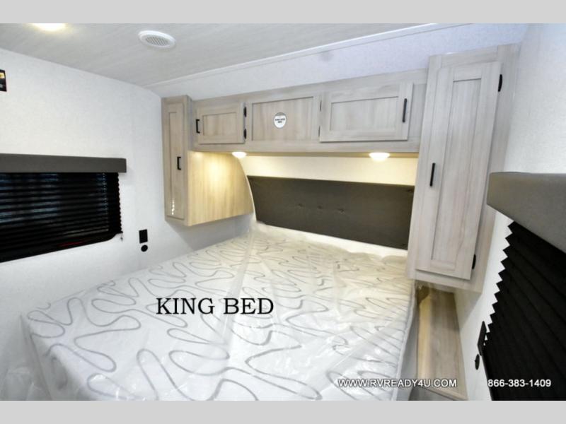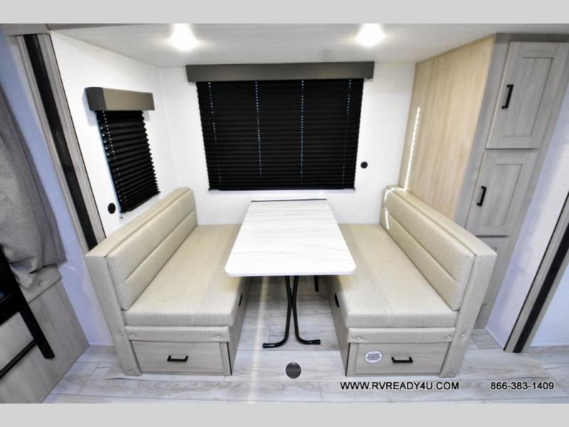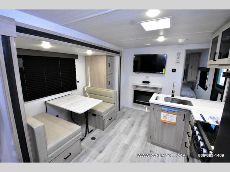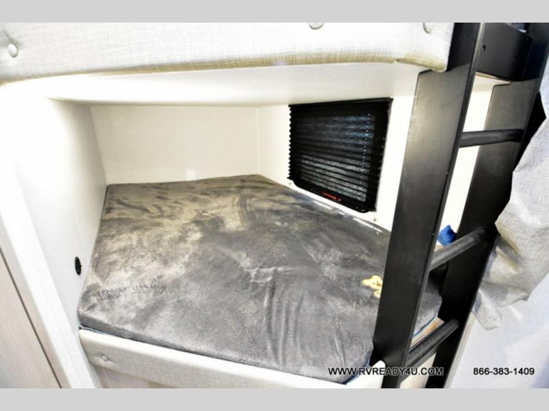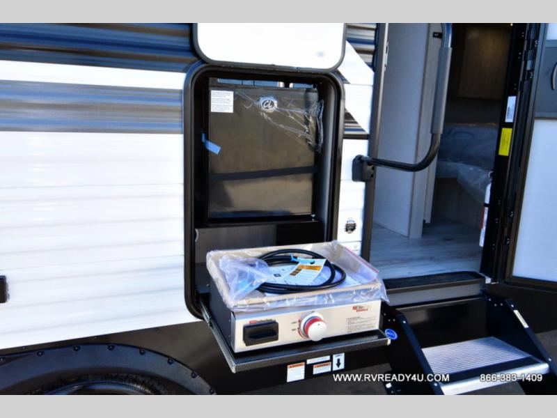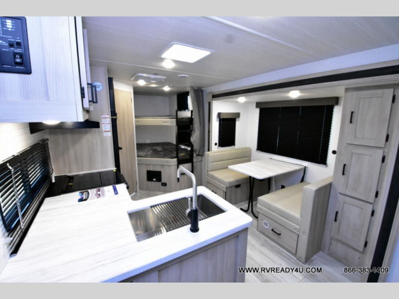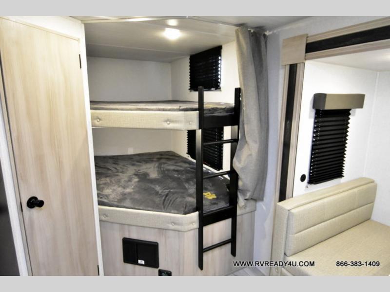Head to the lake in this travel trailer with a large slide out for more space and comfort and additional sleeping space provided by the double-size bunks! Once you arrive, you can put out the 16' power awning, unload the pass-through storage, and make lunch on the outdoor kitchen with a pull-out griddle and refrigerator. The booth dinette inside can be used as dining space, and there is storage underneath here for added convenience. You will also find a full interior kitchen, and the full bath includes one of the dual entry doors for added convenience. When you're ready for some shut-eye, the king bed in the front private bedroom will feel just like home. There are also dual wardrobes and nightstands to keep your things tidy!