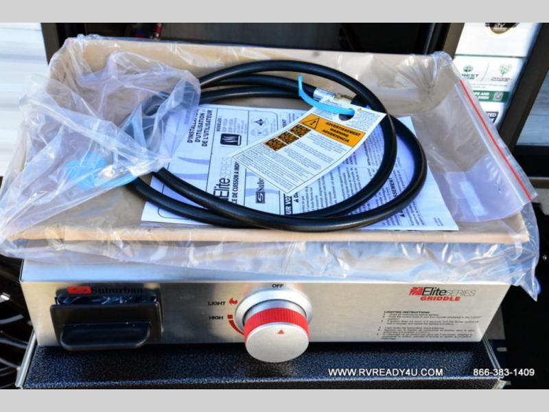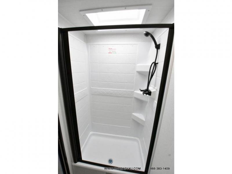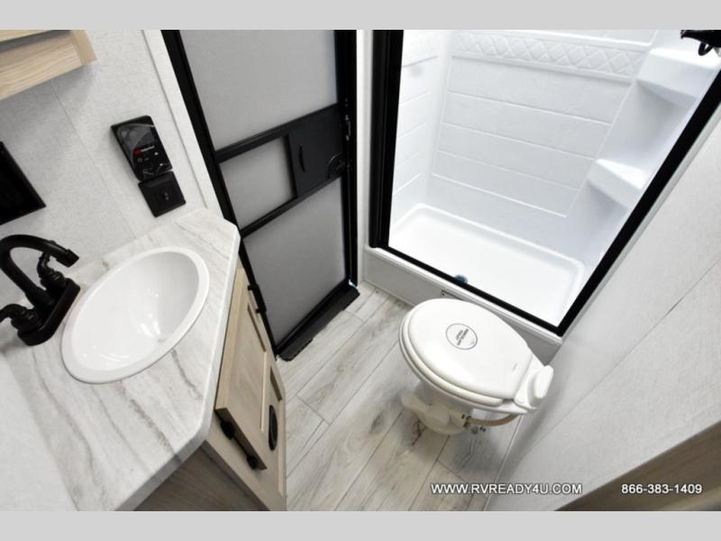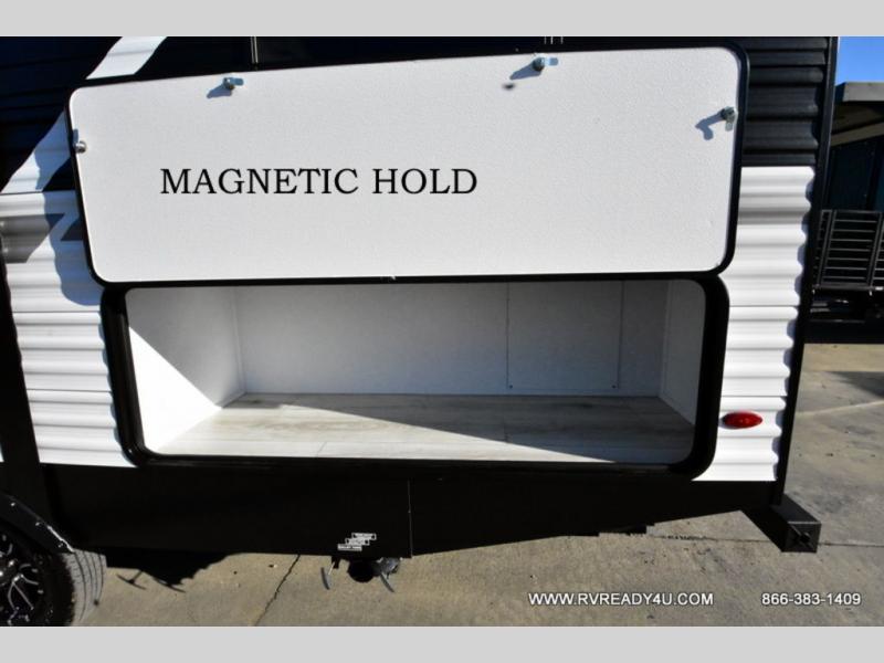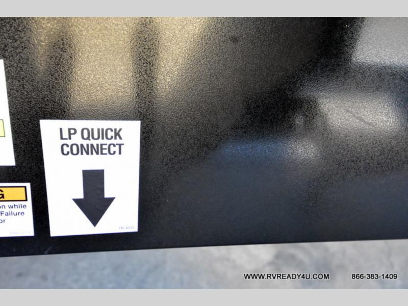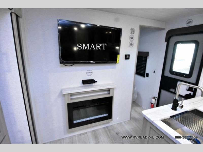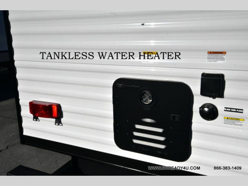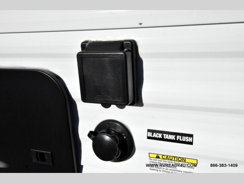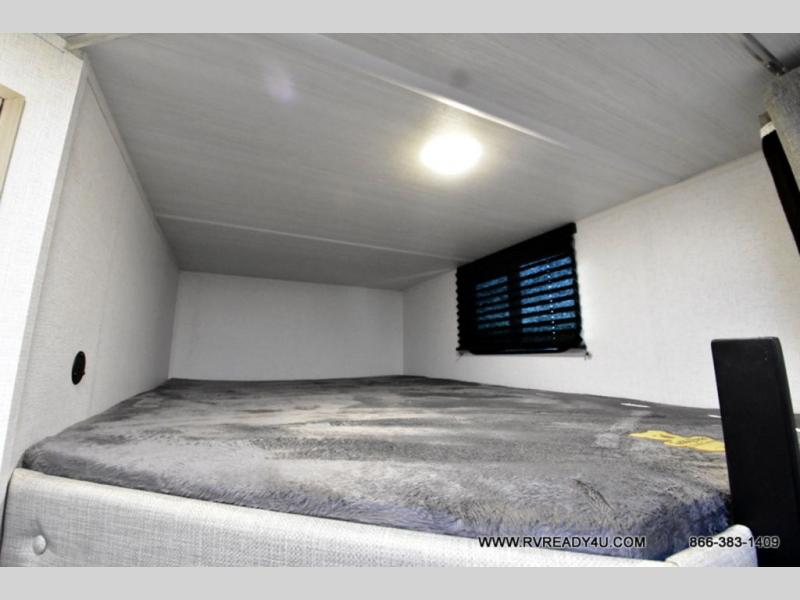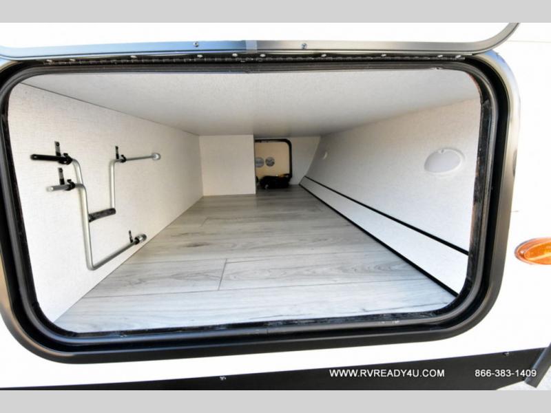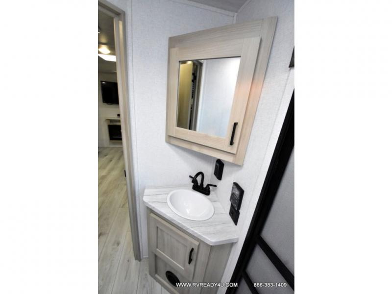 Head to the lake in this travel trailer with a large slide out for more space and comfort and additional sleeping space provided by the double-size bunks! Once you arrive, you can put out the 16' power awning, unload the pass-through storage, and make lunch on the outdoor kitchen with a pull-out griddle and refrigerator. The booth dinette inside can be used as dining space, and there is storage underneath here for added convenience. You will also find a full interior kitchen, and the full bath includes one of the dual entry doors for added convenience. When you're ready for some shut-eye, the king bed in the front private bedroom will feel just like home. There are also dual wardrobes and nightstands to keep your things tidy!
