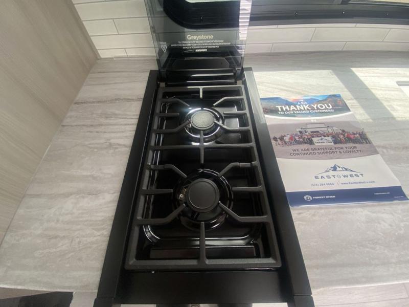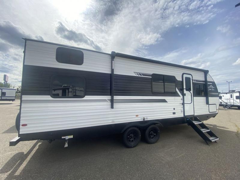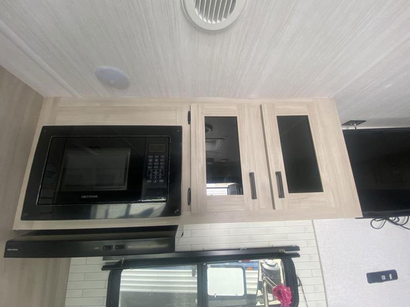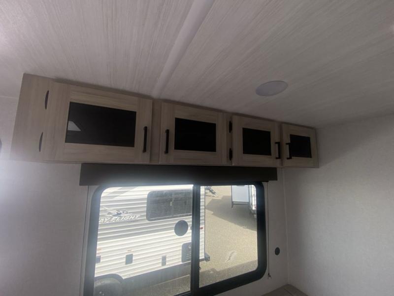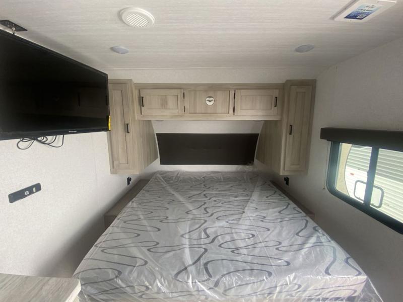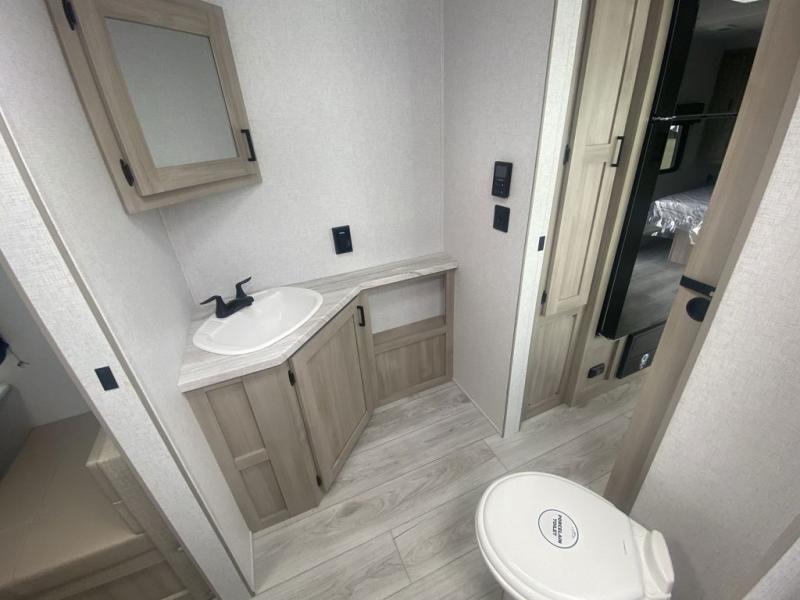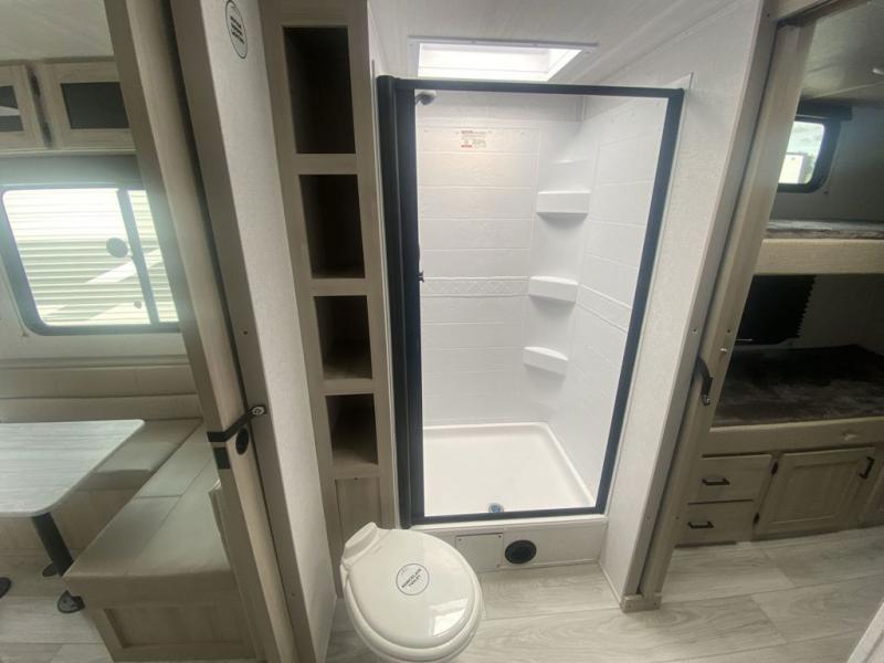There is much to love in this travel trailer! Starting with the rear private bunkhouse which has a set of double bunk beds with storage underneath and a bunk over a booth dinette with storage underneath it too. The front king bed also has storage underneath it, as well as wardrobes and nightstands on either side of it for your clothes and books. The chef can prepare their best home cooked meals in the fully equipped kitchen, and everyone can enjoy them at the L-shaped dinette with storage underneath for boardgames to play after dinner. The walk-through bathroom makes it easy for all to access the 30" x 36" shower, and you even have an outside shower to rinse the mud off of your feet before entering inside!