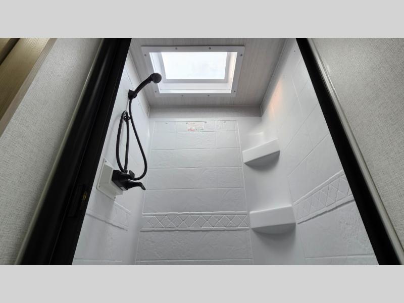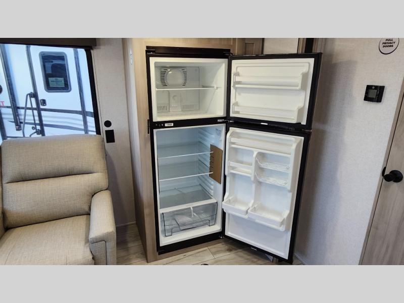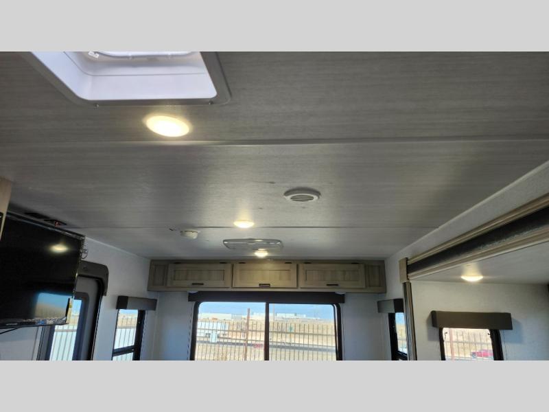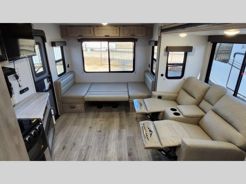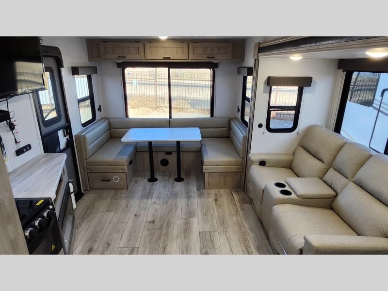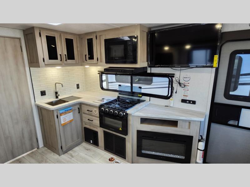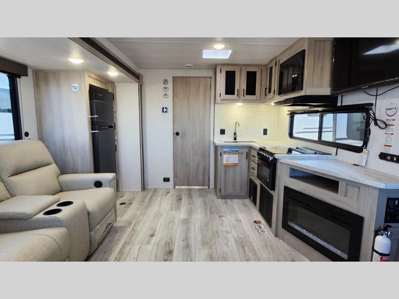 When you are wanting a little more interior space in your next travel trailer, take a look inside! This large slide out widens the main living space so you can easily make meals using full amenities without having to move for someone walking from the front bedroom and walk-through bath to the u-shaped dinette in the back. For sleeping, there is a king-size bed with storage on both sides at the very front of this unit giving you privacy from the rest, and even a private second entry/exit door from within the bedroom. You will find storage beneath the bed for larger items or extra blankets, plus a space saving sliding door. The U-shaped dinette and jack knife sofa offer comfortable seating as well as extra sleeping space for overnight guests, and the fireplace is just a nice feature to enjoy. On the outside, an 18' awning provides a large outdoor living area protected from the elements, and the oversized pass-through will house all of your exterior gear like lawn chairs, outdoor games and rugs, plus so much more!