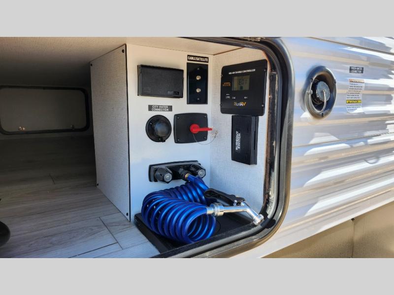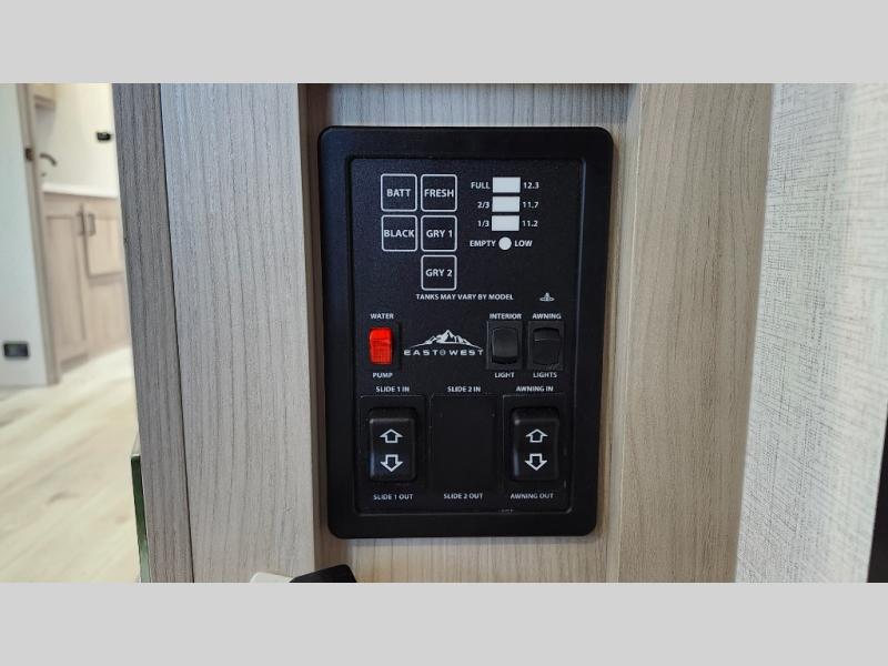 Each Della Terra travel trailer by EAST TO WEST is constructed with an enclosed and heated underbelly and enclosed holding tanks so you can camp all year long. There is also a power tongue jack with an LED light for easy set up and a power awning with LED lights you can rest under after you've unpacked. The Explore Comfort Package comes seamless pressed countertops, kitchen backsplash, window valance package with black night shades, and many more comforts. You will also appreciate the Adventure Outdoor Package with backup camera prep and solar prep, a tankless water heater, an RV grill quick disconnect, and a universal docking station with battery disconnect.