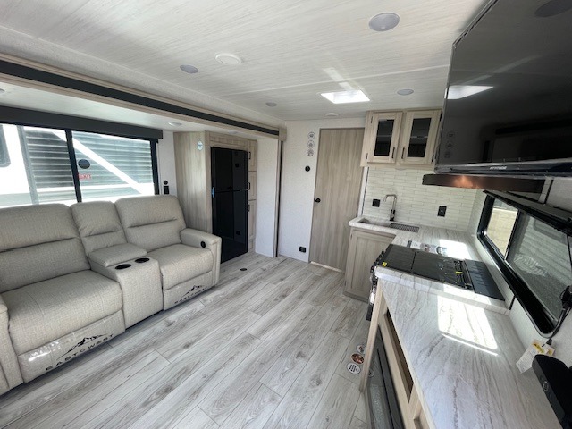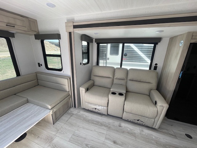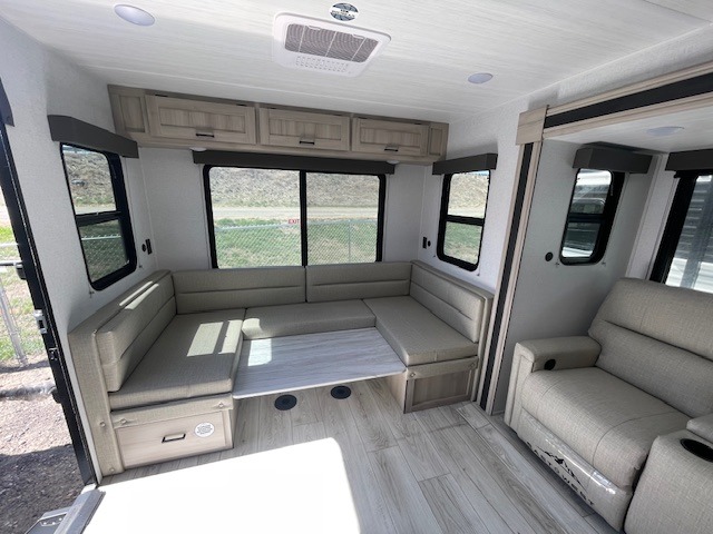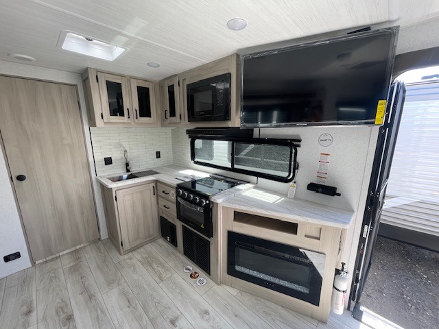 When you are wanting a little more interior space in your next travel trailer, take a look inside! This large slide out widens the main living space so you can easily make meals using full amenities without having to move for someone walking from the front bedroom and walk-through bath to the U-shaped dinette in the back. For sleeping, there is a king-size bed with storage on both sides at the very front of this unit giving you privacy from the rest, and even a private second entry/exit door from within the bedroom. You will find storage beneath the bed for larger items or extra blankets, plus a space saving sliding door. The U-shaped dinette and jackknife sofa offer comfortable seating as well as extra sleeping space for overnight guests, and the fireplace is just a nice feature to enjoy. On the outside, an 18' awning provides a large outdoor living area protected from the elements, and the oversized pass-through will house all of your exterior gear like lawn chairs, outdoor games and rugs, plus so much more!