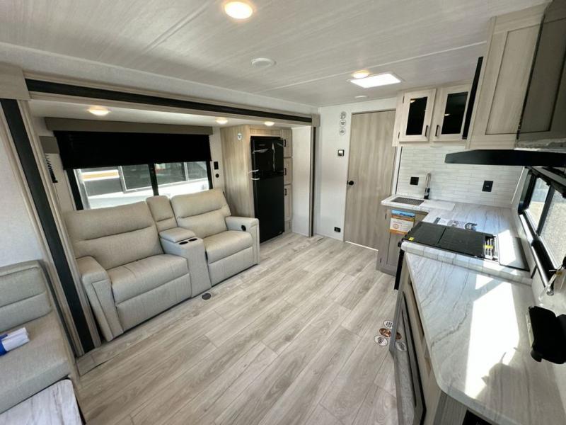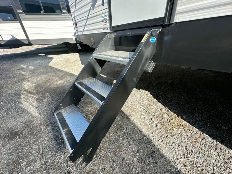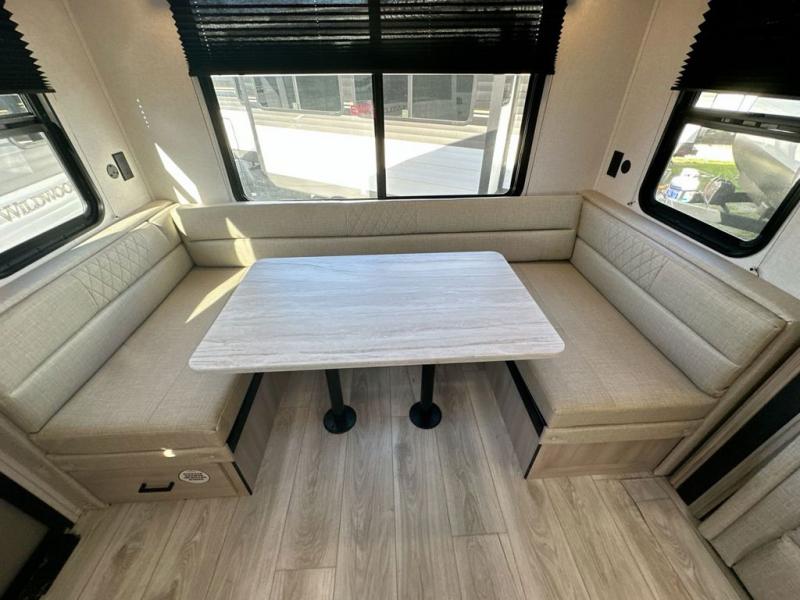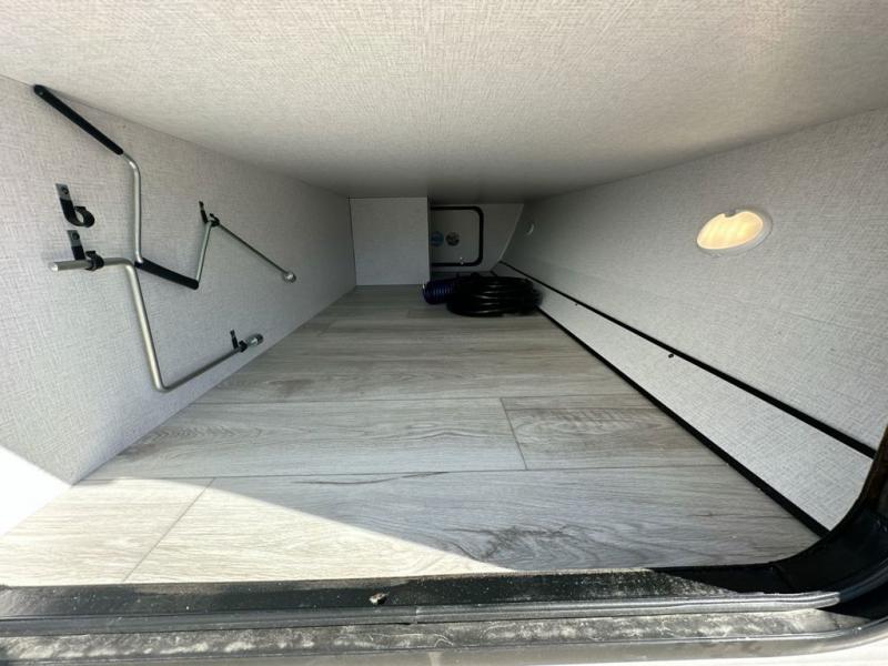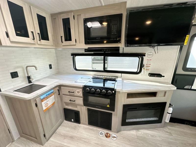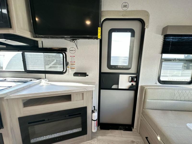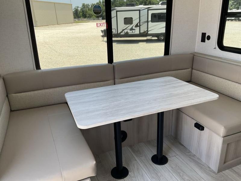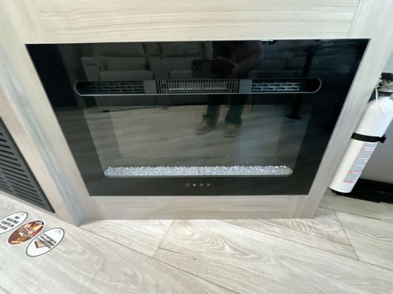 When you are wanting a little more interior space in your next travel trailer, take a look inside! This large slide out widens the main living space so you can easily make meals using full amenities without having to move for someone walking from the front bedroom and walk-through bath to the u-shaped dinette in the back. For sleeping, there is a king-size bed with storage on both sides at the very front of this unit giving you privacy from the rest, and even a private second entry/exit door from within the bedroom. You will find storage beneath the bed for larger items or extra blankets, plus a space saving sliding door. The U-shaped dinette and jack knife sofa offer comfortable seating as well as extra sleeping space for overnight guests, and the fireplace is just a nice feature to enjoy. On the outside, an 18' awning provides a large outdoor living area protected from the elements, and the oversized pass-through will house all of your exterior gear like lawn chairs, outdoor games and rugs, plus so much more!
