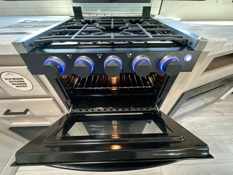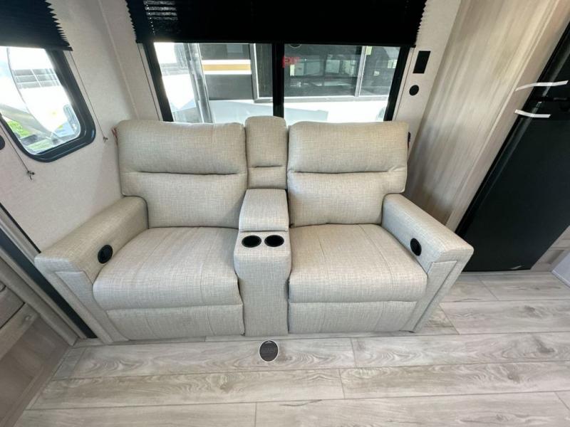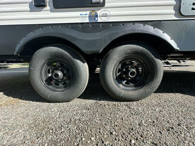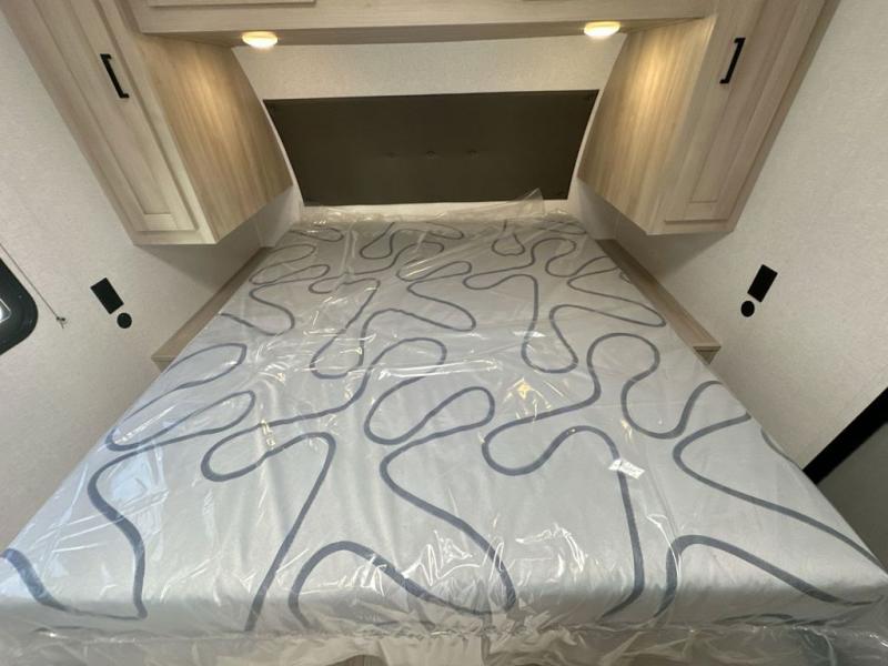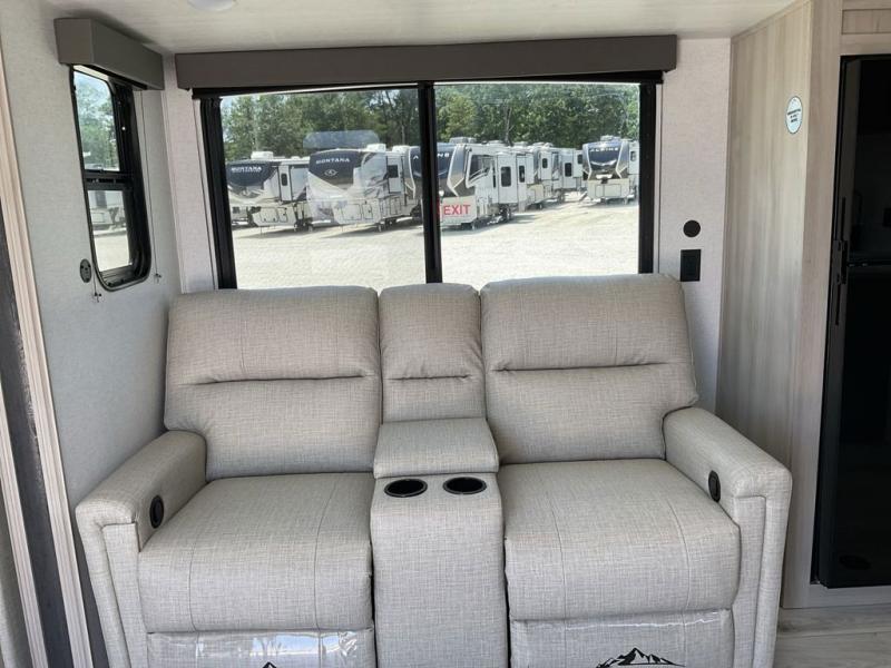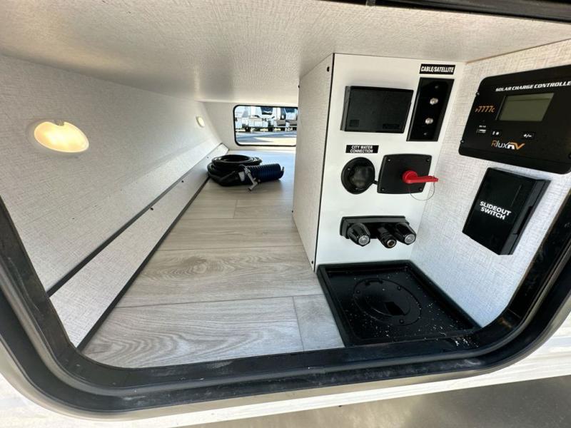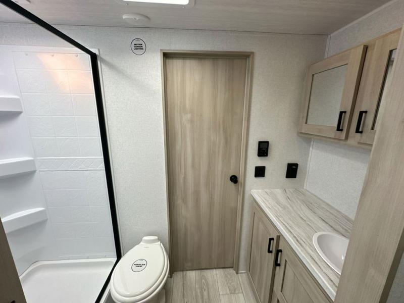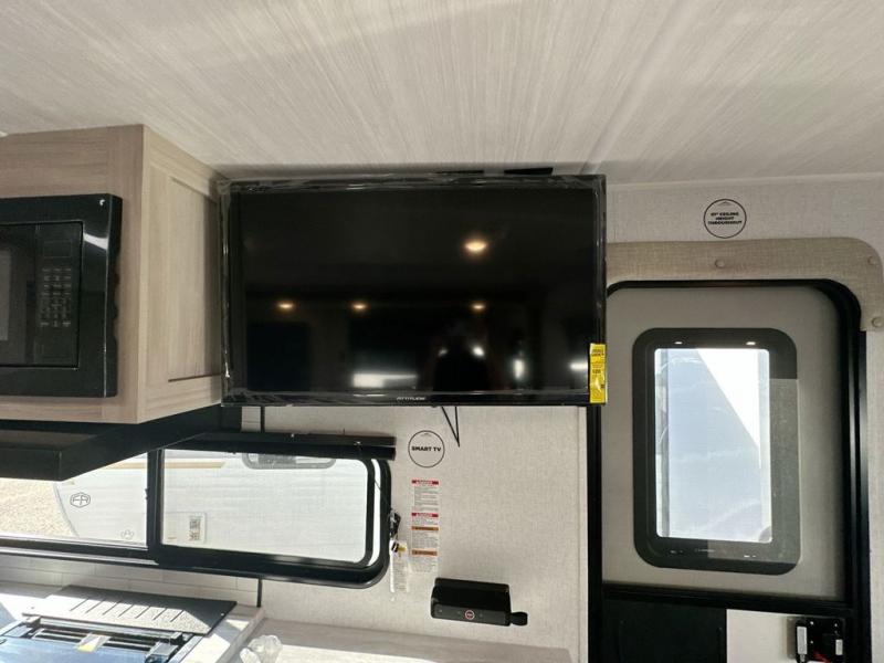 When you are wanting a little more interior space in your next travel trailer, take a look inside! This large slide out widens the main living space so you can easily make meals using full amenities without having to move for someone walking from the front bedroom and walk-through bath to the u-shaped dinette in the back. For sleeping, there is a king-size bed with storage on both sides at the very front of this unit giving you privacy from the rest, and even a private second entry/exit door from within the bedroom. You will find storage beneath the bed for larger items or extra blankets, plus a space saving sliding door. The U-shaped dinette and jack knife sofa offer comfortable seating as well as extra sleeping space for overnight guests, and the fireplace is just a nice feature to enjoy. On the outside, an 18' awning provides a large outdoor living area protected from the elements, and the oversized pass-through will house all of your exterior gear like lawn chairs, outdoor games and rugs, plus so much more!
