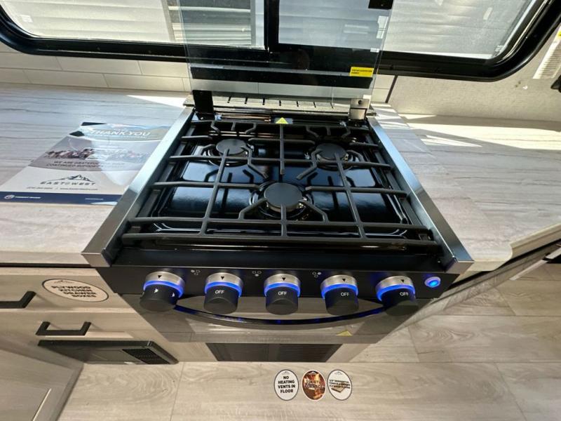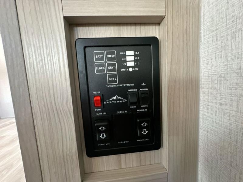 Each Della Terra travel trailer by EAST TO WEST is constructed with an enclosed and heated underbelly and enclosed holding tanks so you can camp all year long. There is also a power tongue jack with an LED light for easy set up and a power awning with LED lights you can rest under after you've unpacked. The Explore Comfort Package comes seamless pressed countertops, kitchen backsplash, window valance package with black night shades, and many more comforts. You will also appreciate the Adventure Outdoor Package with backup camera prep and solar prep, a tankless water heater, an RV grill quick disconnect, and a universal docking station with battery disconnect.