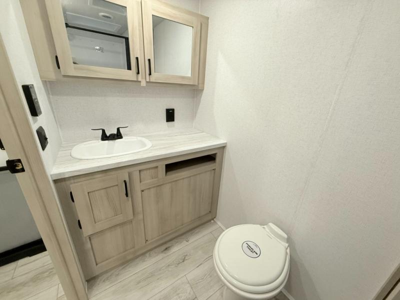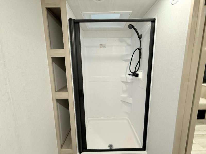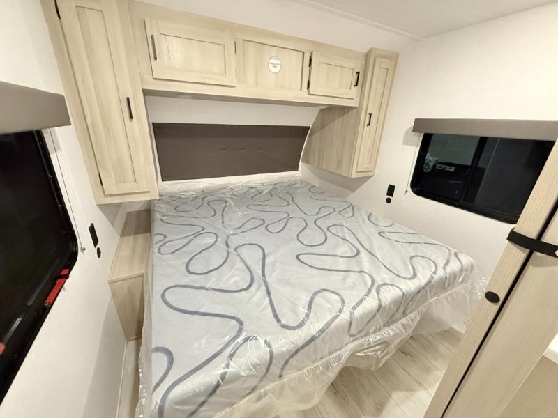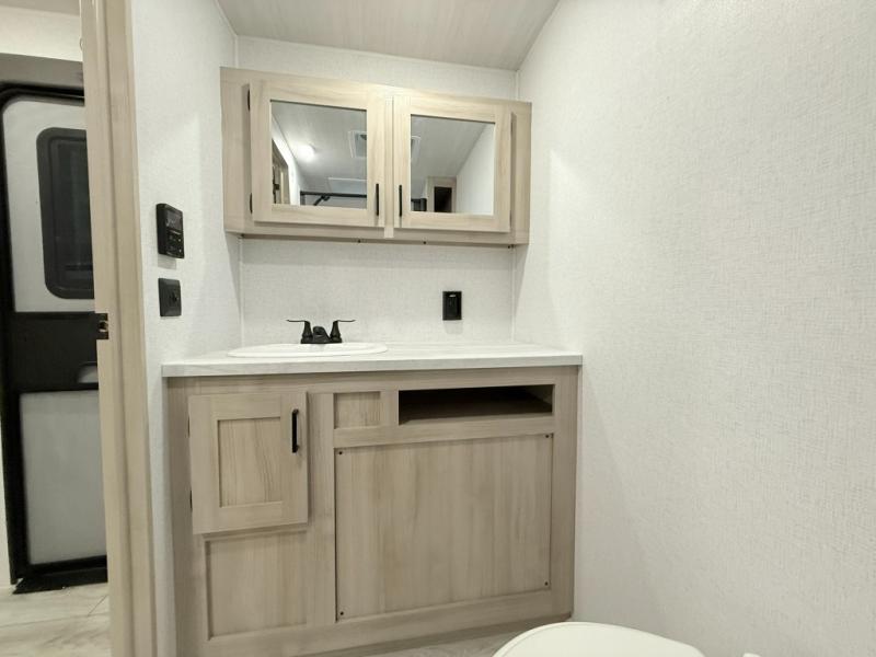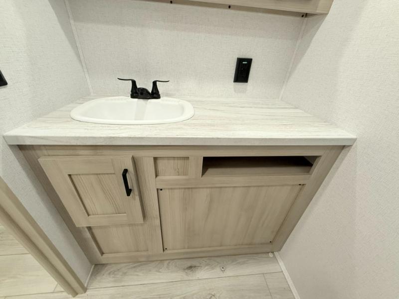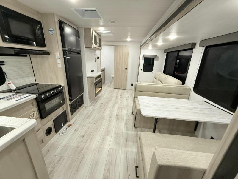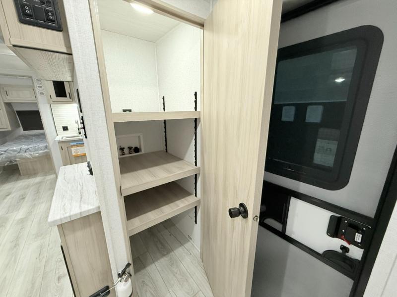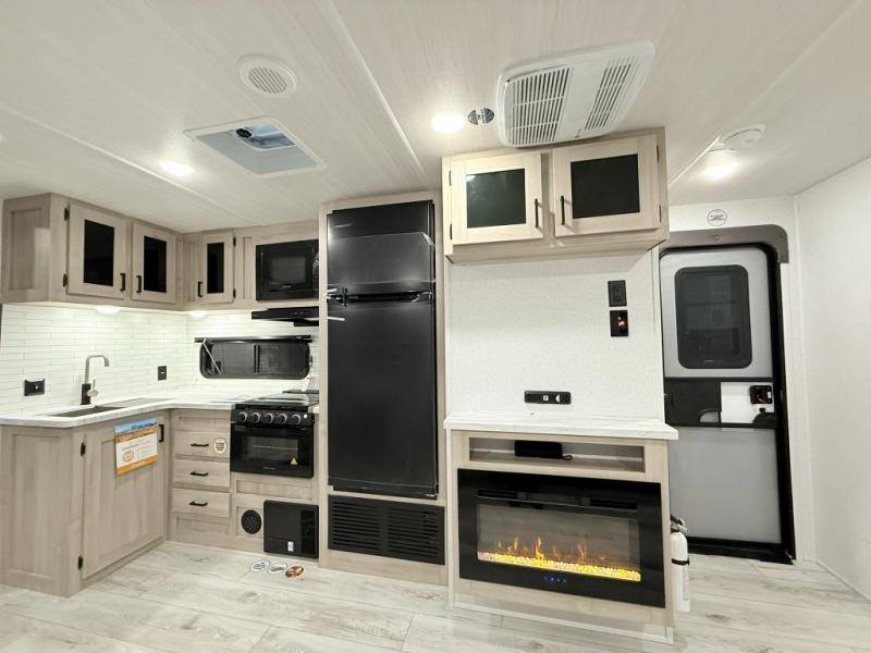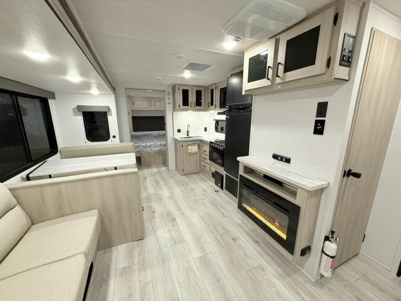 When you are wanting a little more interior space in your next travel trailer, take a look inside! This large slide out widens the center so you can easily make meals using full amenities without having to move for someone walking from the front private bedroom to the rear spacious bathroom. There is a king-size bed with storage on both sides, underneath and above, plus a space saving sliding door. The booth dinette and jiffy sofa offer comfortable seating as well as extra sleeping space for overnight guests. The fireplace is just a nice feature to enjoy, and the large pantry with washer/dryer prep gives you the option to make laundry day easier!