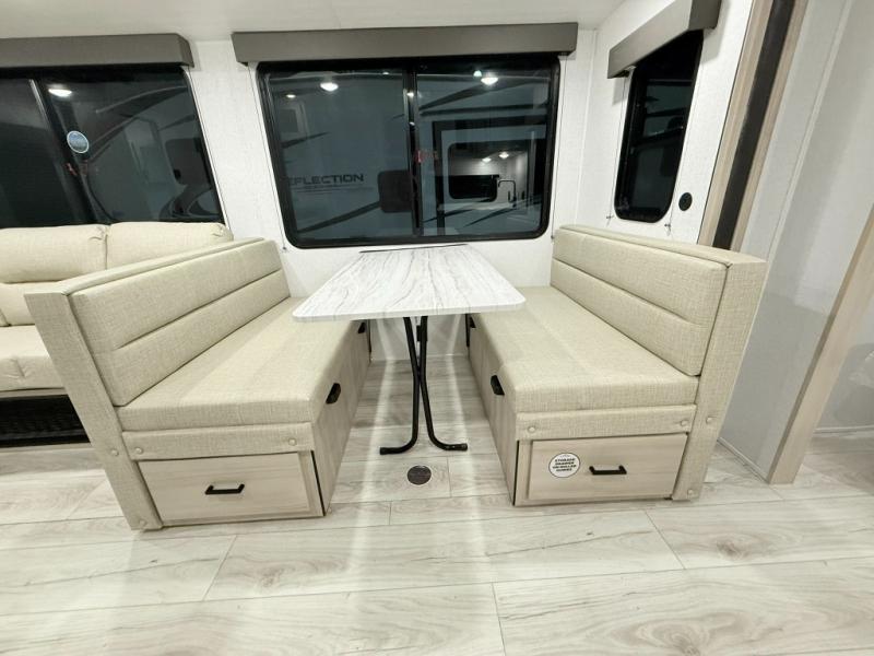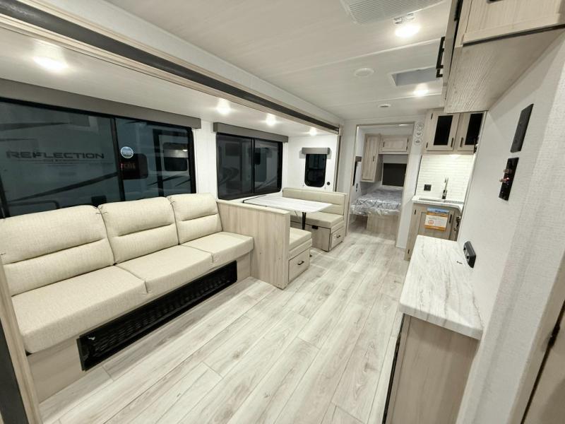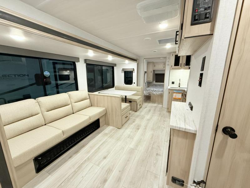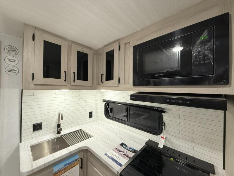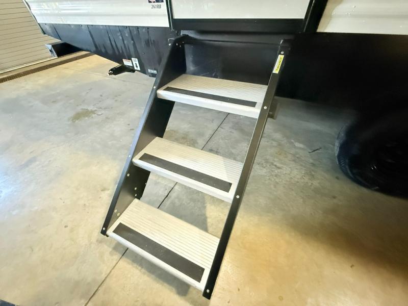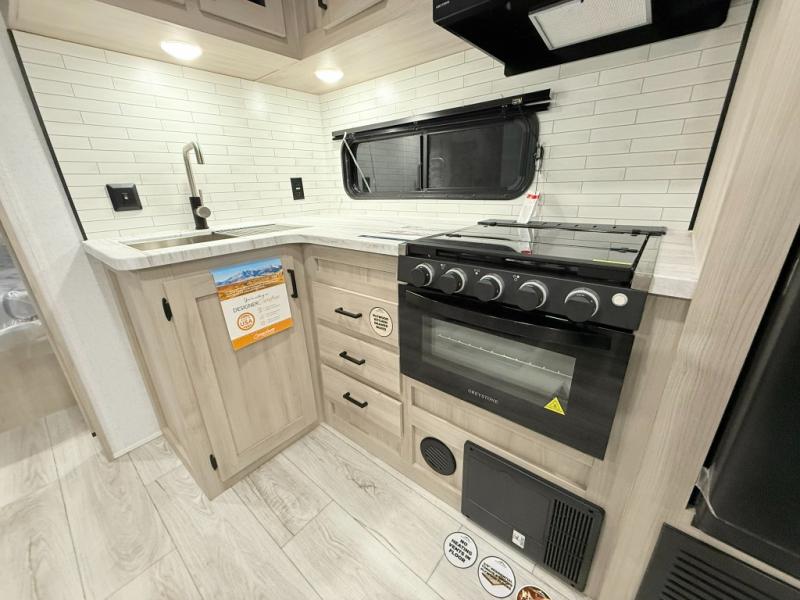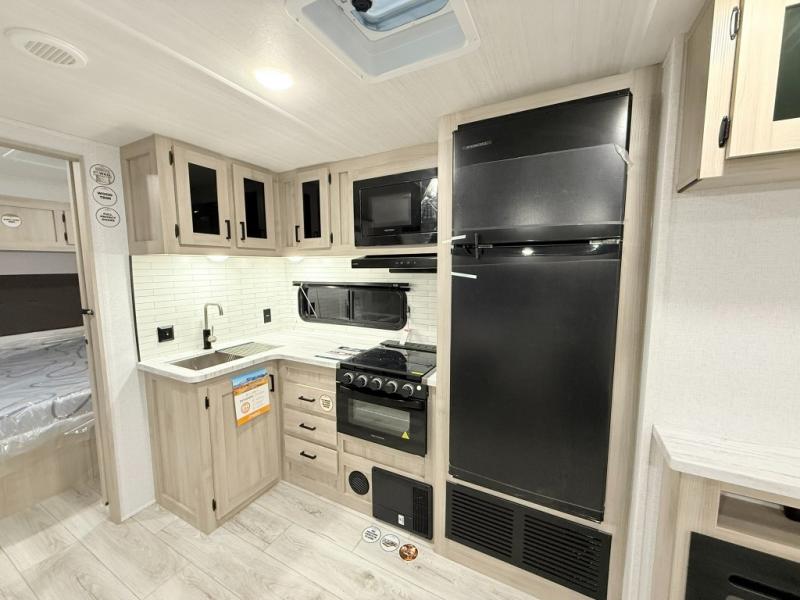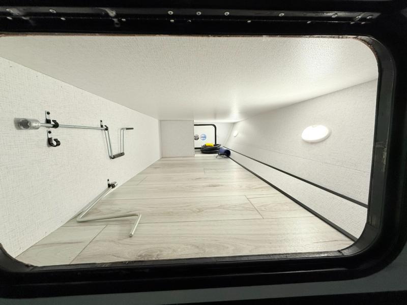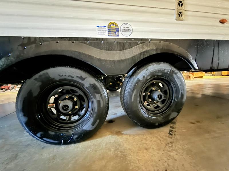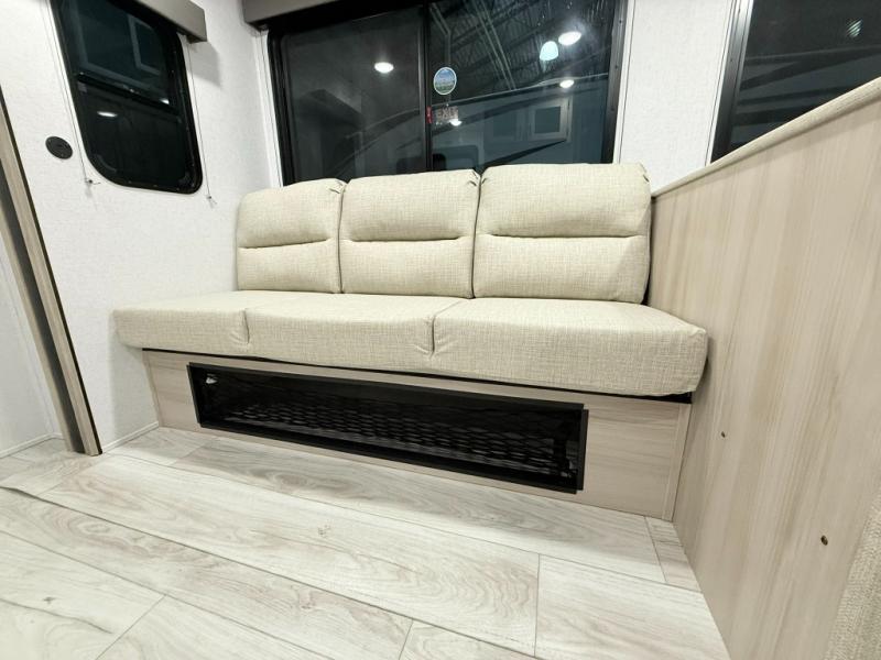 When you are wanting a little more interior space in your next travel trailer, take a look inside! This large slide out widens the center so you can easily make meals using full amenities without having to move for someone walking from the front private bedroom to the rear spacious bathroom. There is a king-size bed with storage on both sides, underneath and above, plus a space saving sliding door. The booth dinette and jiffy sofa offer comfortable seating as well as extra sleeping space for overnight guests. The fireplace is just a nice feature to enjoy, and the large pantry with washer/dryer prep gives you the option to make laundry day easier!