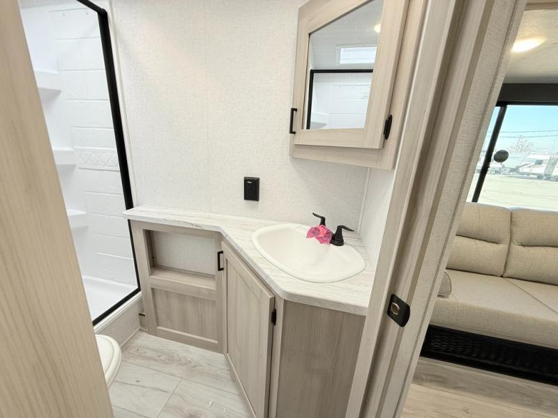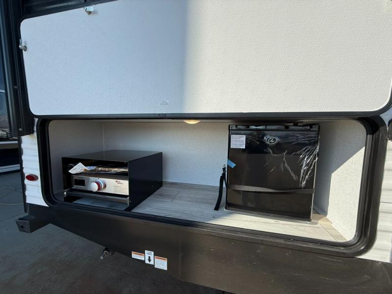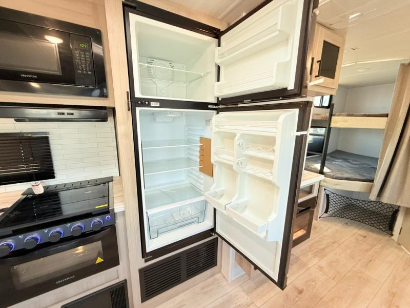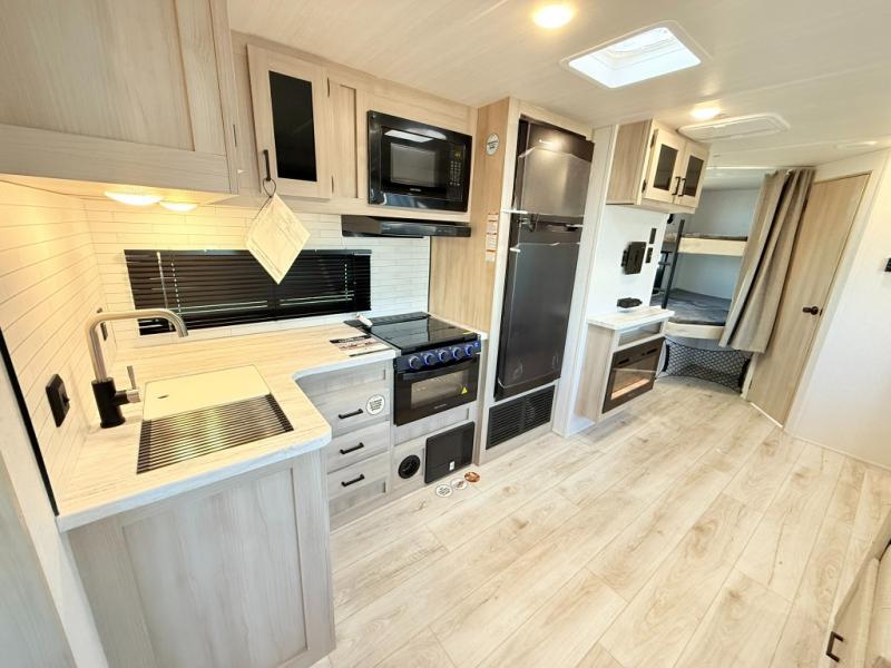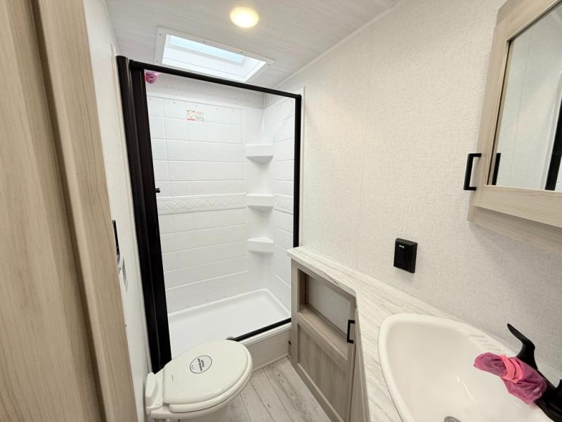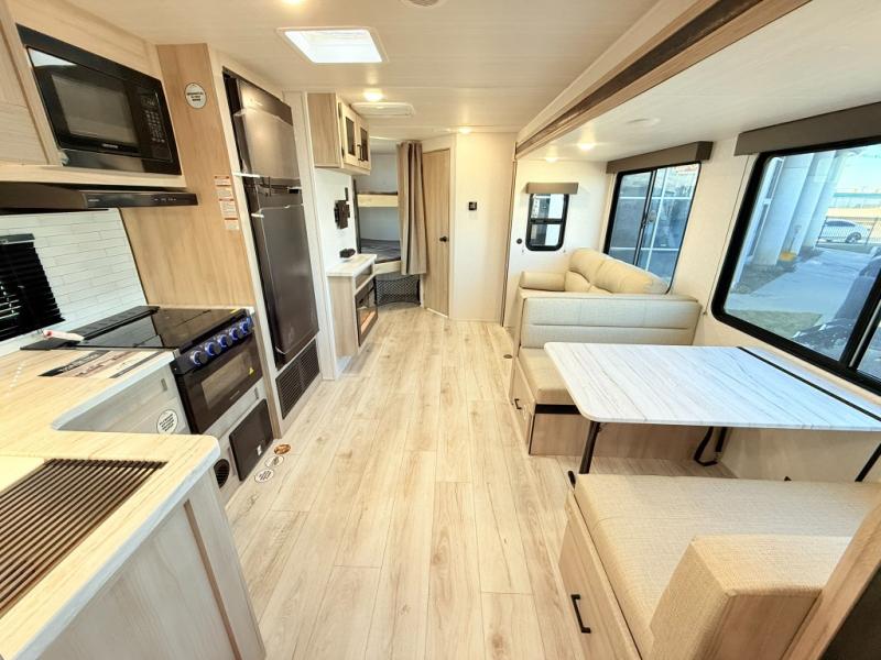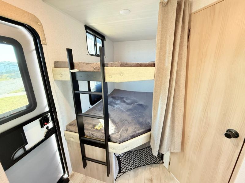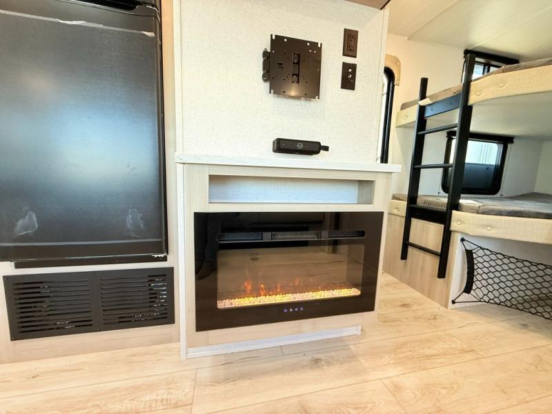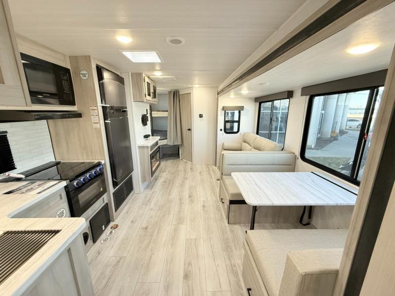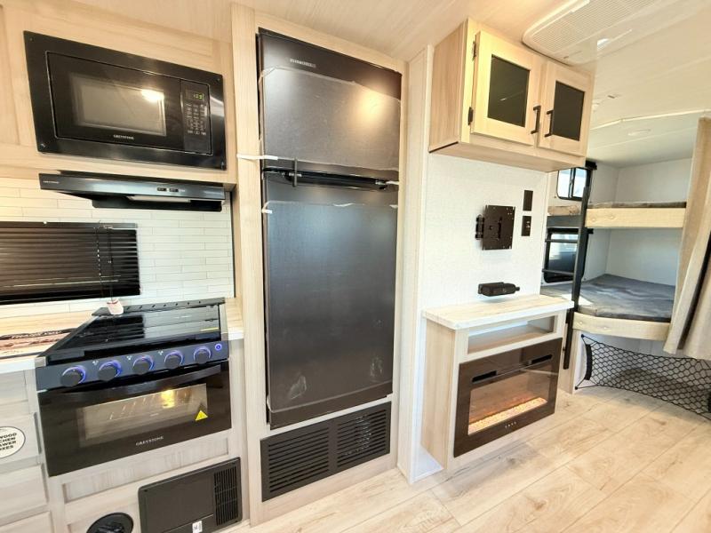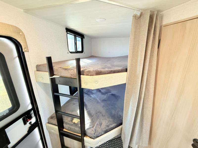 Pack up the whole gang since this unit features sleeping for eight to ten! As you enter you will find easy access to the rear corner bath including a 30" x 36" shower, toilet, and vanity with a sink, plus medicine cabinet just steps away. The slide creates an open and spacious feel for relaxing and dining inside. Here you will find a jiffy sofa and booth dinette with both featuring underneath storage. You will sleep like a king in the front private bedroom with a king bed and a space saving sliding door. Your family and or friends will love sleeping on the double-size bunks and furniture once easily setup for nighttime. This unit also features pass-through storage outside, more exterior storage beneath the double bed bunks, and an outside kitchen with a refrigerator and pull-out griddle.