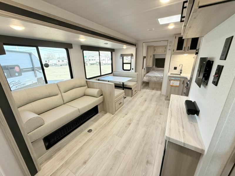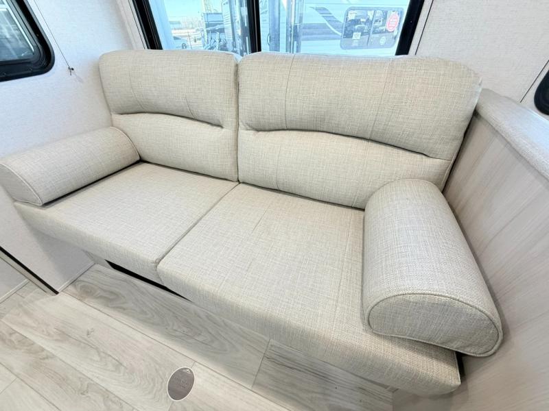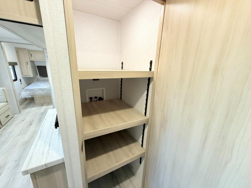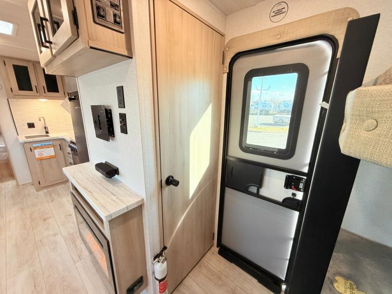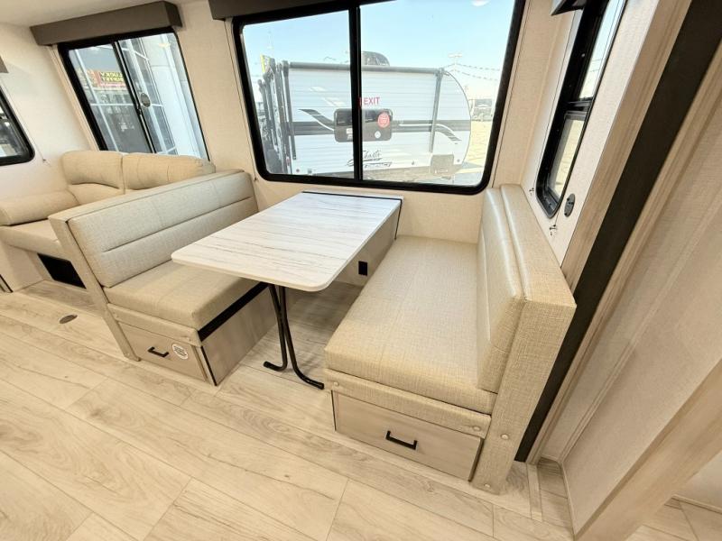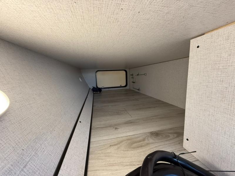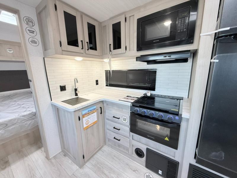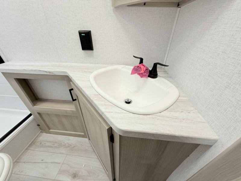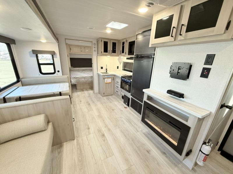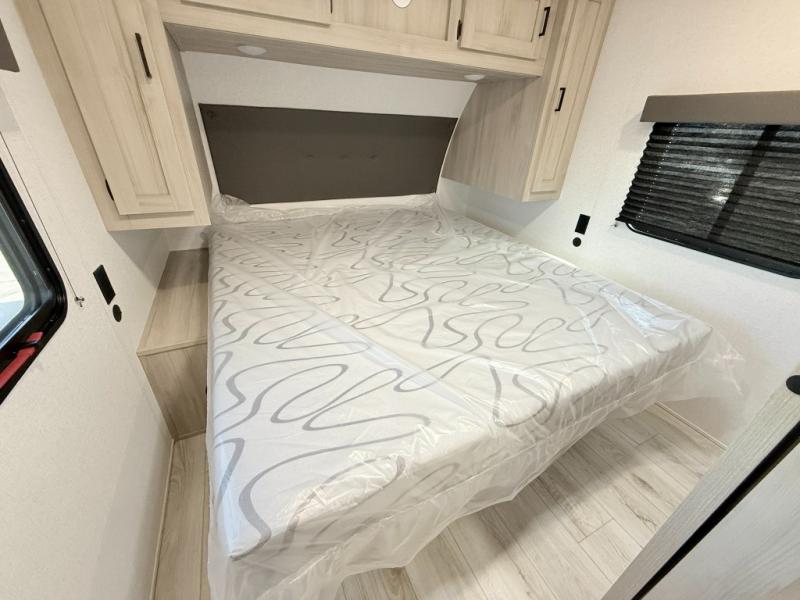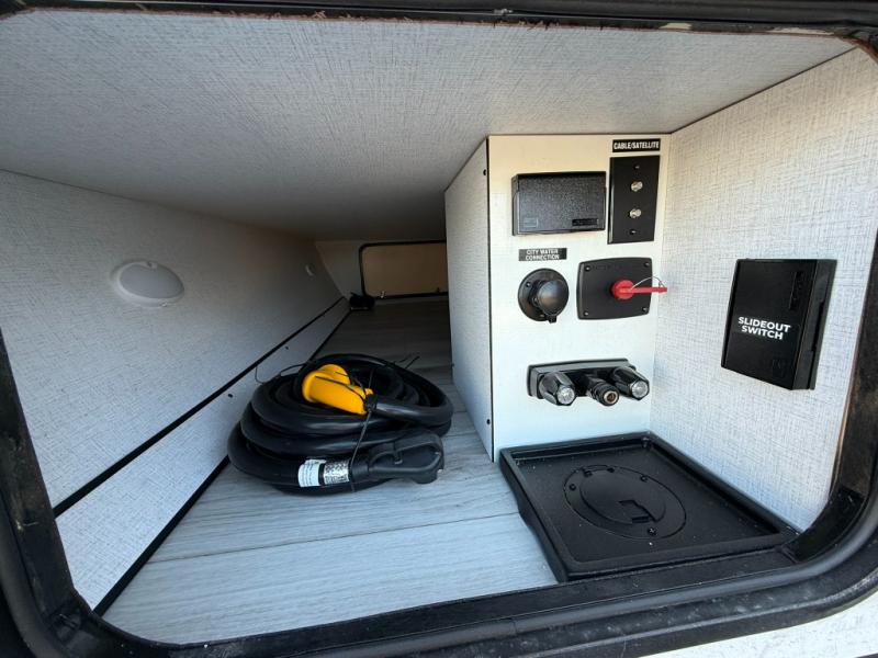 Pack up the whole gang since this unit features sleeping for eight to ten! As you enter you will find easy access to the rear corner bath including a 30" x 36" shower, toilet, and vanity with a sink, plus medicine cabinet just steps away. The slide creates an open and spacious feel for relaxing and dining inside. Here you will find a jiffy sofa and booth dinette with both featuring underneath storage. You will sleep like a king in the front private bedroom with a king bed and a space saving sliding door. Your family and or friends will love sleeping on the double-size bunks and furniture once easily setup for nighttime. This unit also features pass-through storage outside, more exterior storage beneath the double bed bunks, and an outside kitchen with a refrigerator and pull-out griddle.