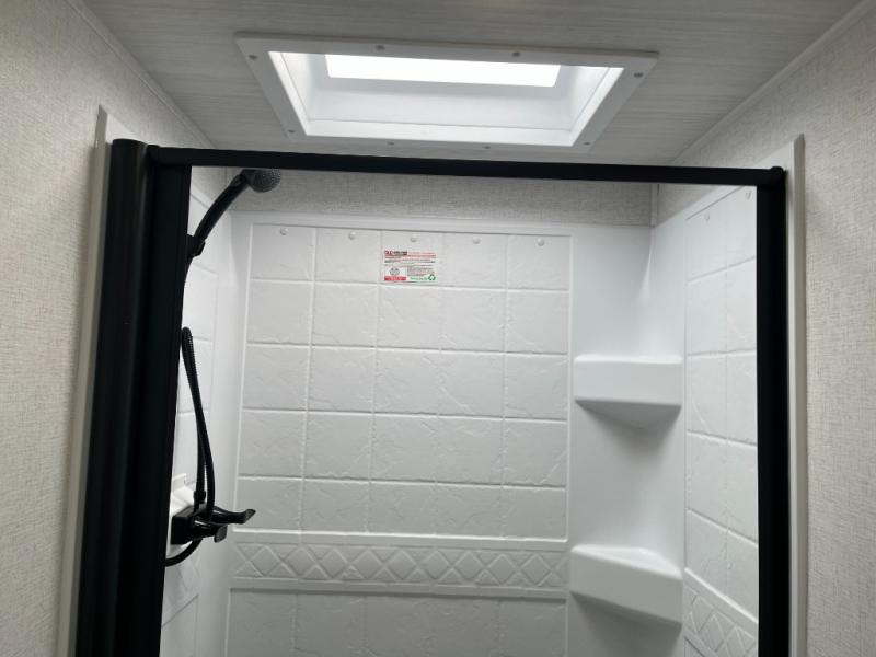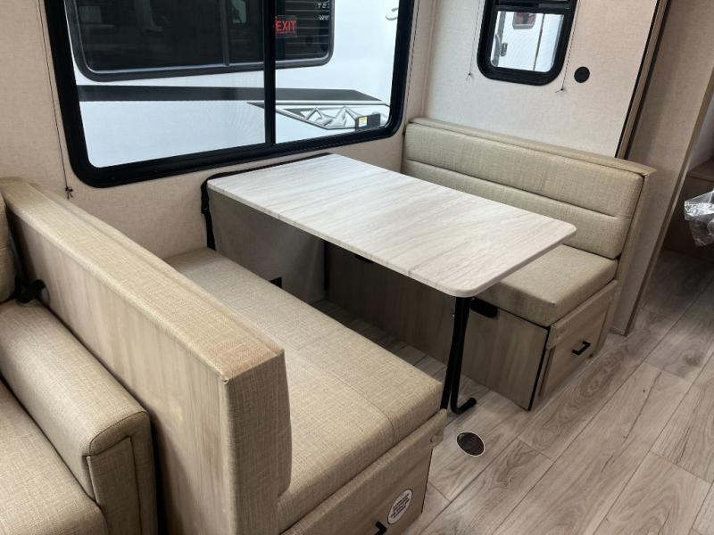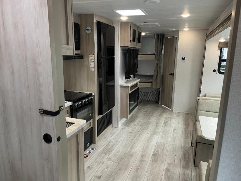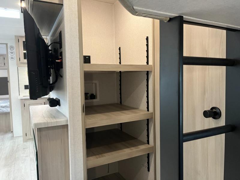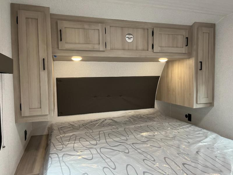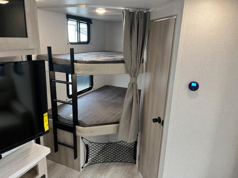 Pack up the whole gang since this unit features sleeping for eight to ten! As you enter you will find easy access to the rear corner bath including a 30" x 36" shower, toilet, and vanity with a sink, plus medicine cabinet just steps away. The slide creates an open and spacious feel for relaxing and dining inside. Here you will find a jiffy sofa and booth dinette with both featuring underneath storage. You will sleep like a king in the front private bedroom with a king bed and a space saving sliding door. Your family and or friends will love sleeping on the double-size bunks and furniture once easily setup for nighttime. This unit also features pass-through storage outside, more exterior storage beneath the double bed bunks, and an outside kitchen with a refrigerator and pull-out griddle.
