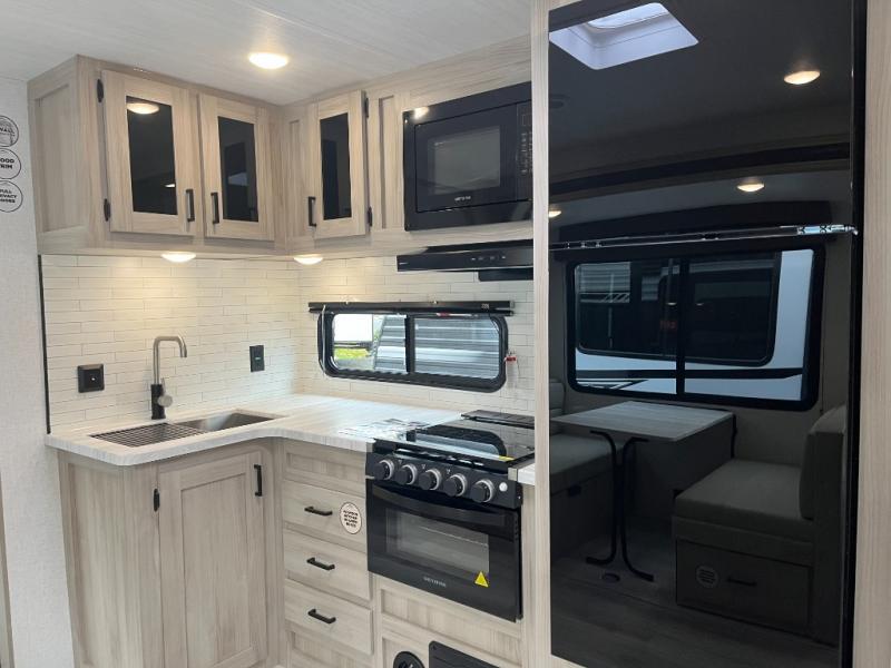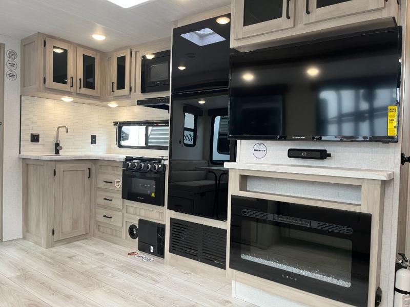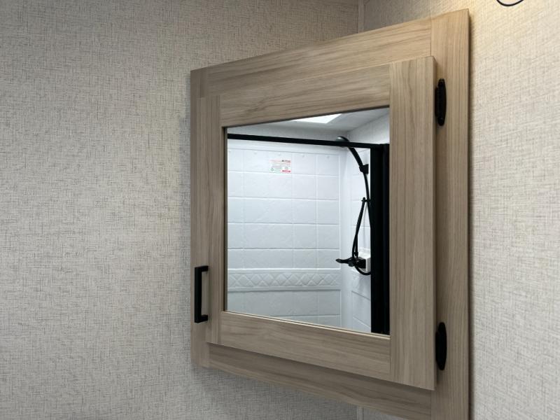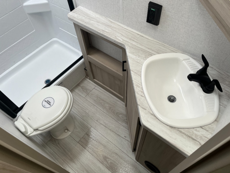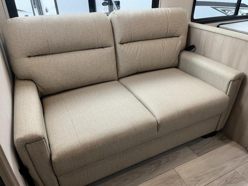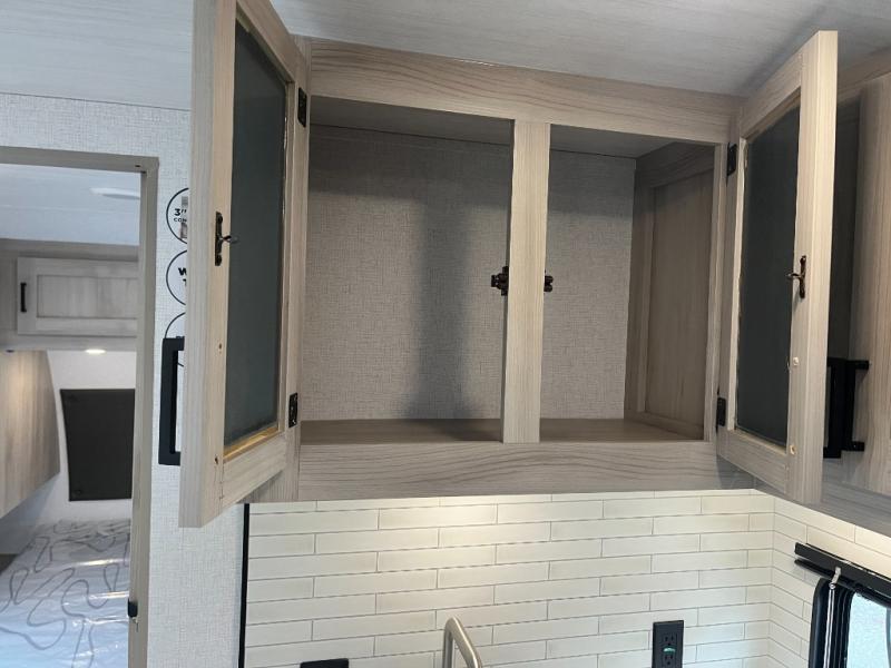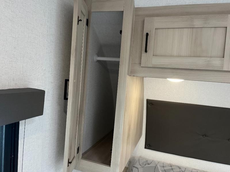 Pack up the whole gang since this unit features sleeping for eight to ten! As you enter you will find easy access to the rear corner bath including a 30" x 36" shower, toilet, and vanity with a sink, plus medicine cabinet just steps away. The slide creates an open and spacious feel for relaxing and dining inside. Here you will find a jiffy sofa and booth dinette with both featuring underneath storage. You will sleep like a king in the front private bedroom with a king bed and a space saving sliding door. Your family and or friends will love sleeping on the double-size bunks and furniture once easily setup for nighttime. This unit also features pass-through storage outside, more exterior storage beneath the double bed bunks, and an outside kitchen with a refrigerator and pull-out griddle.