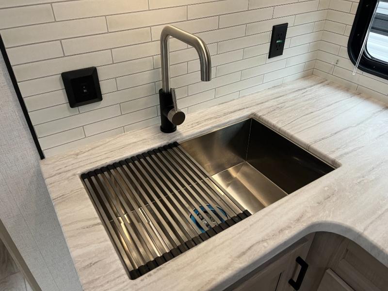 Each Della Terra travel trailer by EAST TO WEST is constructed with an enclosed and heated underbelly and enclosed holding tanks so you can camp all year long. There is also a power tongue jack with an LED light for easy set up and a power awning with LED lights you can rest under after you've unpacked. The Explore Comfort Package comes seamless pressed countertops, kitchen backsplash, window valance package with black night shades, and many more comforts. You will also appreciate the Adventure Outdoor Package with backup camera prep and solar prep, a tankless water heater, an RV grill quick disconnect, and a universal docking station with battery disconnect.