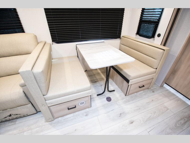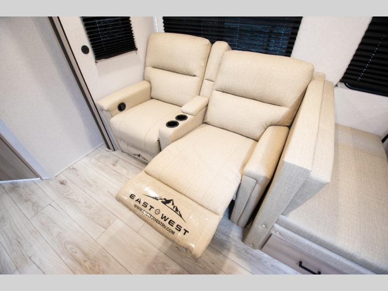 Each Della Terra travel trailer by EAST TO WEST is constructed with an enclosed and heated underbelly and enclosed holding tanks so you can camp all year long. There is also a power tongue jack with an LED light for easy set up and a power awning with LED lights you can rest under after you've unpacked. The Explore Comfort Package comes seamless pressed countertops, kitchen backsplash, window valance package with black night shades, and many more comforts. You will also appreciate the Adventure Outdoor Package with backup camera prep and solar prep, a tankless water heater, an RV grill quick disconnect, and a universal docking station with battery disconnect.