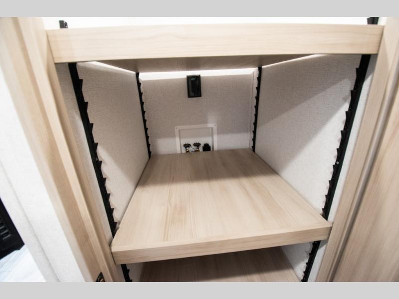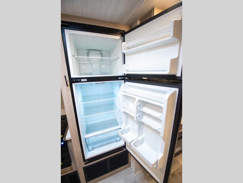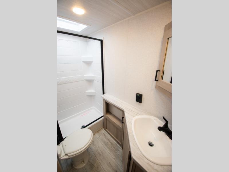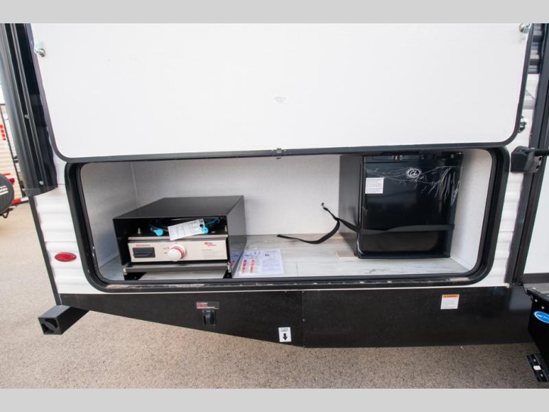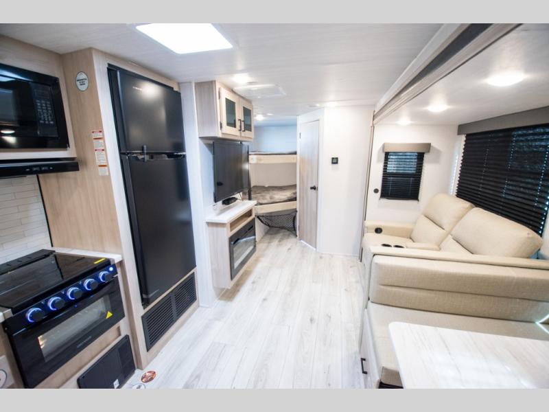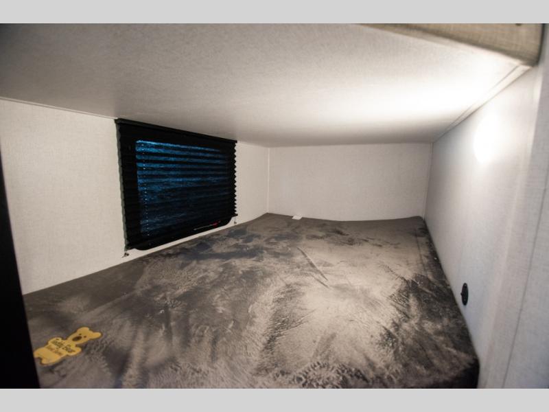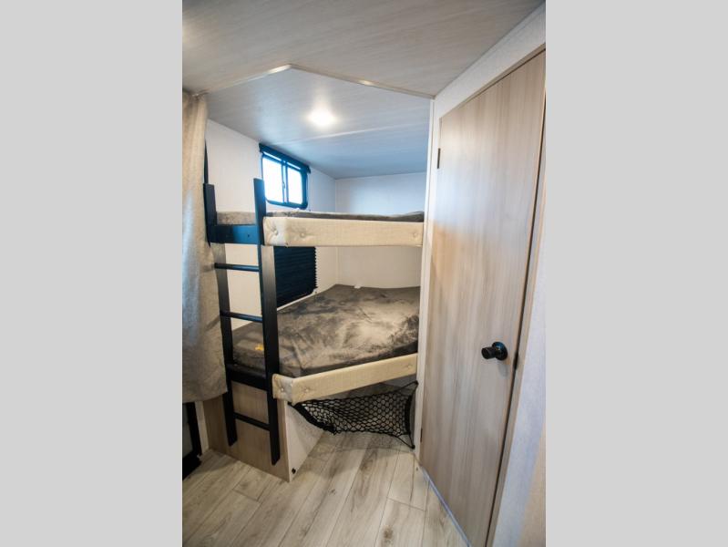 Pack up the whole gang since this unit features sleeping for eight to ten! As you enter you will find easy access to the rear corner bath including a 30" x 36" shower, toilet, and vanity with a sink, plus medicine cabinet just steps away. The slide creates an open and spacious feel for relaxing and dining inside. Here you will find a jiffy sofa and booth dinette with both featuring underneath storage. You will sleep like a king in the front private bedroom with a king bed and a space saving sliding door. Your family and or friends will love sleeping on the double-size bunks and furniture once easily setup for nighttime. This unit also features pass-through storage outside, more exterior storage beneath the double bed bunks, and an outside kitchen with a refrigerator and pull-out griddle.