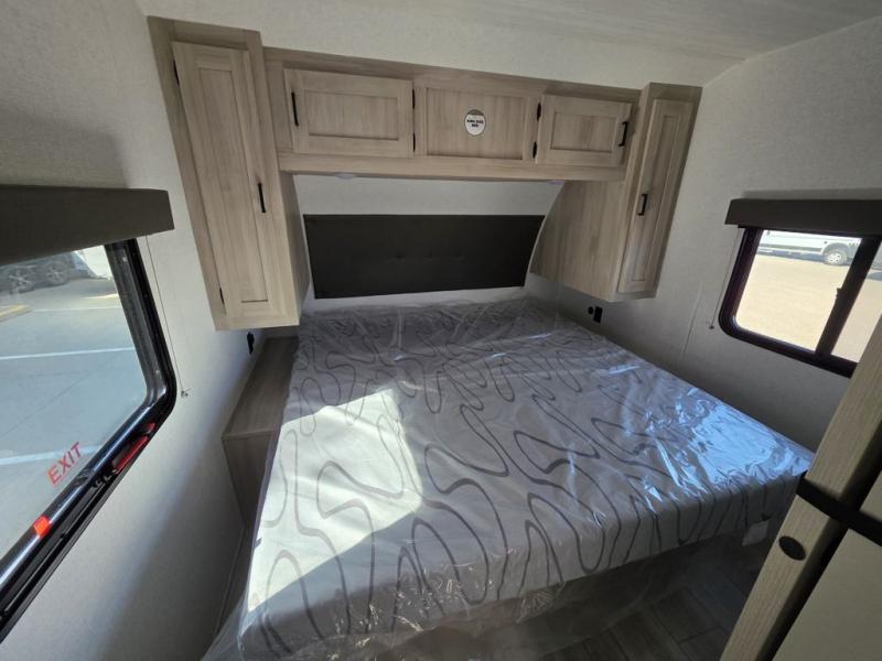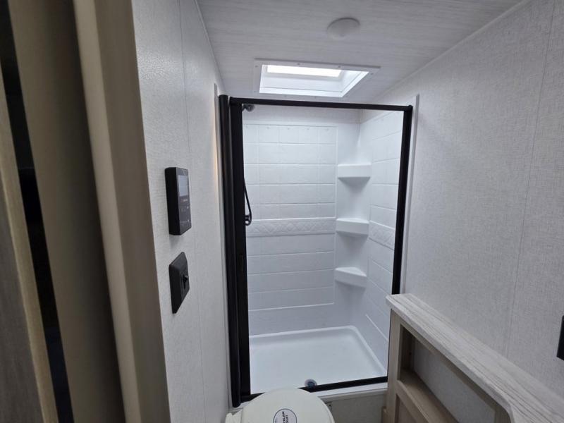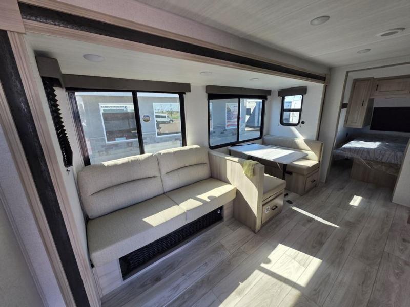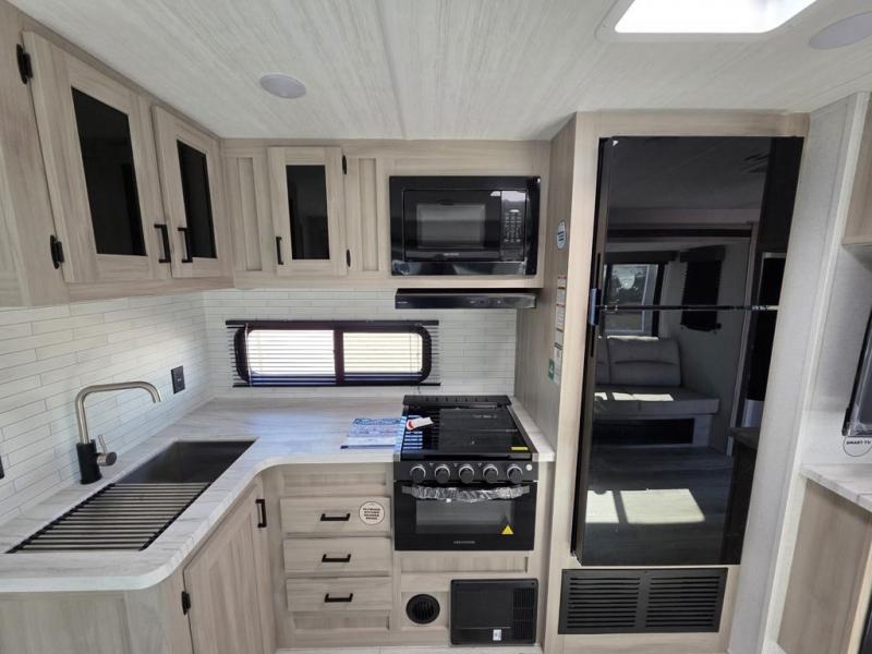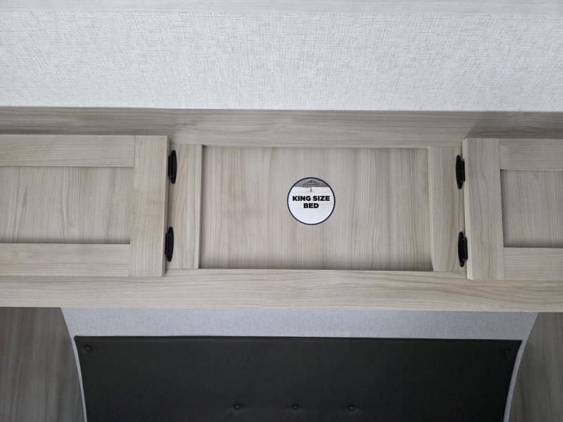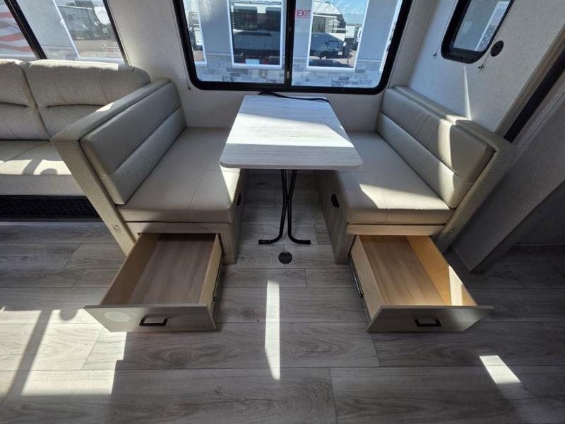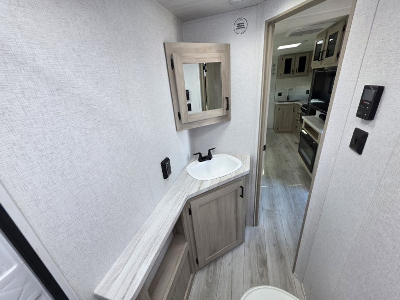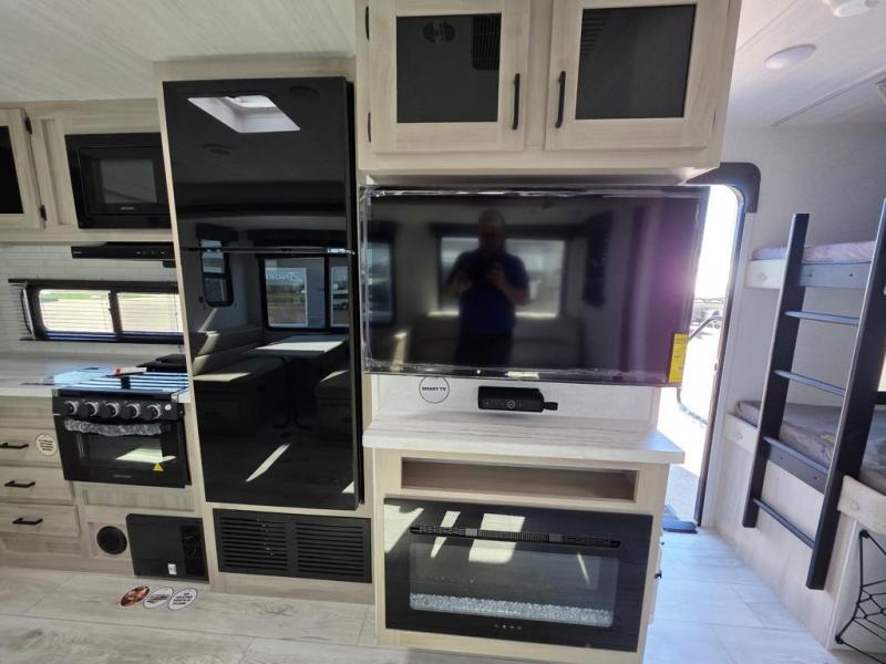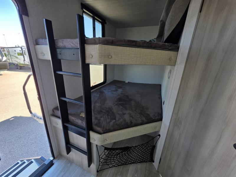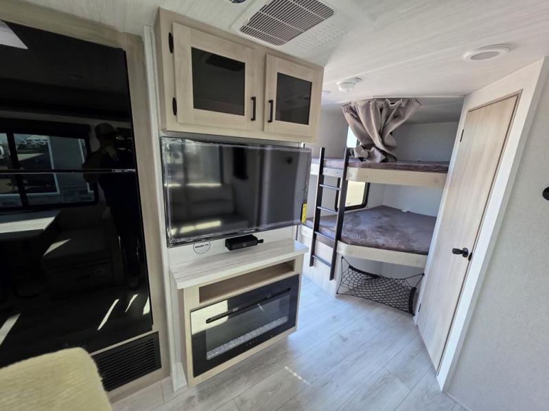 Pack up the whole gang since this unit features sleeping for eight to ten! As you enter you will find easy access to the rear corner bath including a 30" x 36" shower, toilet, and vanity with a sink, plus medicine cabinet just steps away. The slide creates an open and spacious feel for relaxing and dining inside. Here you will find a jiffy sofa and booth dinette with both featuring underneath storage. You will sleep like a king in the front private bedroom with a king bed and a space saving sliding door. Your family and or friends will love sleeping on the double-size bunks and furniture once easily setup for nighttime. This unit also features pass-through storage outside, more exterior storage beneath the double bed bunks, and an outside kitchen with a refrigerator and pull-out griddle.